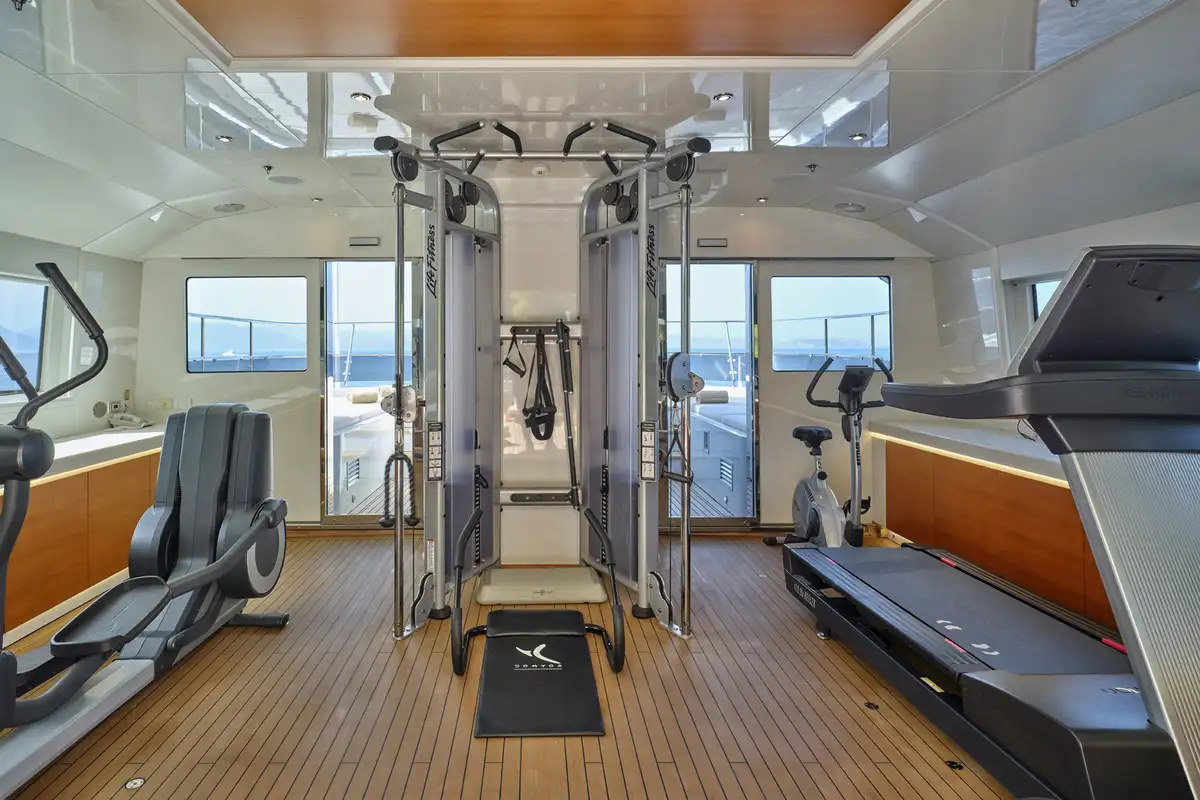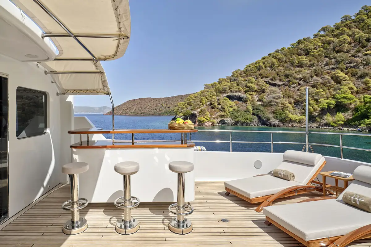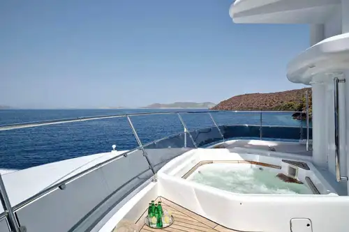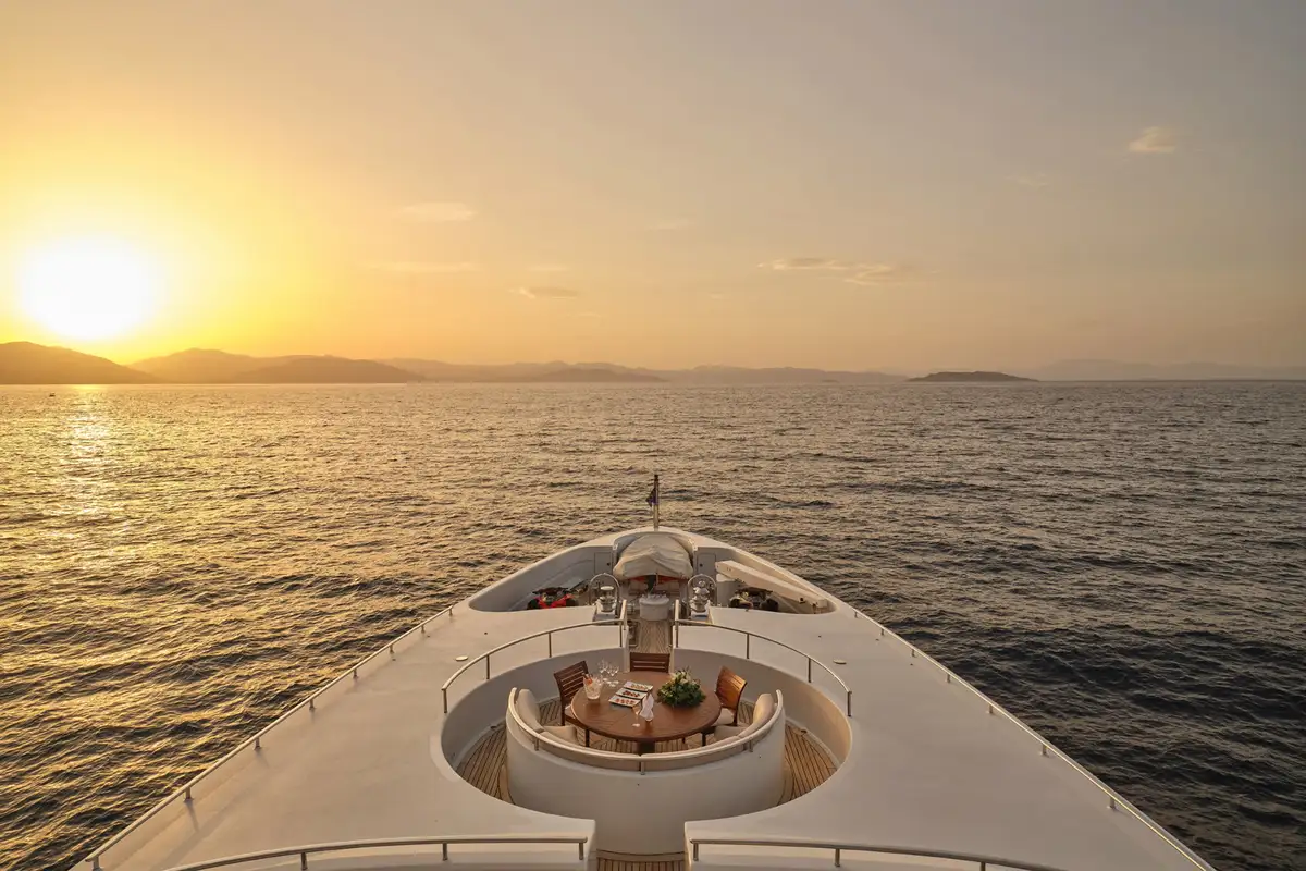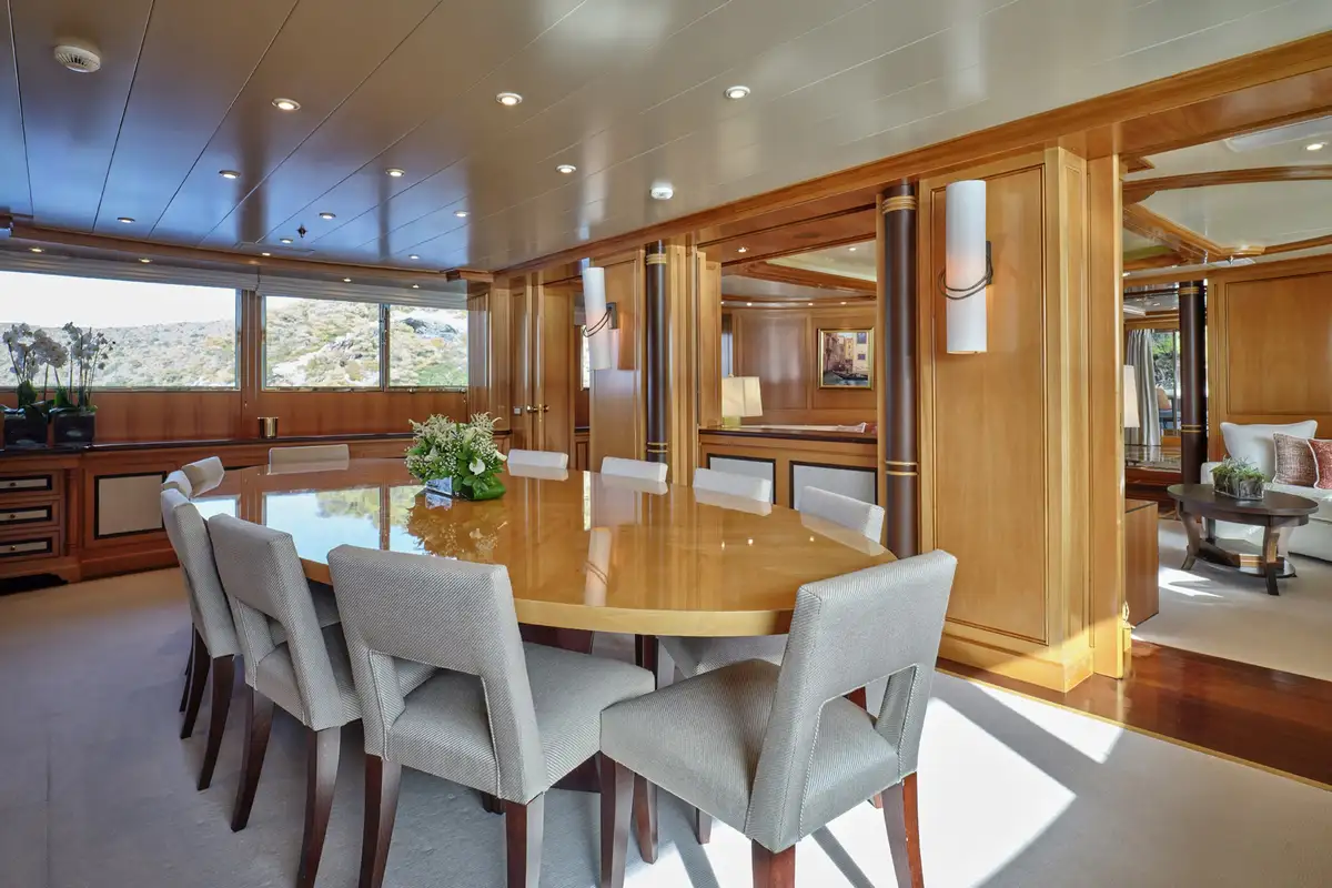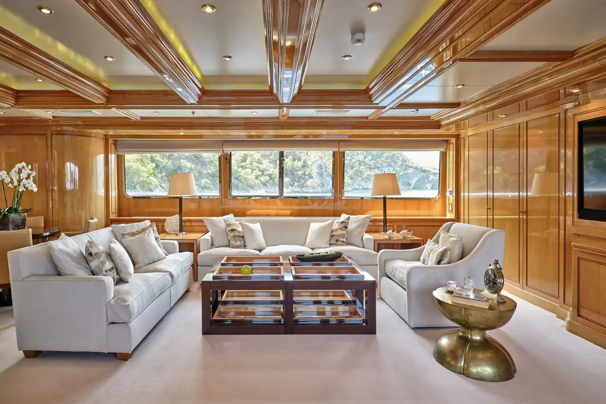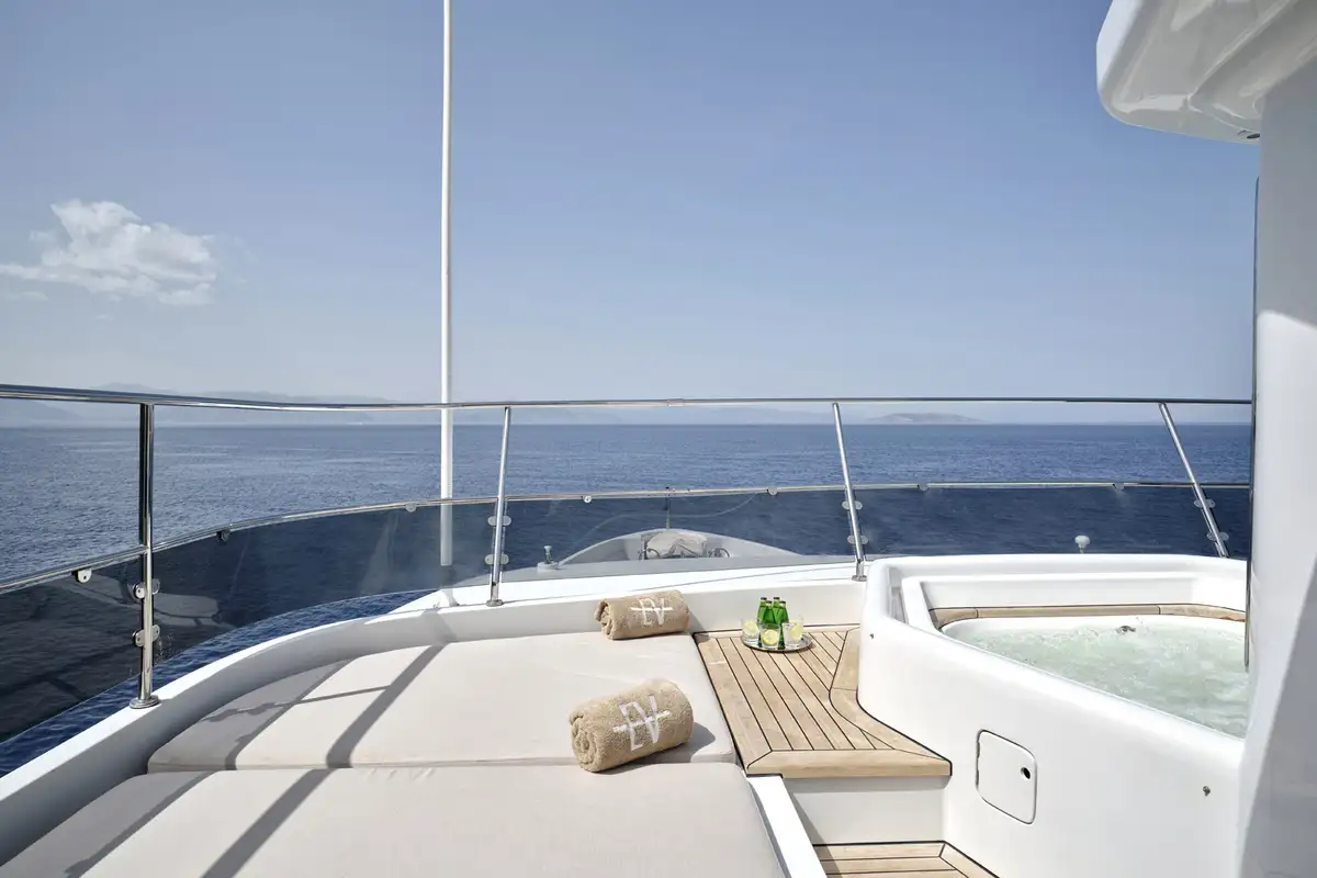 She is a family-friendly yacht with a full-beam master suite forward on the main deck with his and hers bathrooms sharing a bath and a VIP suite on the upper deck with elevated views. Two double cabins and two twin cabins on the lower deck complete her accommodation.