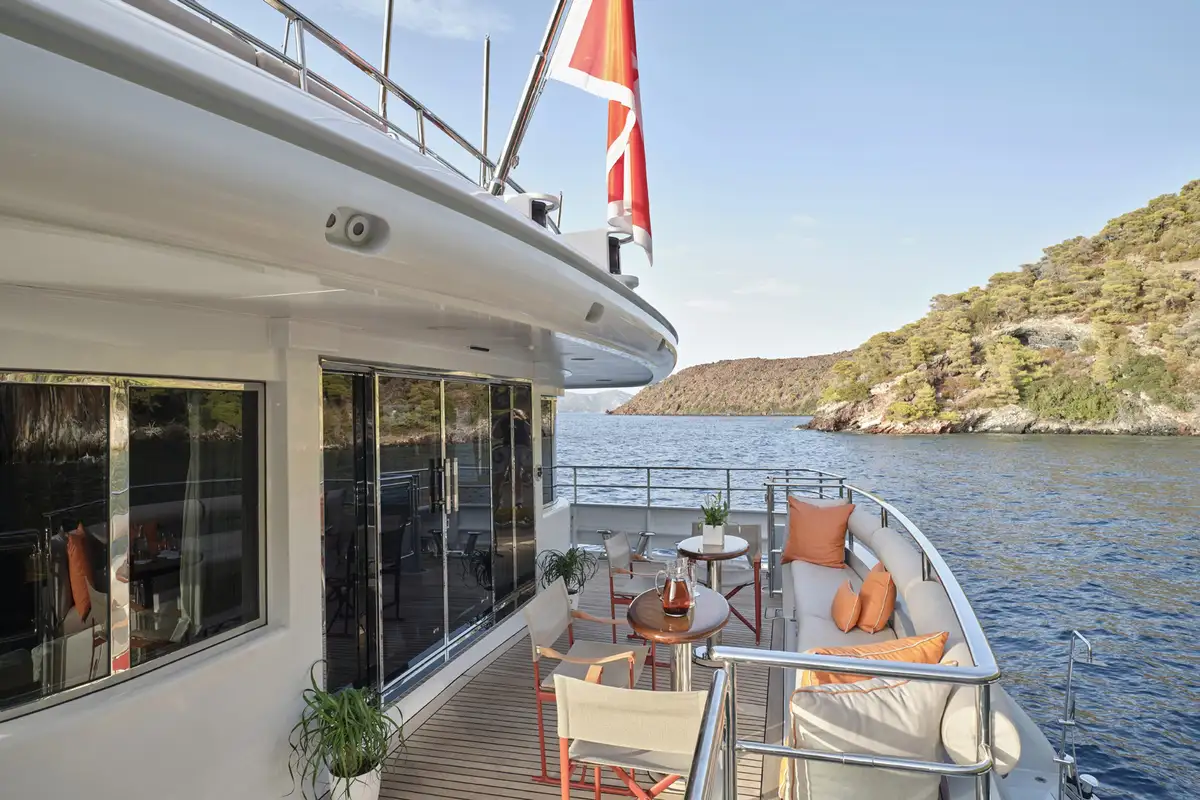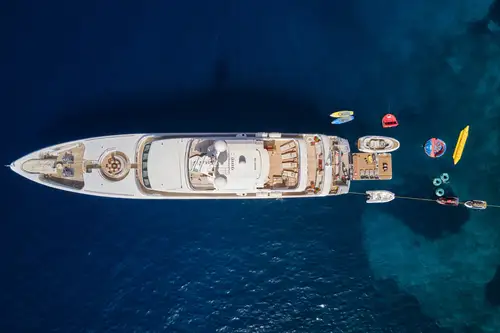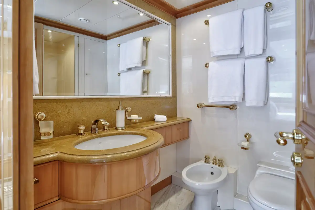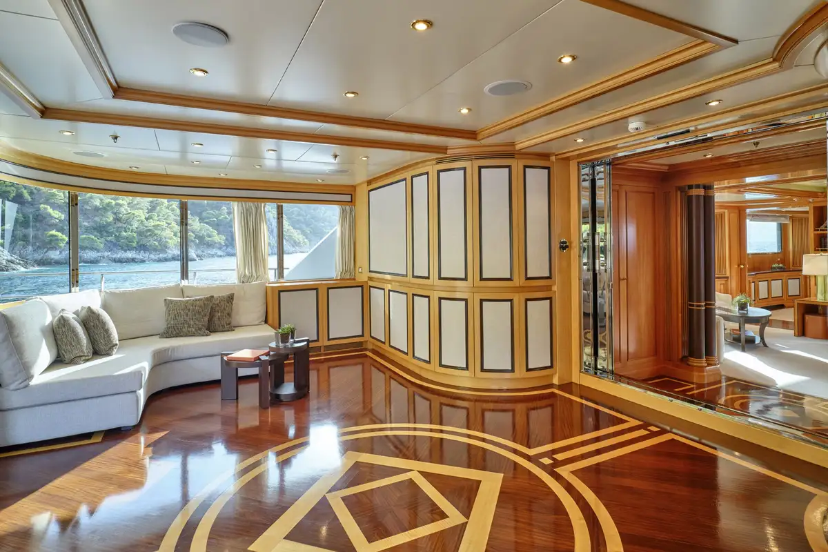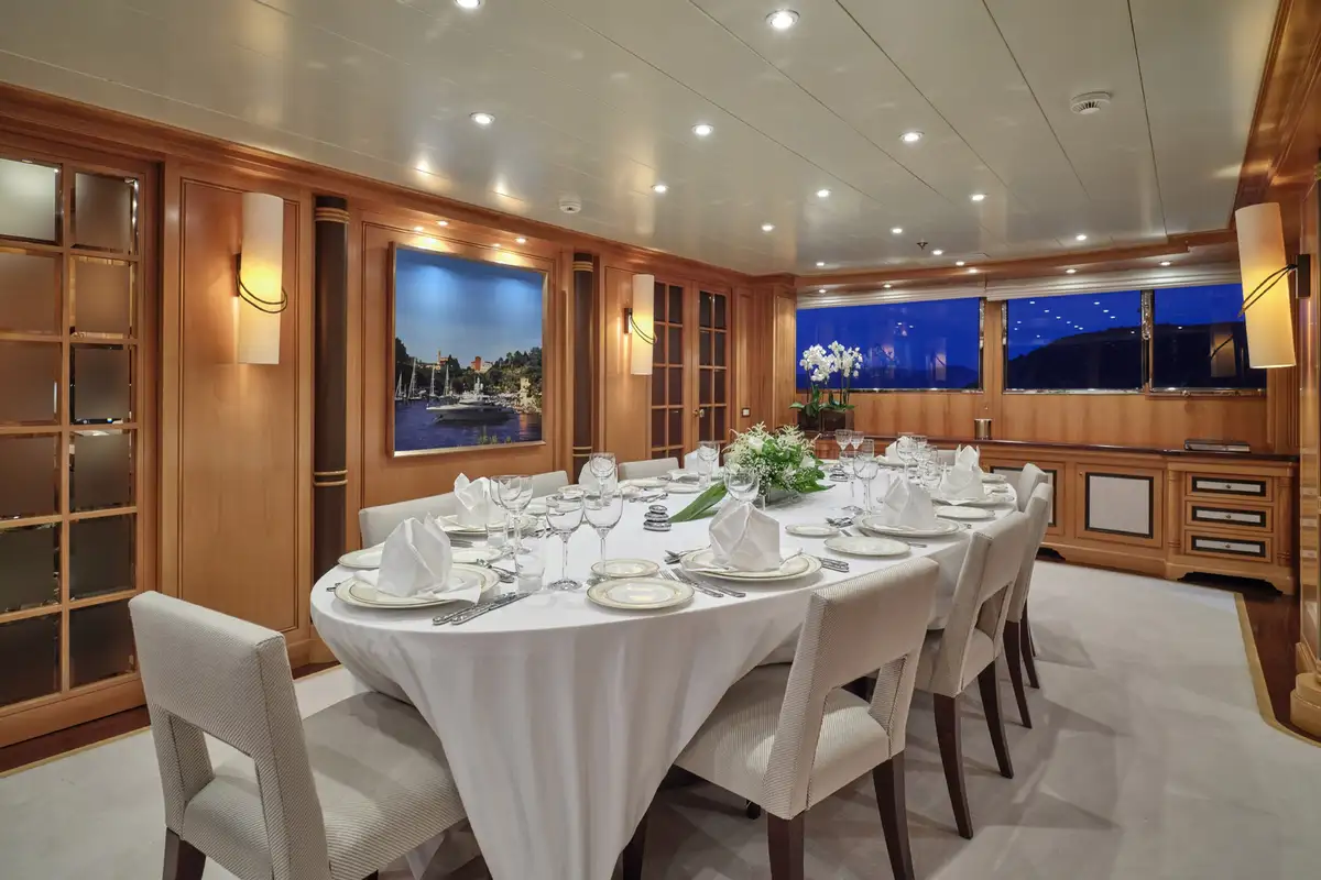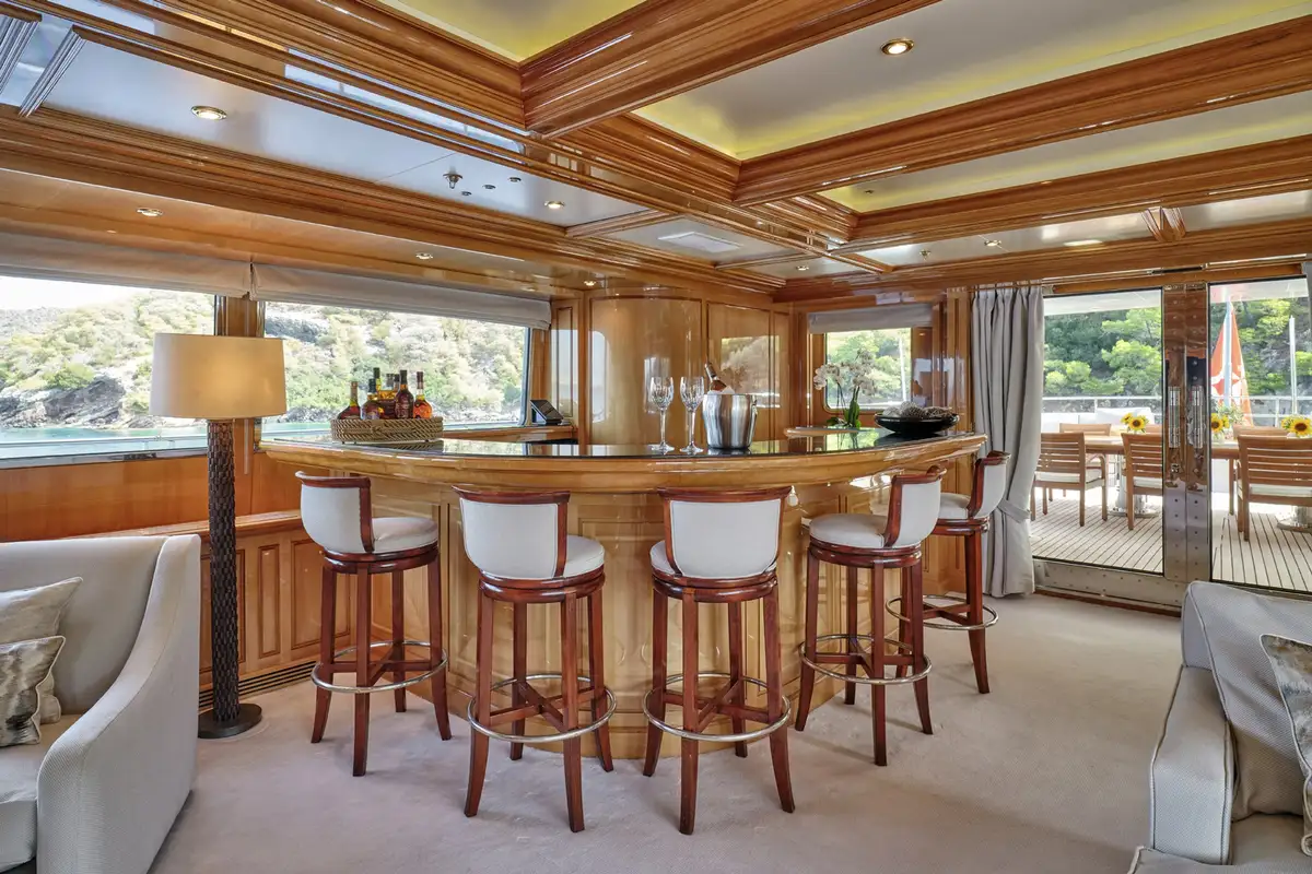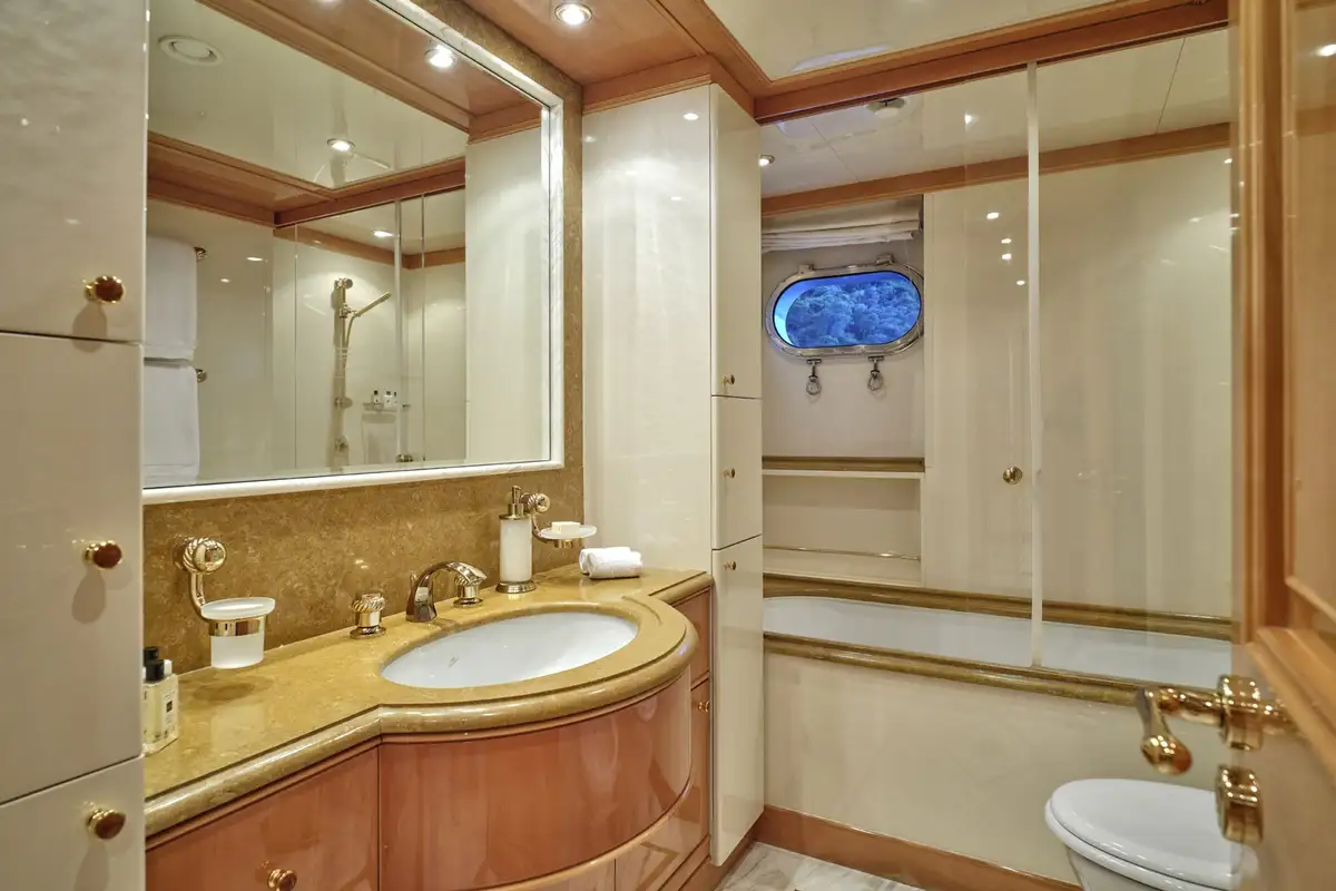 She is a family-friendly yacht with a full-beam master suite forward on the main deck with his and hers bathrooms sharing a bath and a VIP suite on the upper deck with elevated views. Two double cabins and two twin cabins on the lower deck complete her accommodation.