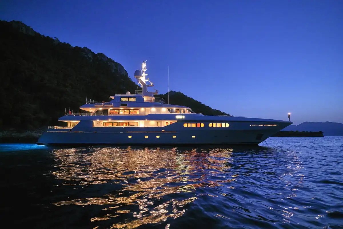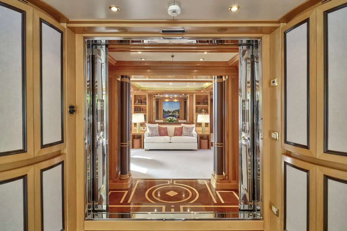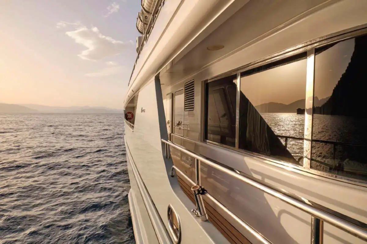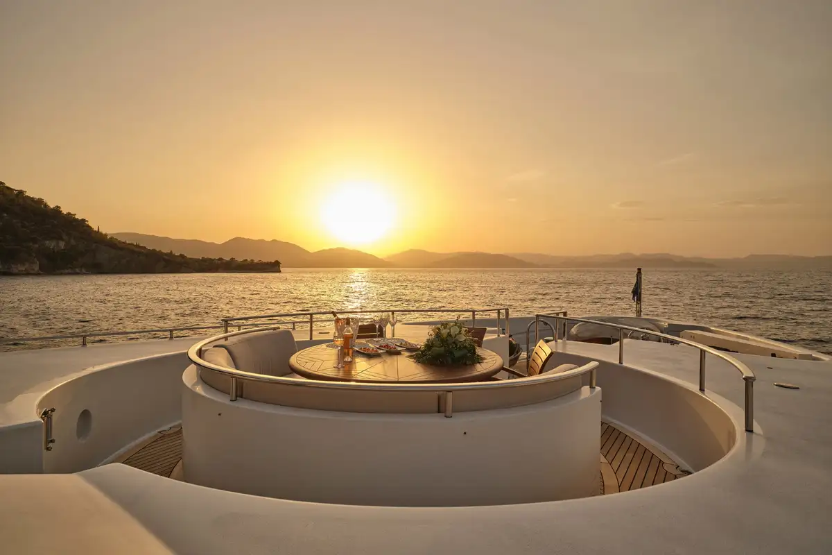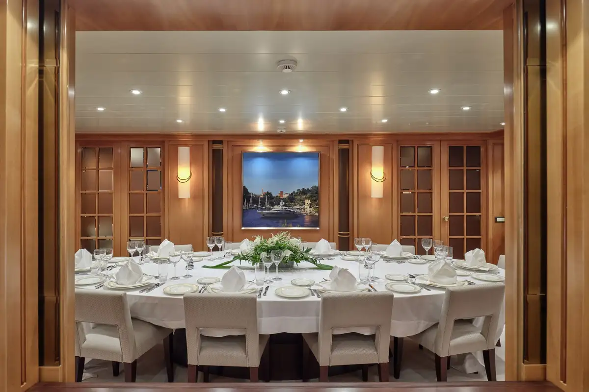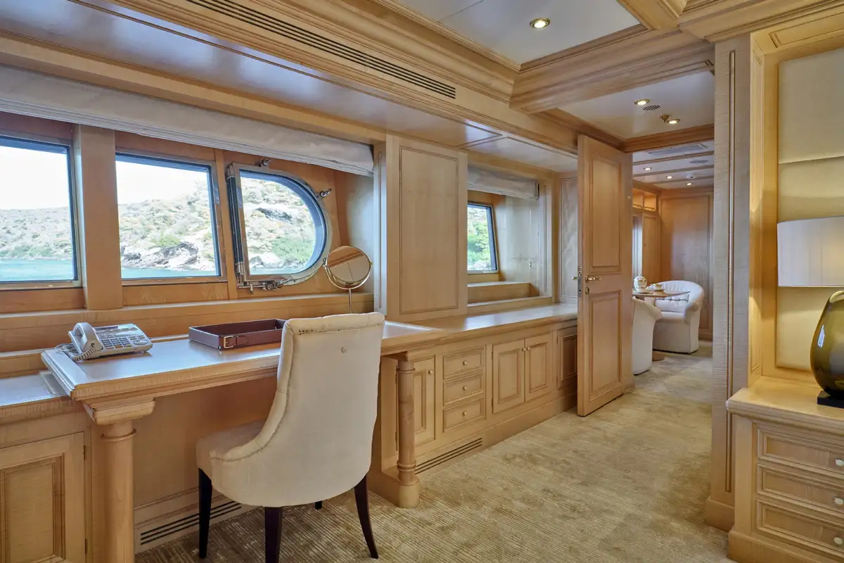 She is a family-friendly yacht with a full-beam master suite forward on the main deck with his and hers bathrooms sharing a bath and a VIP suite on the upper deck with elevated views. Two double cabins and two twin cabins on the lower deck complete her accommodation.