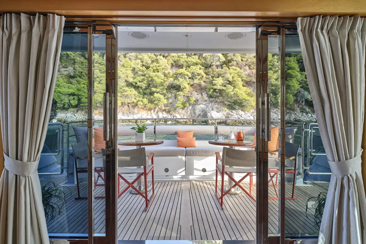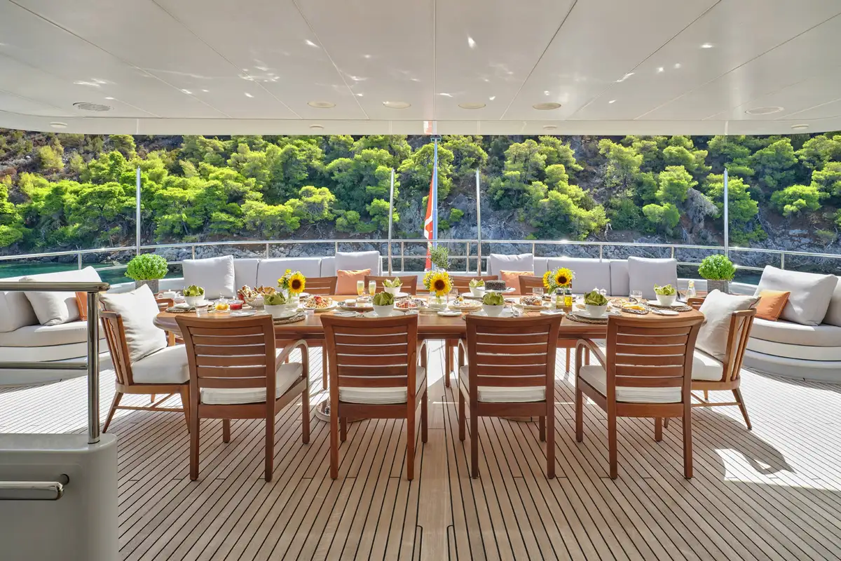 The main deck aft is an excellent reception space where arriving guests can be greeted by the crew and relax with a drink on the banquette seating aft. Steps lead down to the swim platform where the crew will help guests get wet and wild on the jetskis, SeaBob, underwater scooters and plenty of tow toys.