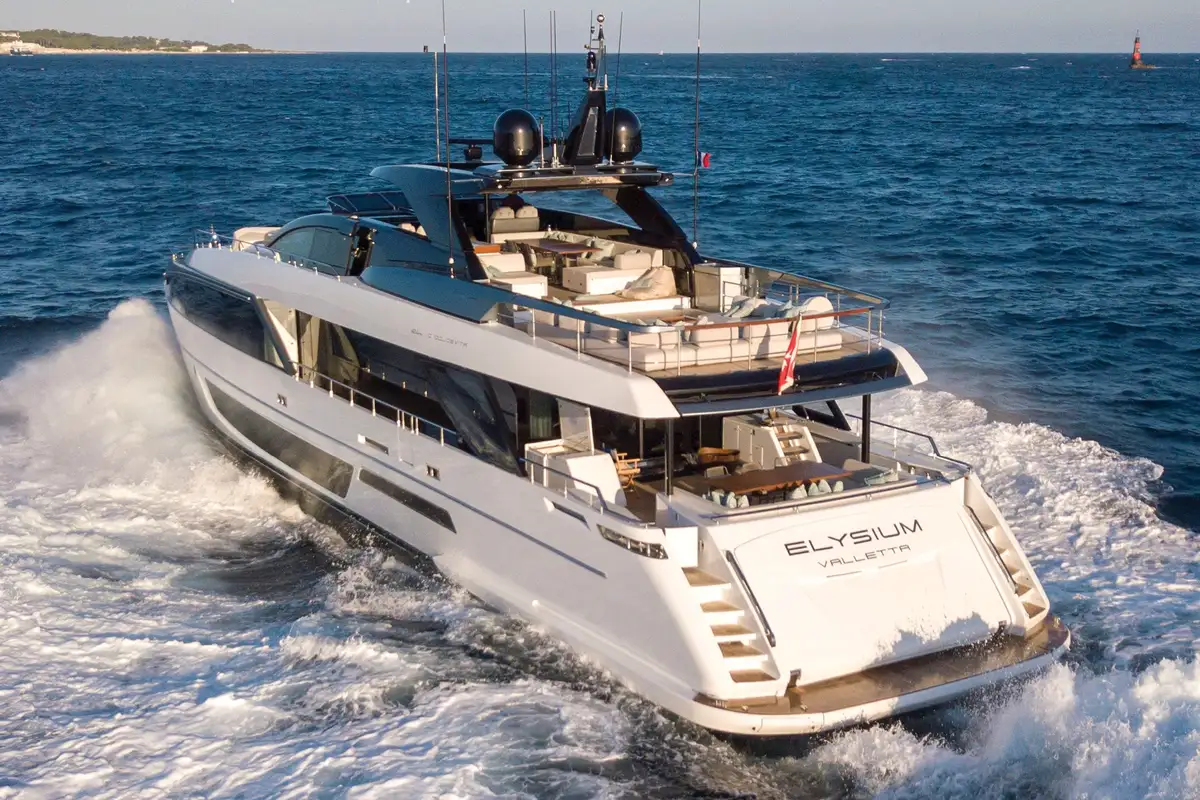 The 34m yacht ELYSIUM I was built in 2019 by Riva. She features an exterior design by Mauro Micheli and an interior by Mauro Micheli. She cruises at 23 knots and reaches a top speed of 26 kn. She can sleep up to ten guests taken care of by a crew of five.