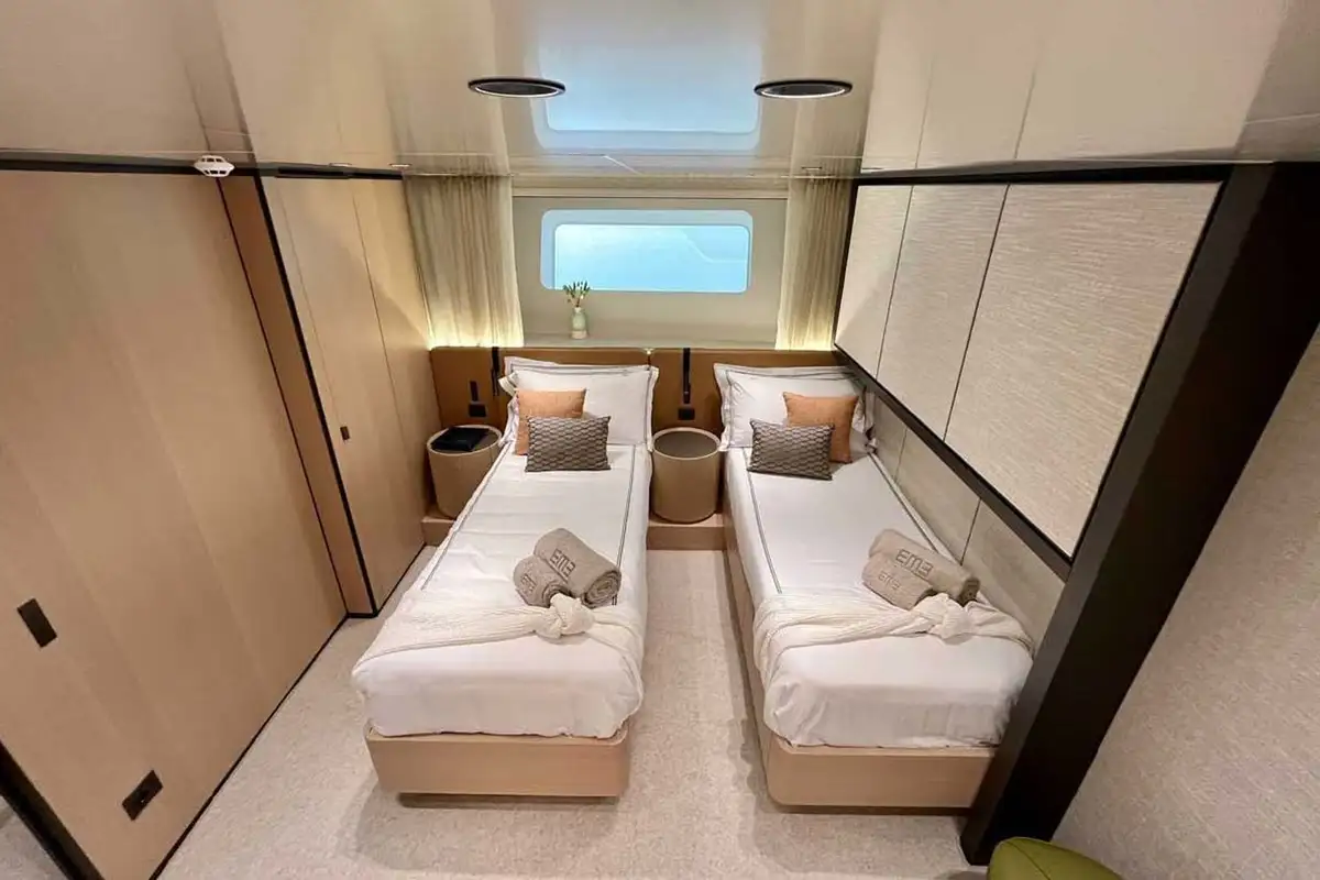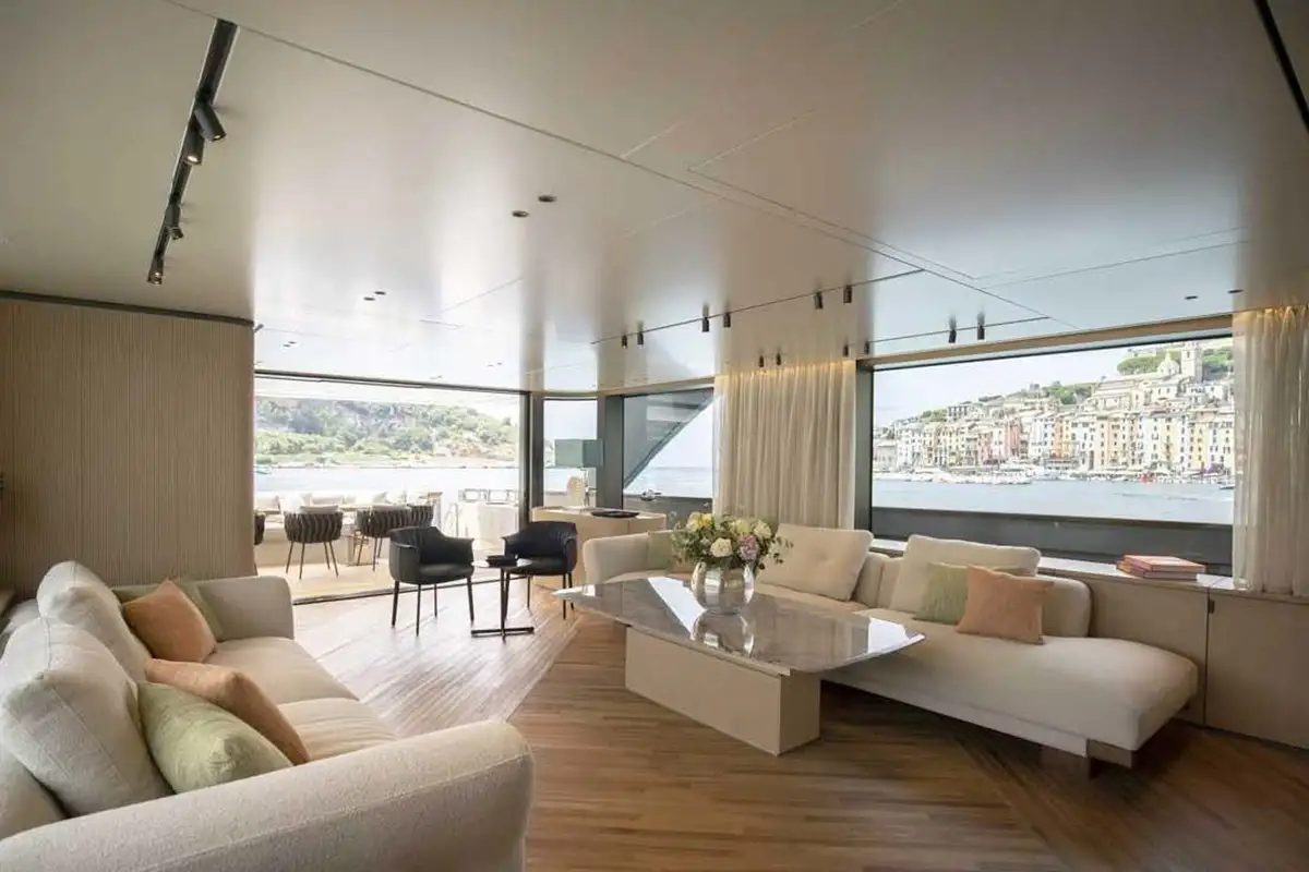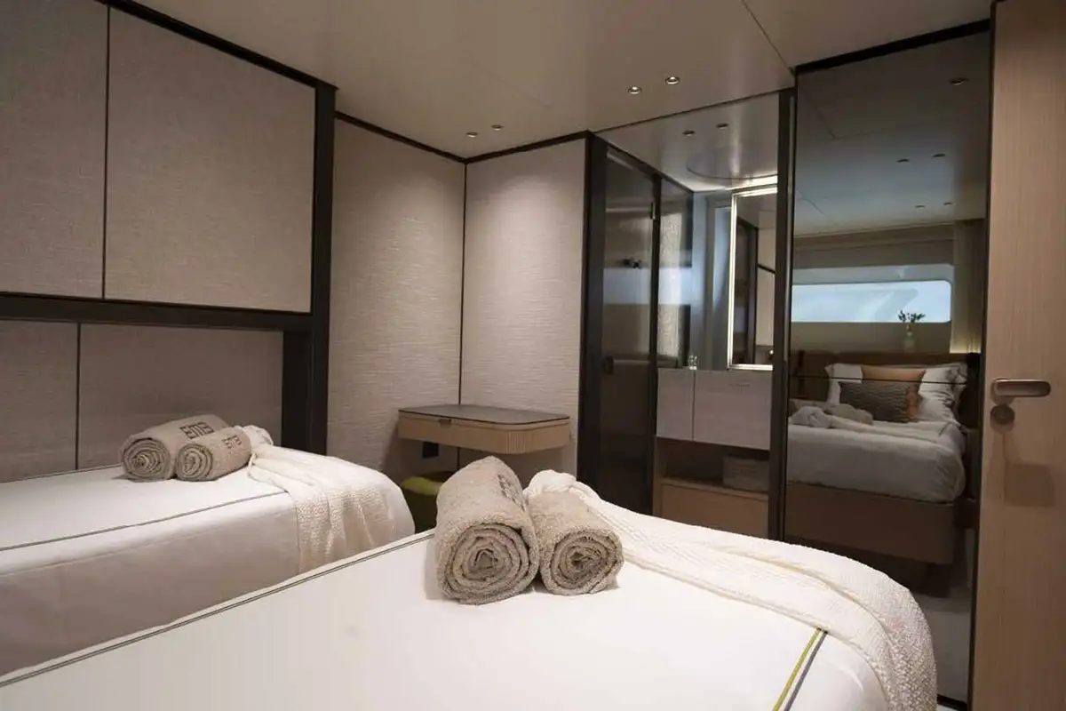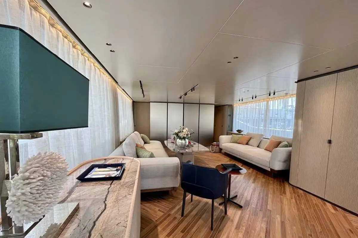 The interior design of the Sanlorenzo SD90 EM3 is curated by Patricia Urquiola who interprets the spaces, bringing her own vision on board with an approach closely linked to transformability. The SD90 spans two and a half decks and features an open flybridge that is configured with a lower deck and main deck. The bow area of the main deck is conceived as a partial full-beam providing a more spacious area inside than a traditional layout. SD90 EM3 accommodates up to 8 (+1) guests in 4 cabins. The Owner stateroom in the main deck forward, two VIP cabins in the lower deck and a twin cabin convertible in double cabin with an extra upper bed. All cabins are en suite.