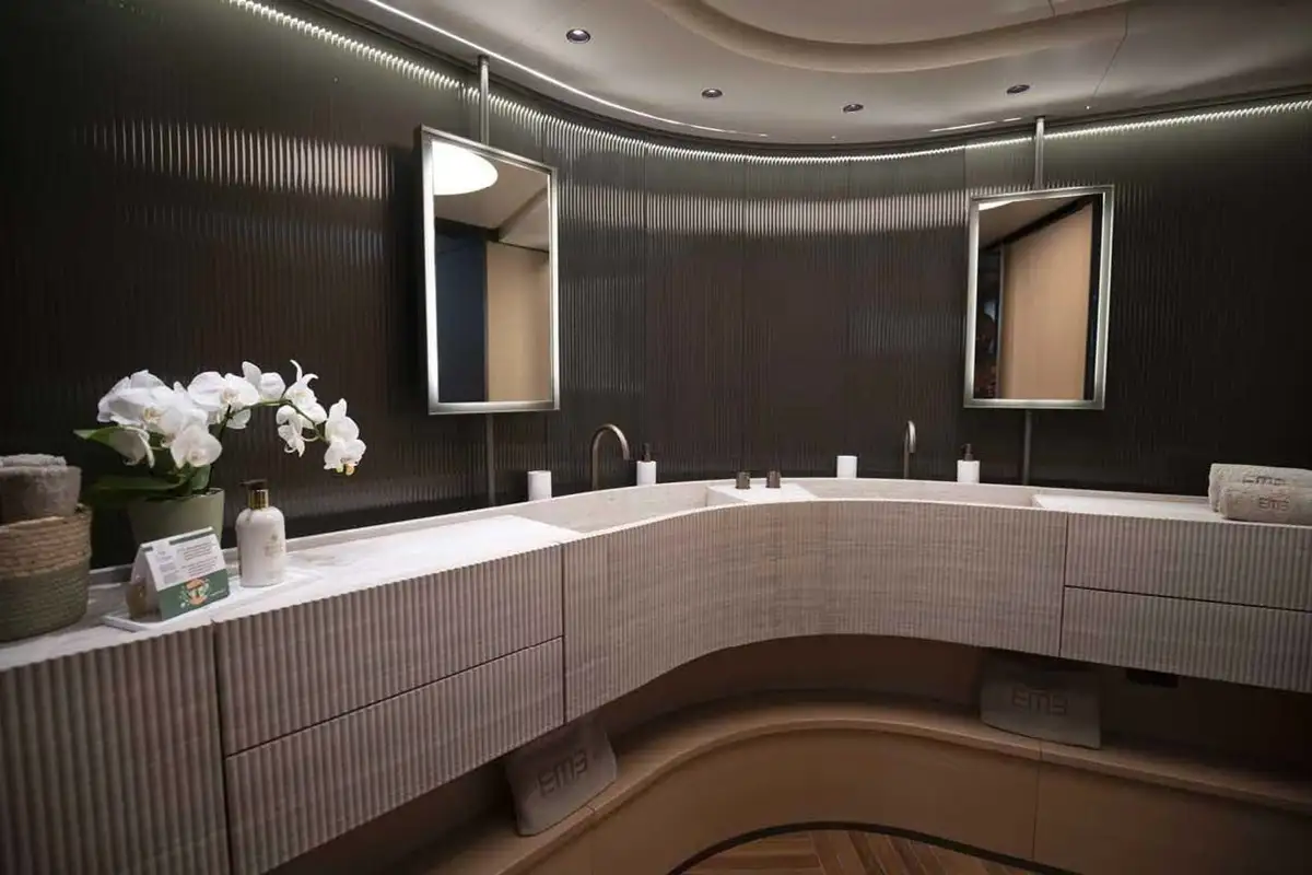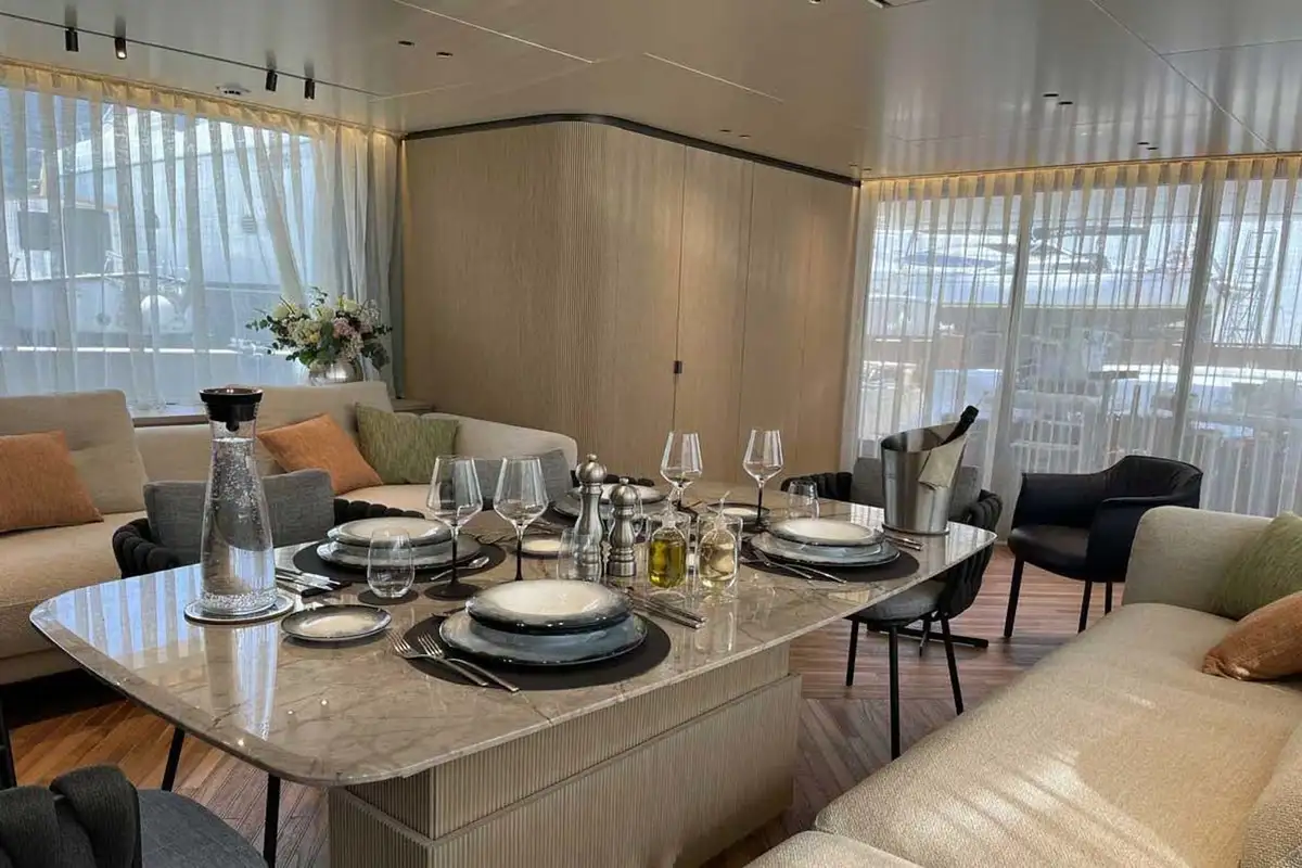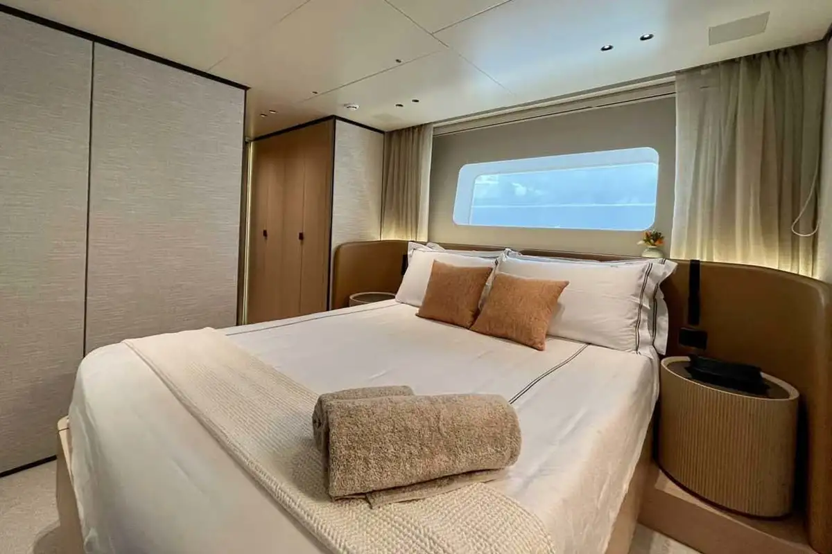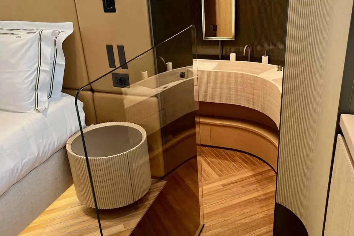 The interior design of the Sanlorenzo SD90 EM3 is curated by Patricia Urquiola who interprets the spaces, bringing her own vision on board with an approach closely linked to transformability. The SD90 spans two and a half decks and features an open flybridge that is configured with a lower deck and main deck. The bow area of the main deck is conceived as a partial full-beam providing a more spacious area inside than a traditional layout. SD90 EM3 accommodates up to 8 (+1) guests in 4 cabins. The Owner stateroom in the main deck forward, two VIP cabins in the lower deck and a twin cabin convertible in double cabin with an extra upper bed. All cabins are en suite.