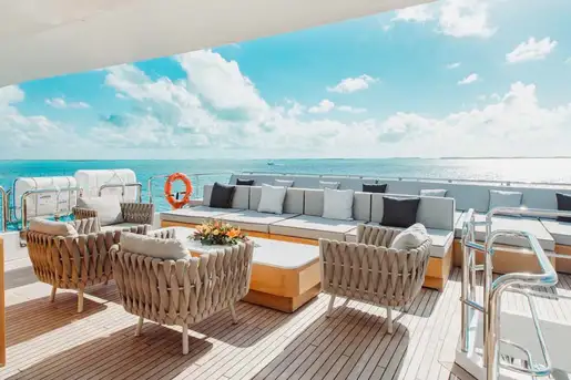 Step inside the bright lounge, where light tones and plush sofas offer a calming contrast. Picture windows run the length of the saloon, flooding the space with daylight and uninterrupted views. A formal dining table forward offers a delightful setting in which to enjoy fine dining. On the main aft deck, spacious seating sets the tone for relaxed afternoons and elegant evenings.