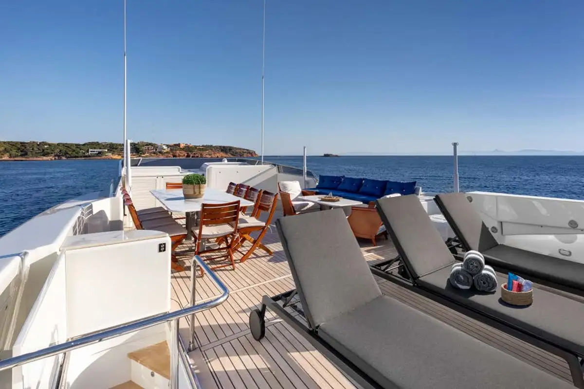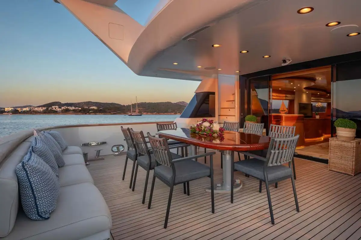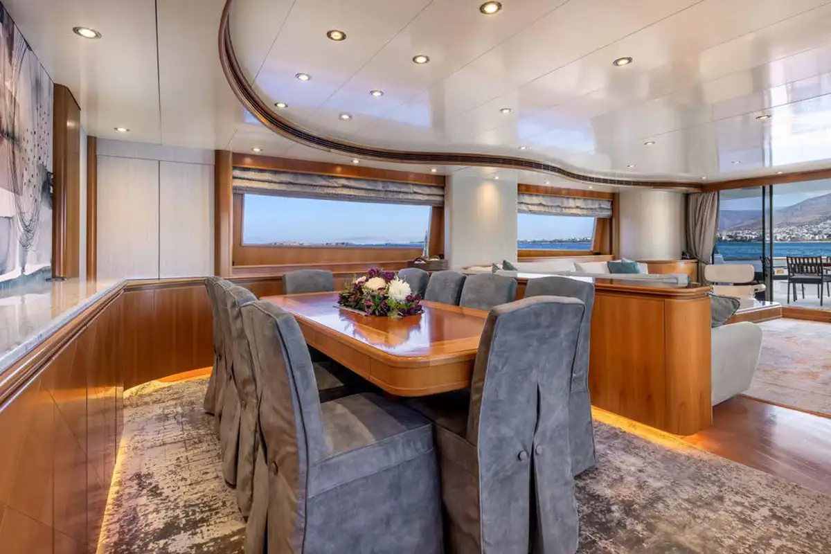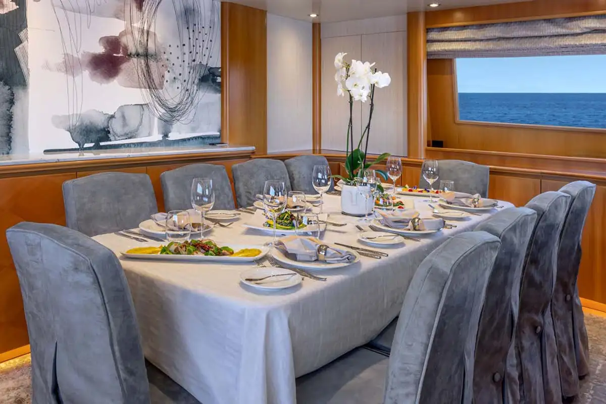 Dining is often the highlight of any charter, and on ENERGY, you can enjoy the chef’s creations in one of three dedicated dining areas. The gorgeous formal dining area on the main deck is a lavish, air-conditioned space. Long picture windows on either side provide views, while the light furnishings and lovely natural wood create a space to host breakfast, birthdays, or banquets. The main deck has a second dining area on the aft deck. Enjoy aperitifs from the bar in the main lounge before taking your seats for dinner. Here you can enjoy panoramic views accompanied by a warm breeze. The sundeck is host to the third dining area. Offering elevated 360-degree views, it’s a wonderful space to start your day and plan your activities for the days ahead.