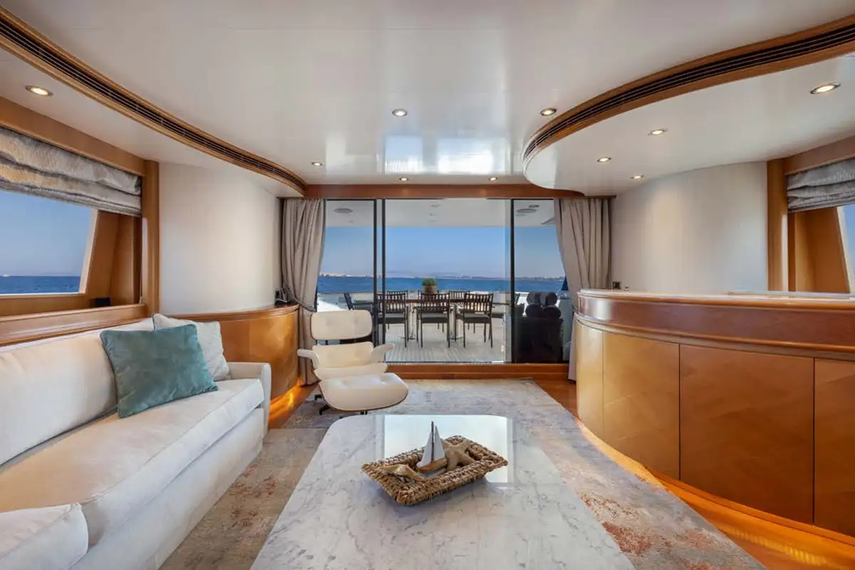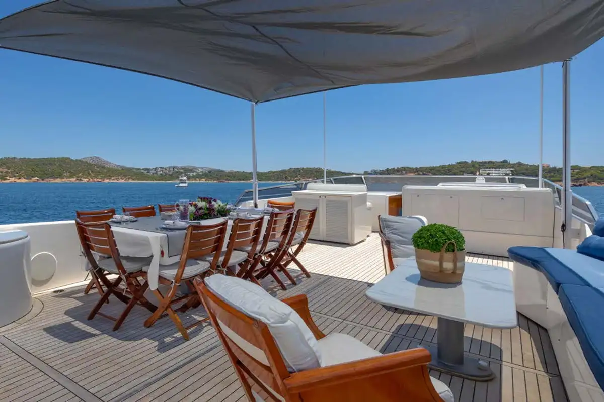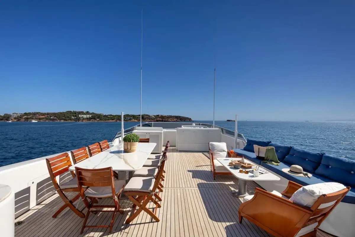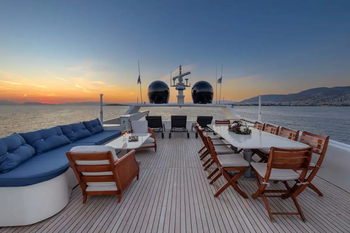 Dining is often the highlight of any charter, and on ENERGY, you can enjoy the chef’s creations in one of three dedicated dining areas. The gorgeous formal dining area on the main deck is a lavish, air-conditioned space. Long picture windows on either side provide views, while the light furnishings and lovely natural wood create a space to host breakfast, birthdays, or banquets. The main deck has a second dining area on the aft deck. Enjoy aperitifs from the bar in the main lounge before taking your seats for dinner. Here you can enjoy panoramic views accompanied by a warm breeze. The sundeck is host to the third dining area. Offering elevated 360-degree views, it’s a wonderful space to start your day and plan your activities for the days ahead.