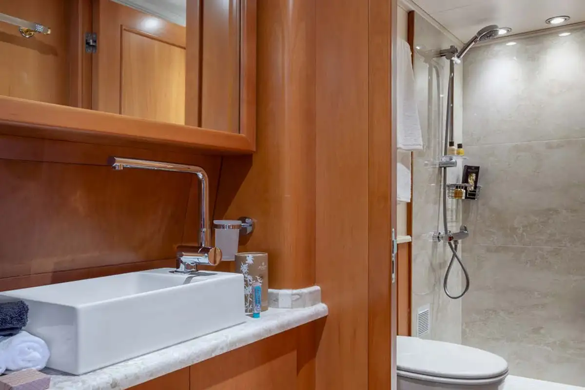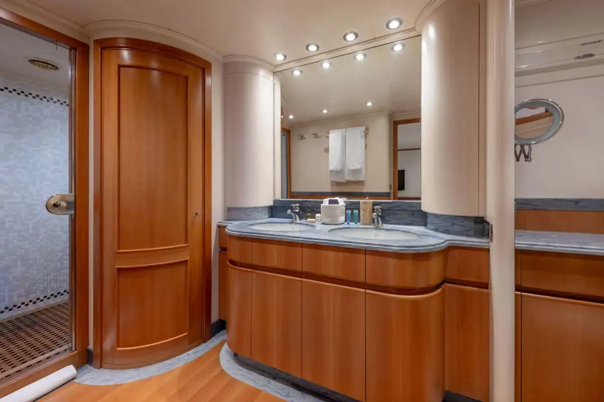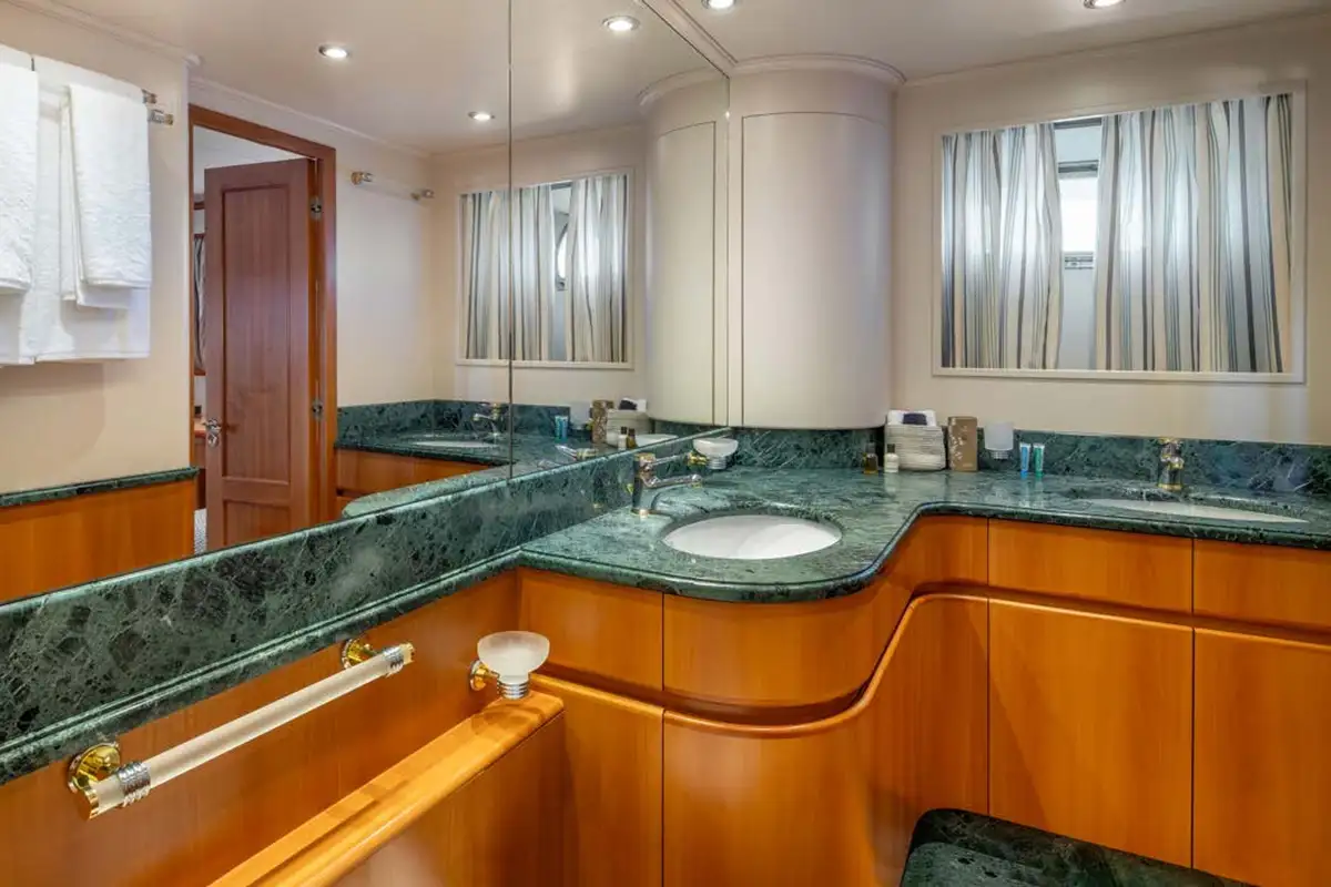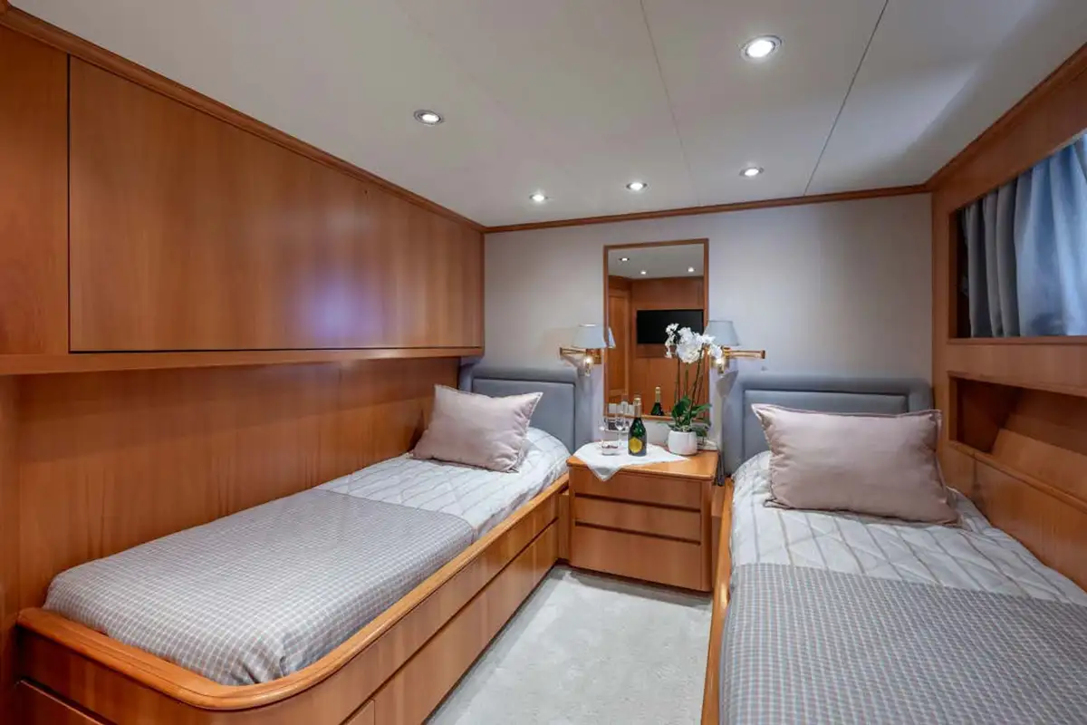 The guest suites on ENERGY are as delightful as the harmonious main lounge. The full-beam master suite is on the lower deck. Featuring an en suite bathroom, plush seating, a walk-in wardrobe, and a dressing table, it makes the perfect secluded retreat. Ahead of this suite, there are two twin-berth suites, both en suite and each with pullman berths. Moving further forward is the delightful full-beam double VIP suite. On the main deck is a third double suite that can be converted into an office space.