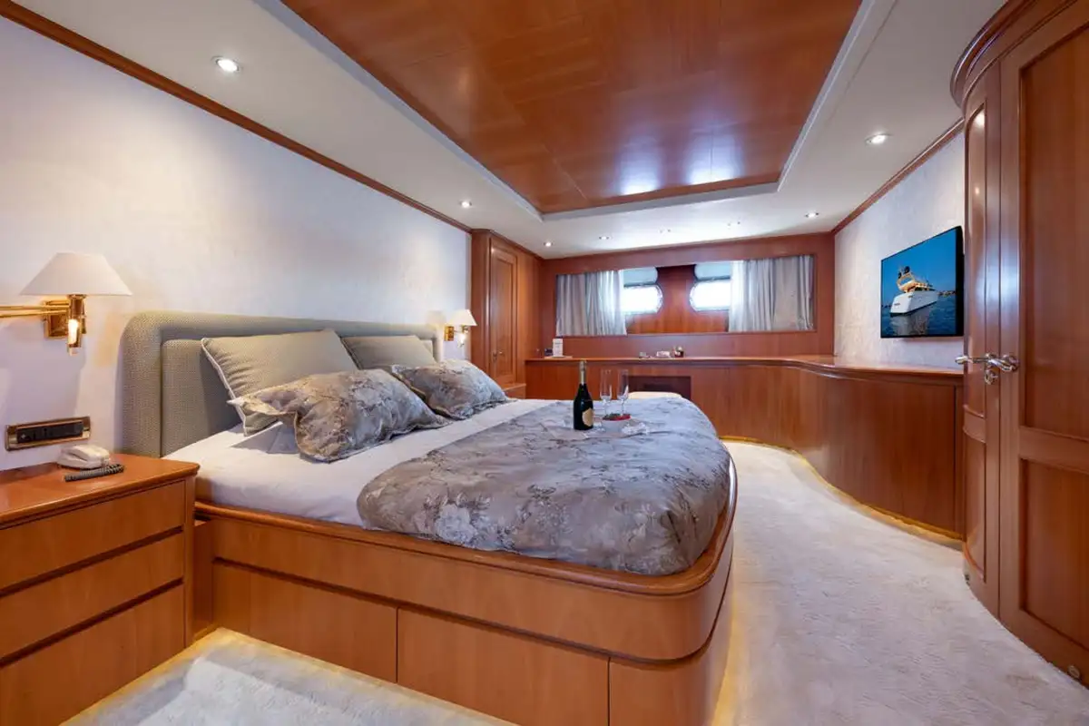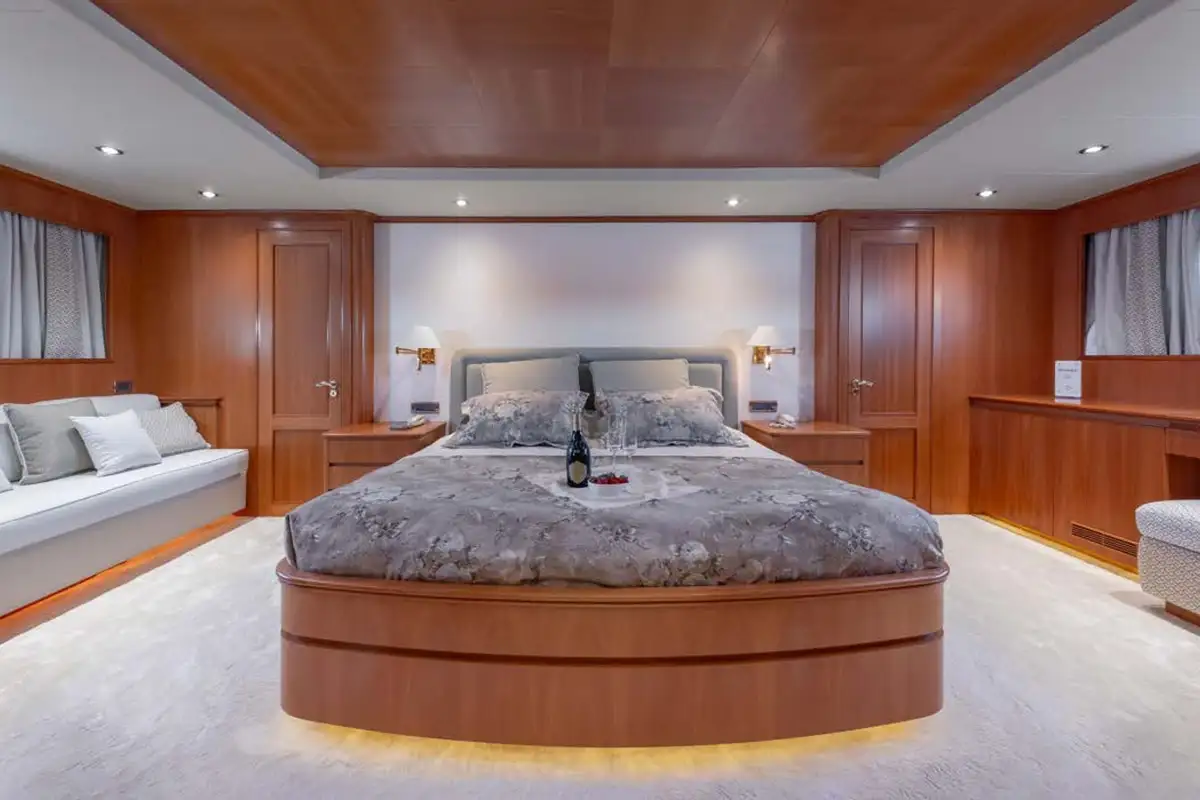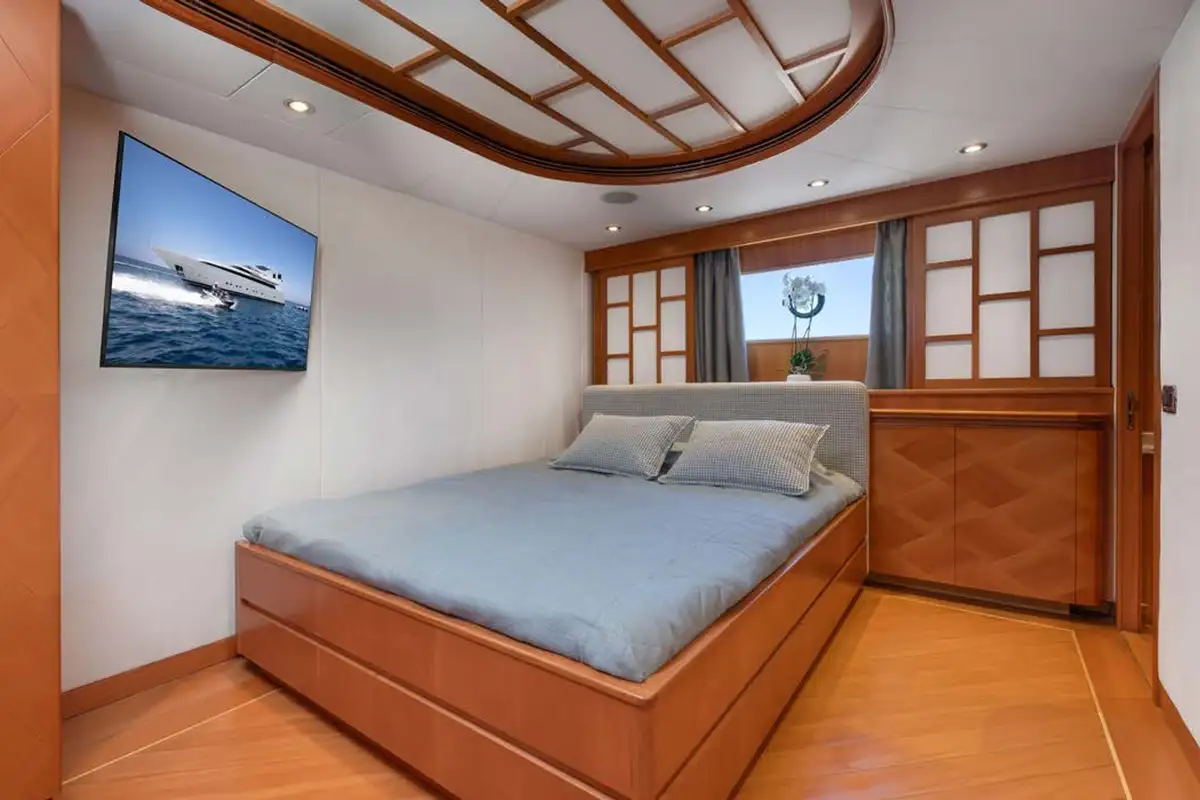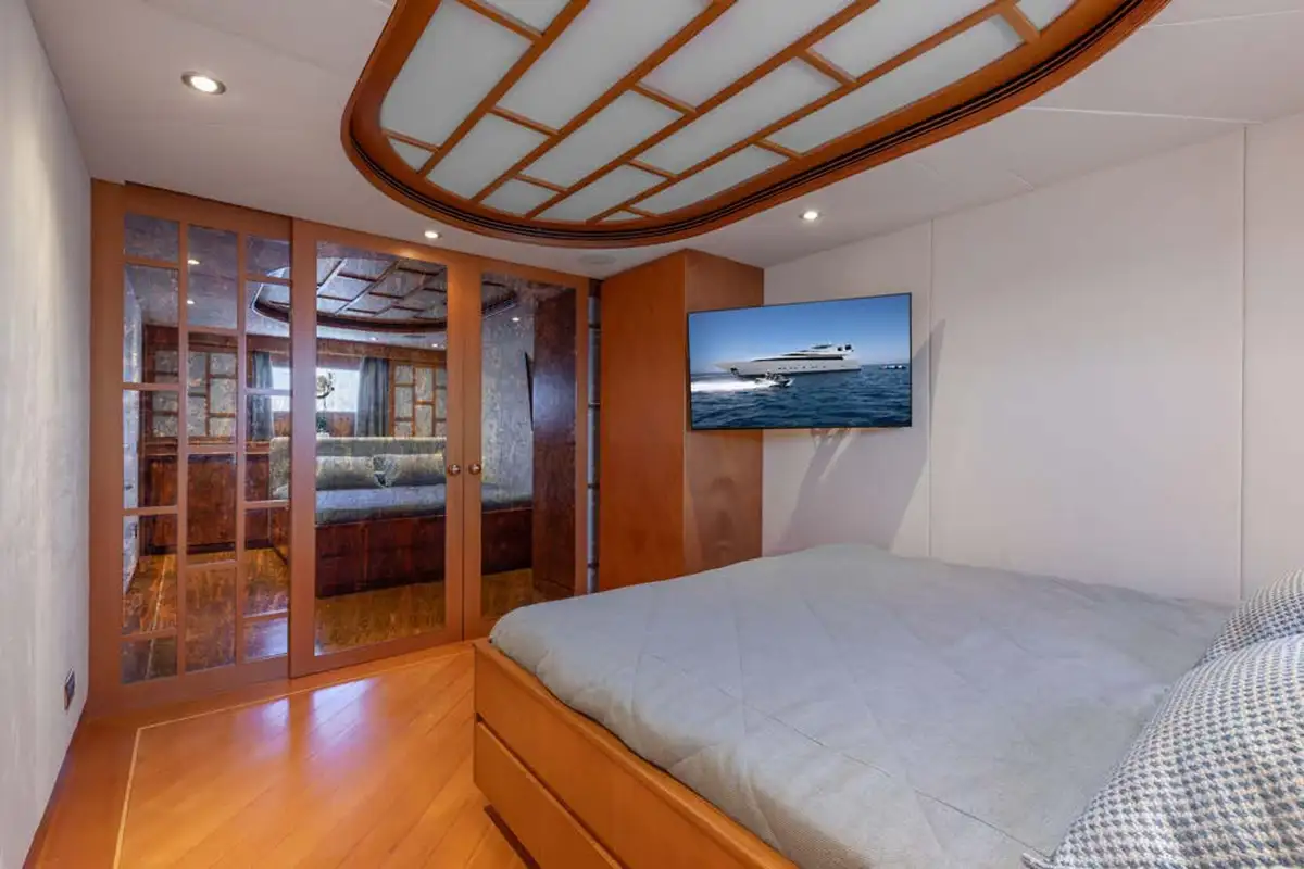 The guest suites on ENERGY are as delightful as the harmonious main lounge. The full-beam master suite is on the lower deck. Featuring an en suite bathroom, plush seating, a walk-in wardrobe, and a dressing table, it makes the perfect secluded retreat. Ahead of this suite, there are two twin-berth suites, both en suite and each with pullman berths. Moving further forward is the delightful full-beam double VIP suite. On the main deck is a third double suite that can be converted into an office space.