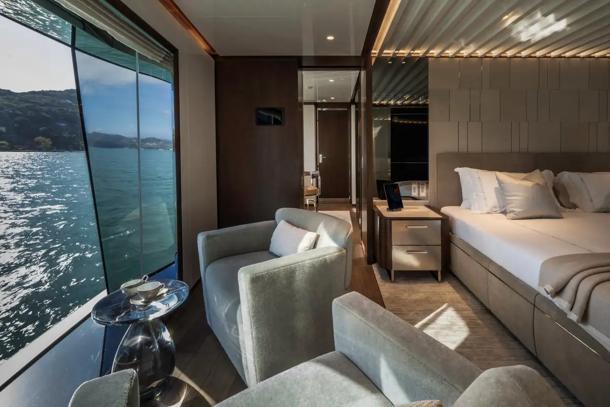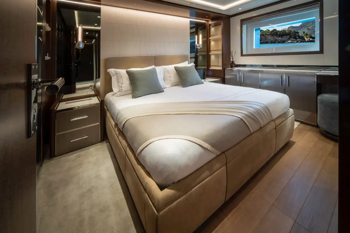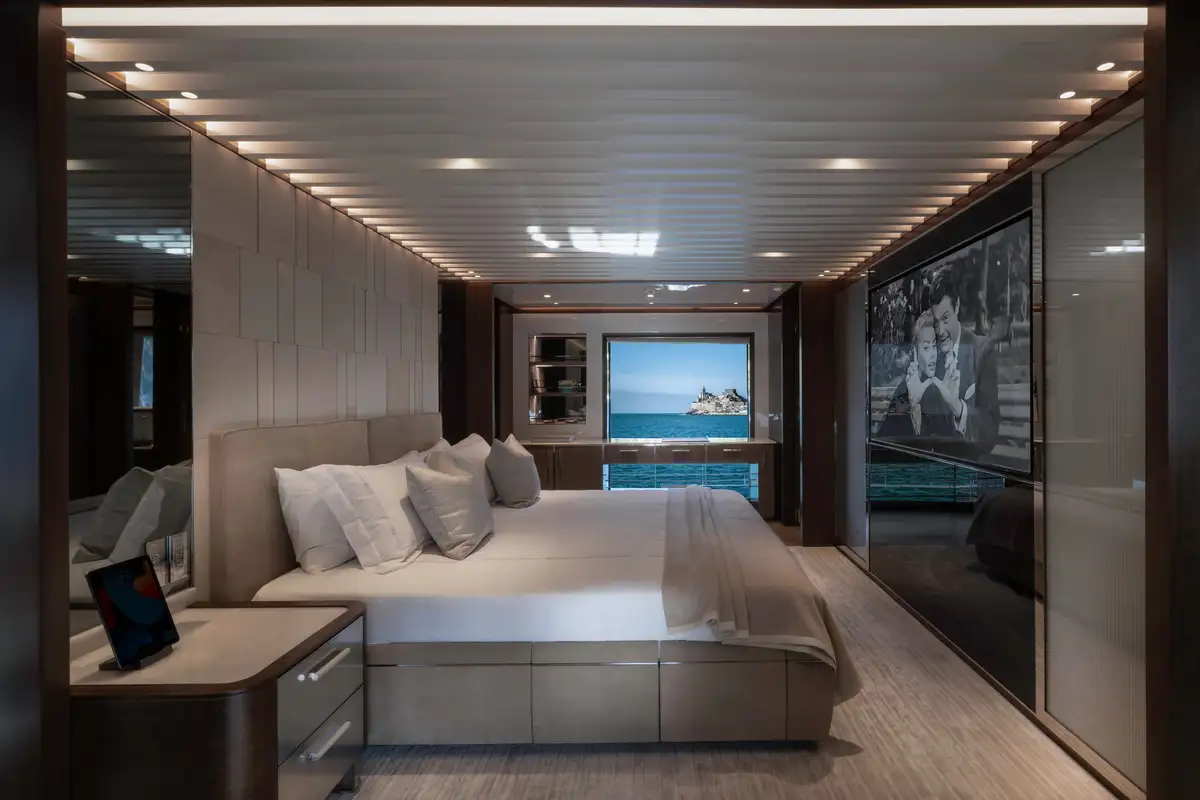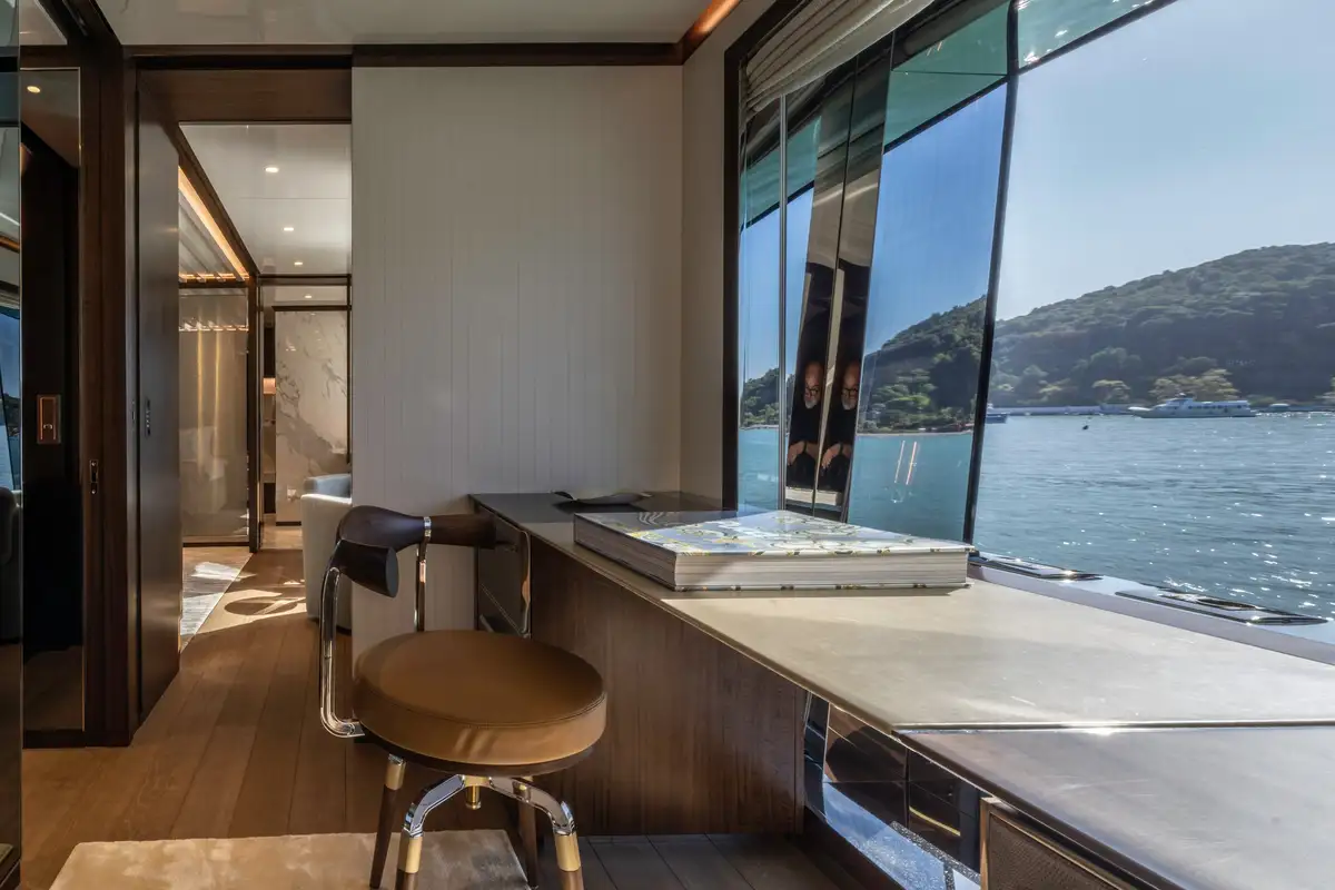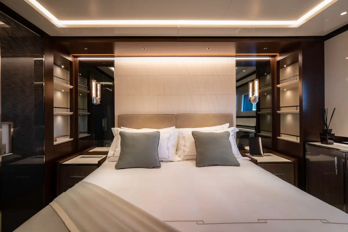 Offering magnificent views, the full-beam master cabin on the main deck has full-height windows, comfortable lounge seating with two armchairs, a private office, soundproofed doors, his-and-hers bath en suite, complete with a central rainfall shower with bench. On the lower deck two VIP cabins and two convertible cabins complete her flexible, family friendly accommodation.