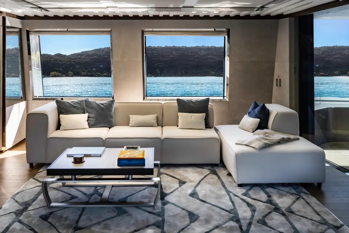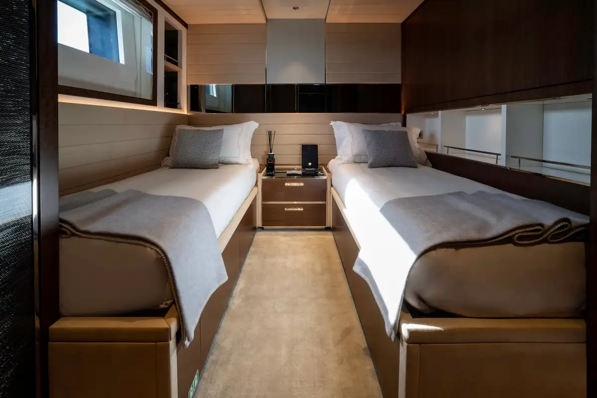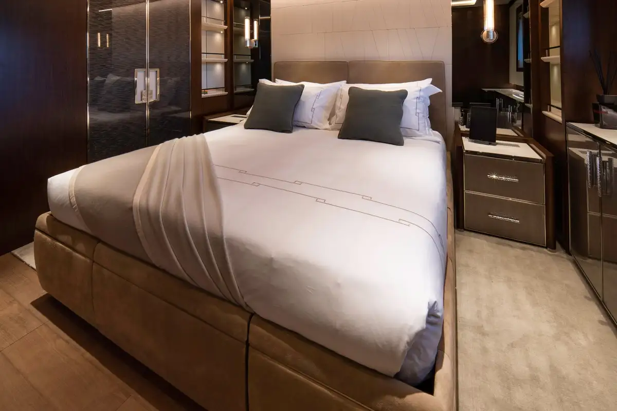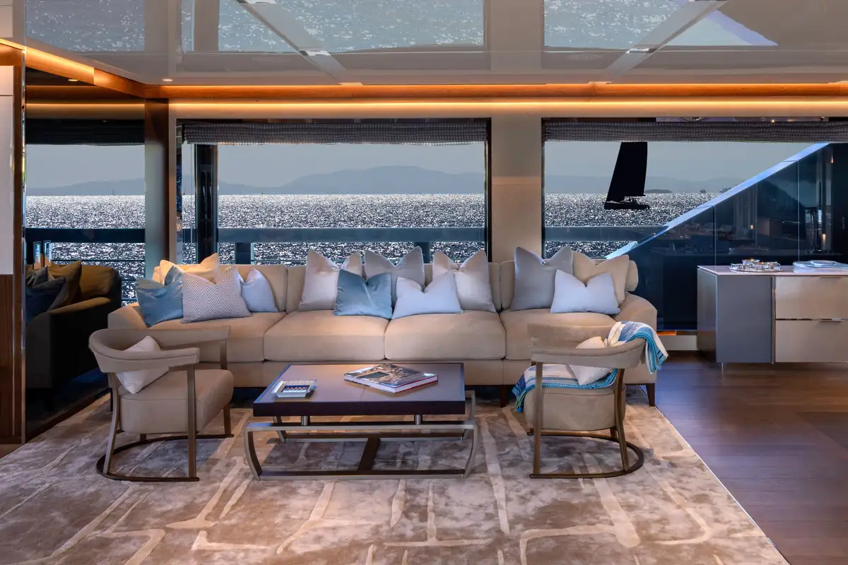 Offering magnificent views, the full-beam master cabin on the main deck has full-height windows, comfortable lounge seating with two armchairs, a private office, soundproofed doors, his-and-hers bath en suite, complete with a central rainfall shower with bench. On the lower deck two VIP cabins and two convertible cabins complete her flexible, family friendly accommodation.
