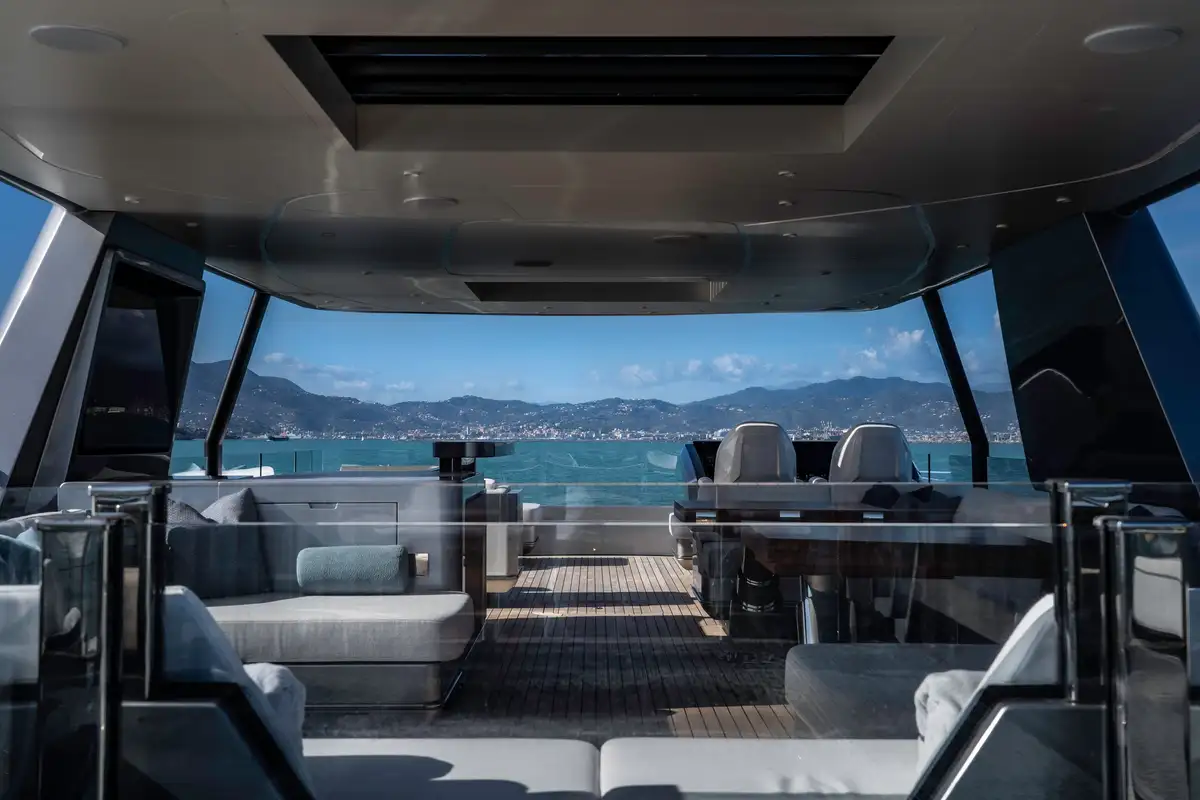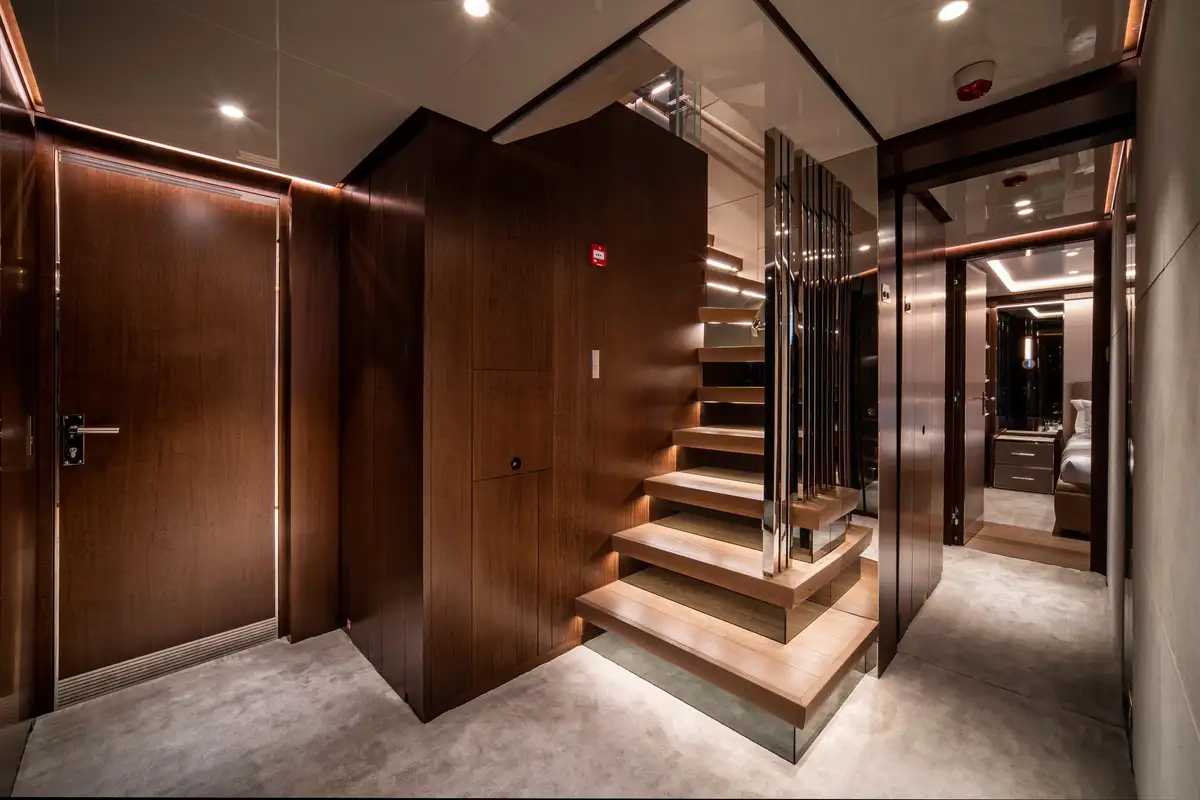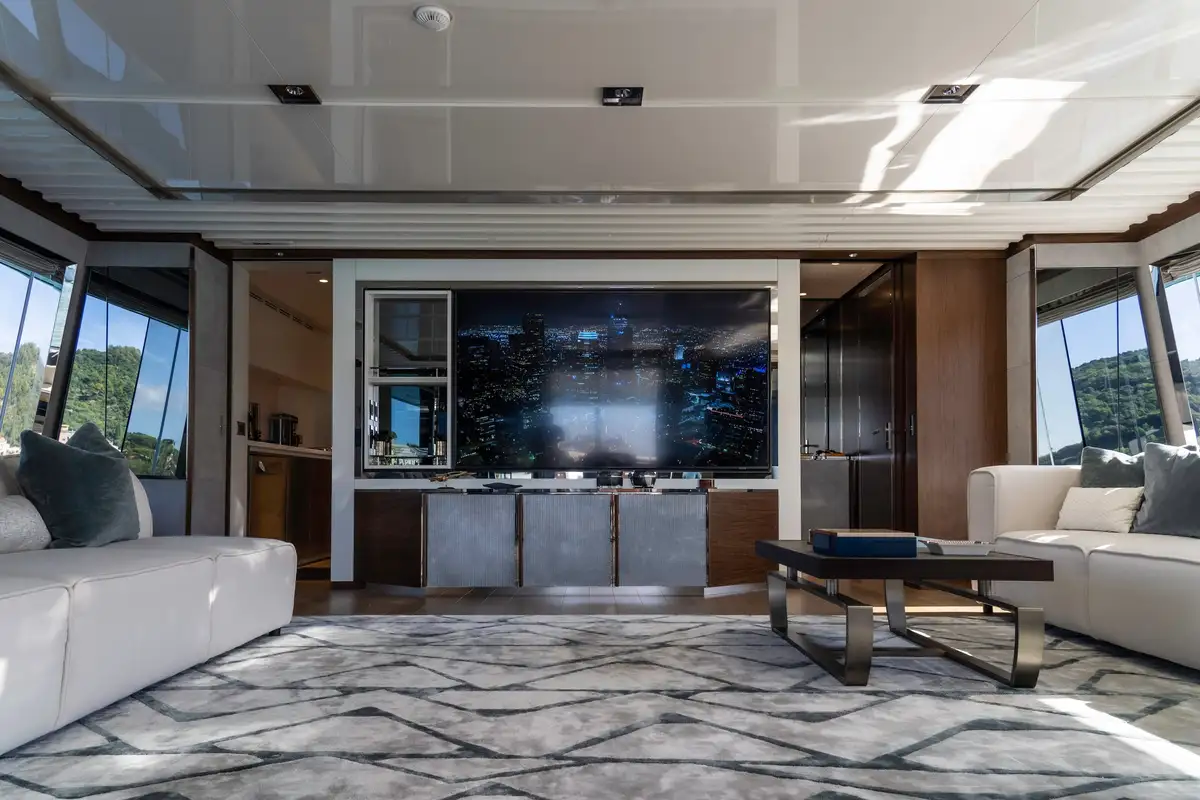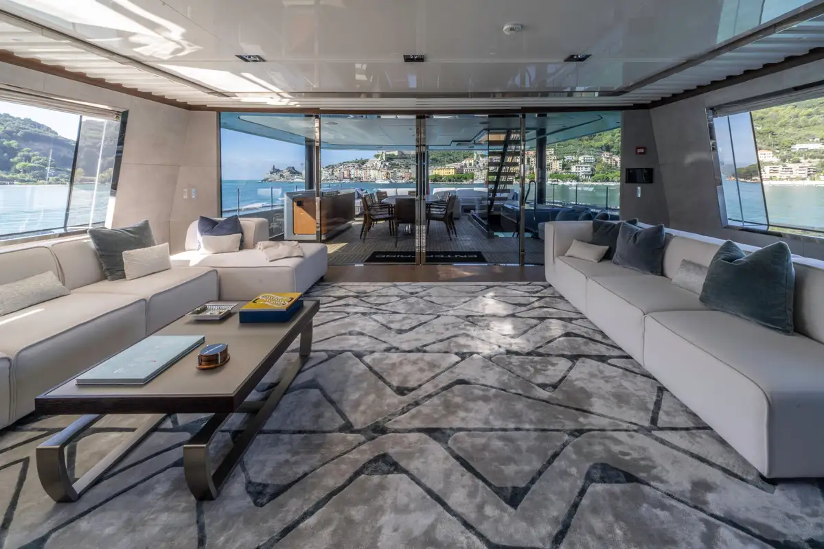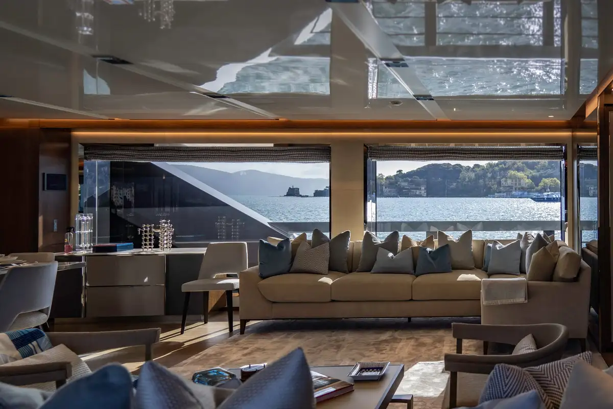 Offering magnificent views, the full-beam master cabin on the main deck has full-height windows, comfortable lounge seating with two armchairs, a private office, soundproofed doors, his-and-hers bath en suite, complete with a central rainfall shower with bench. On the lower deck two VIP cabins and two convertible cabins complete her flexible, family friendly accommodation.