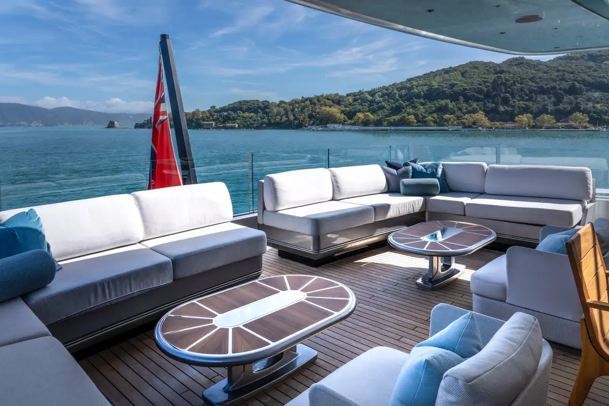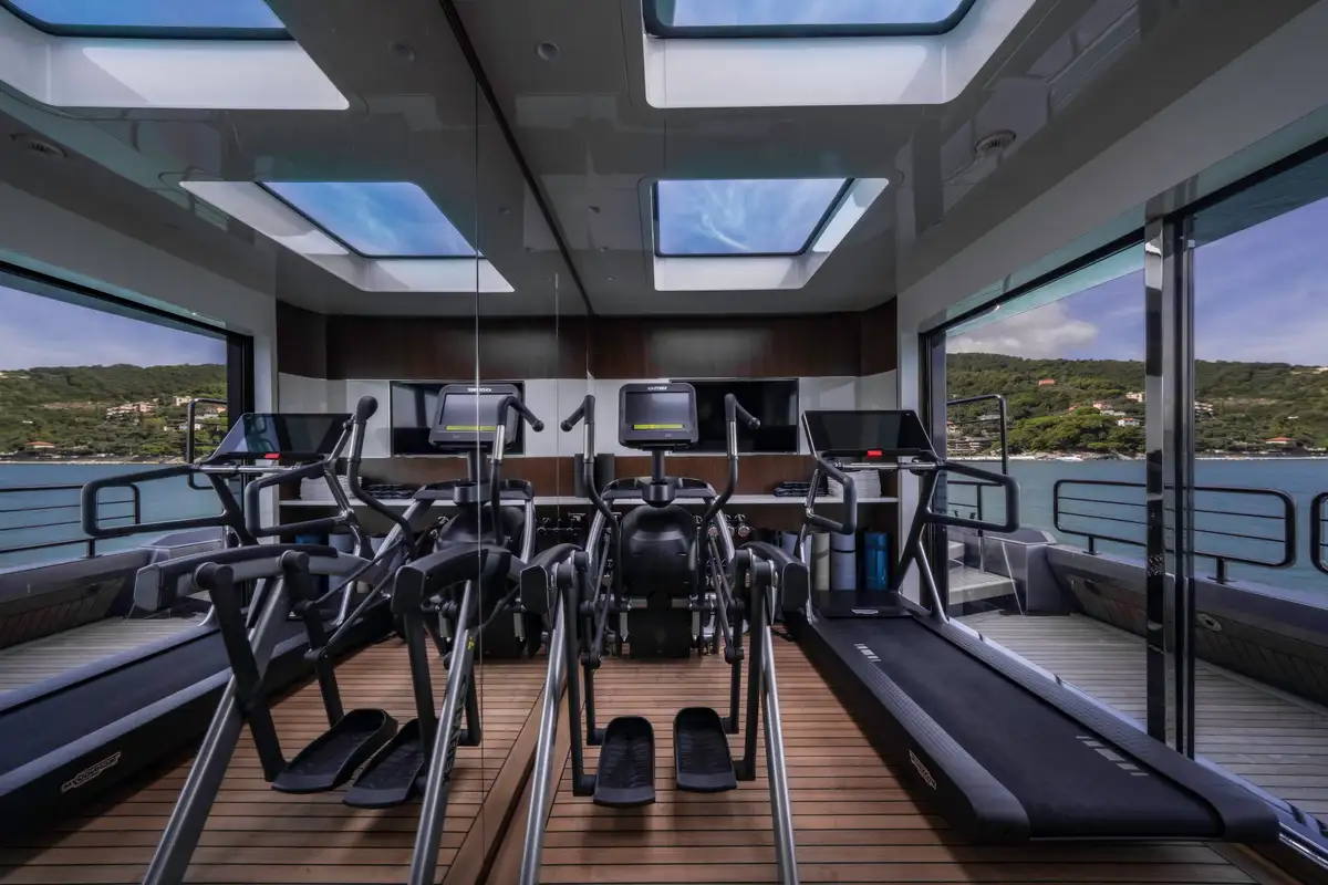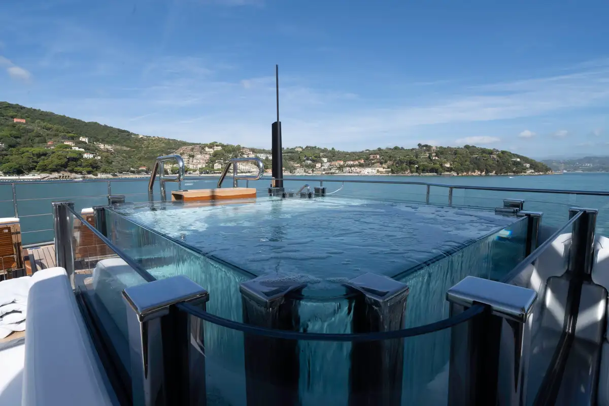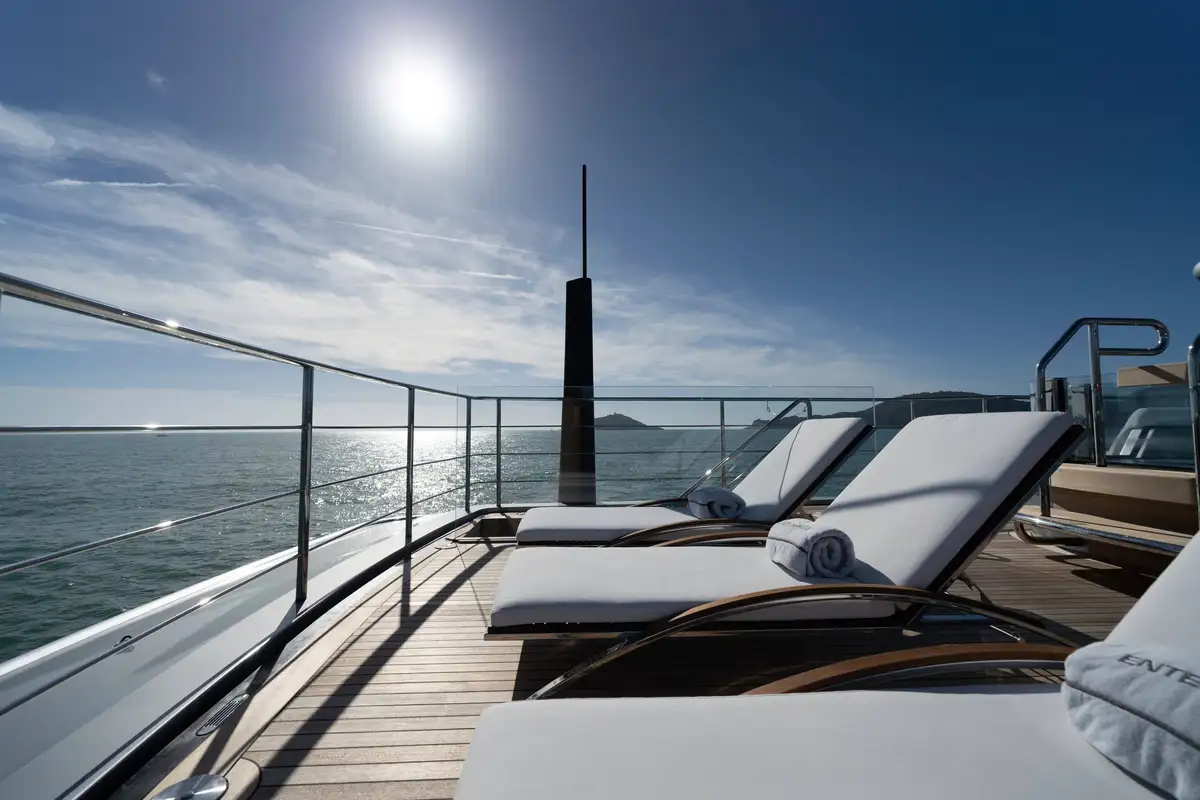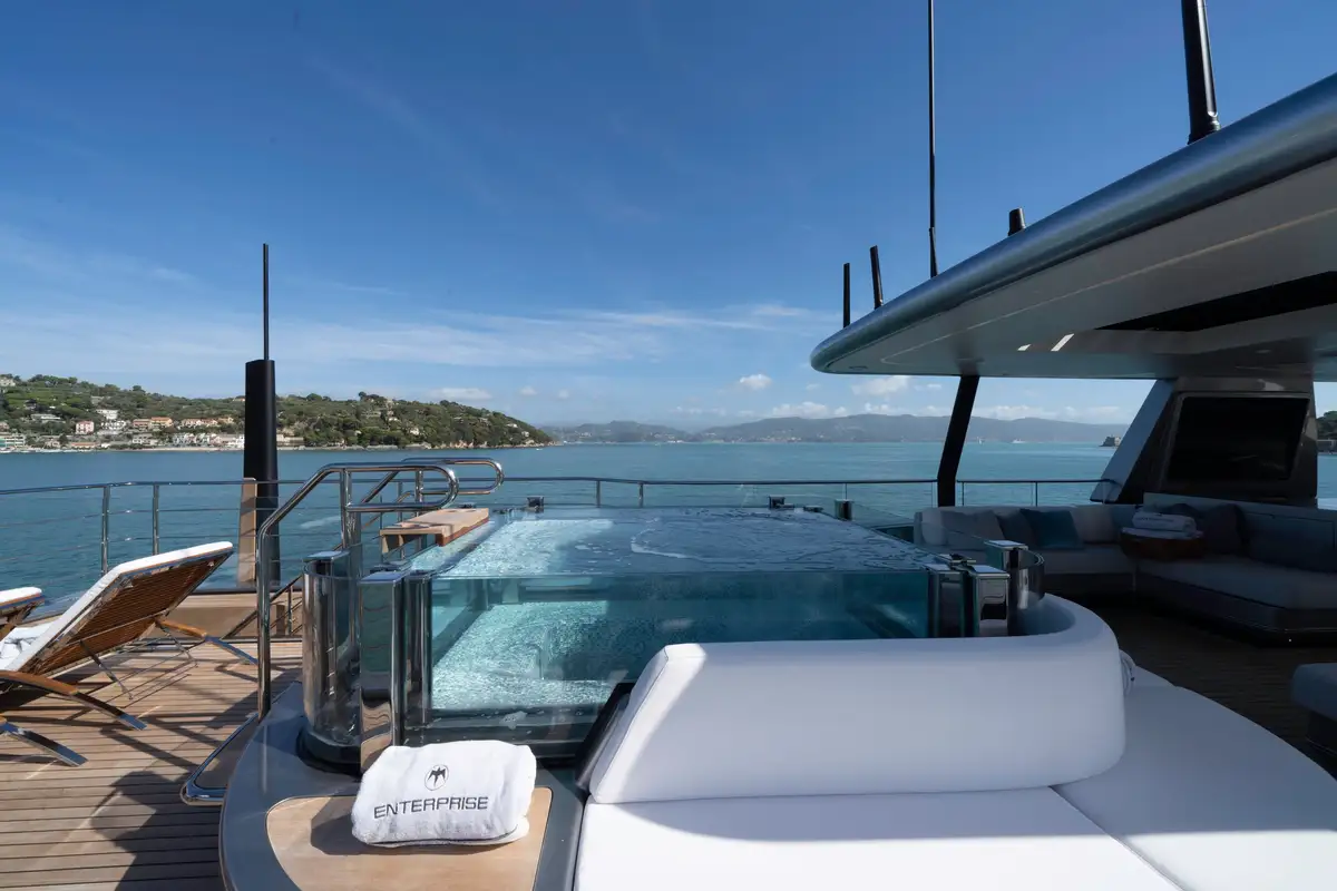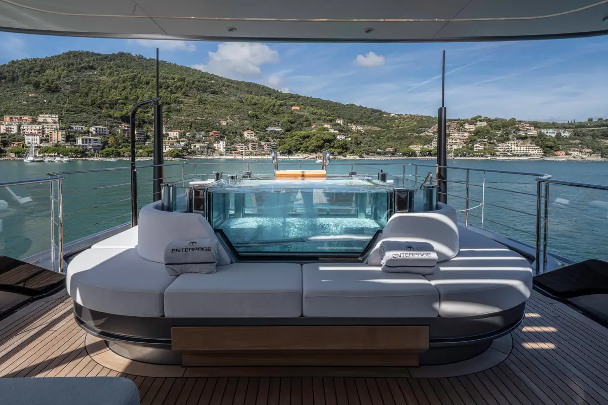 For workouts on the water head down to the air-conditioned beach club gym complete with skylight. After dark the tranquil sky lounge doubles as a cinema; the sofa seating is the perfect place to watch a movie with family and friends. The exterior spaces of ENTERPRISE are sleek, sexy and contemporary. The yacht’s exceptionally charter-friendly layout provides three teak decks with abundant lounging areas. The versatile sun deck is a stylish and modern space with a bar, al fresco lounge area, and a stunning glass jacuzzi for a true ‘on the water’ illusion. For privacy in port or to feel the wind in your hair underway, the foredeck seating is just the place to relax.