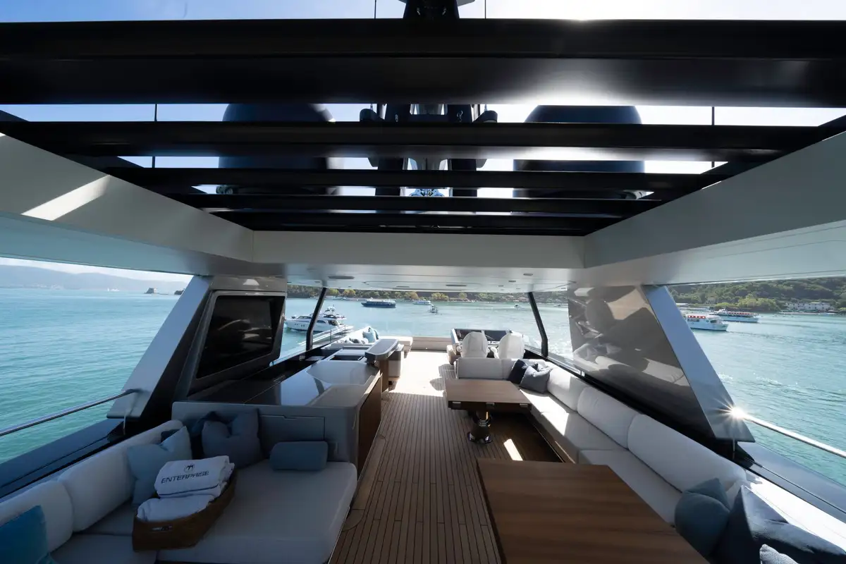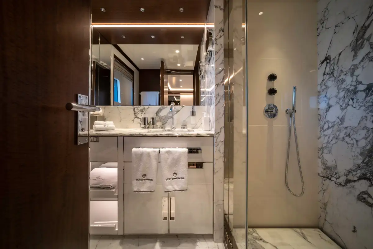 At an impressive 447GT, ENTEPRISE is more spacious than similarly sized yachts. An exceptionally innovative layout is designed to provide guests luxurious areas to enjoy life on board, offering the perfect blend of outdoor and indoor living spaces, while accommodating 10 guests in five cabins.