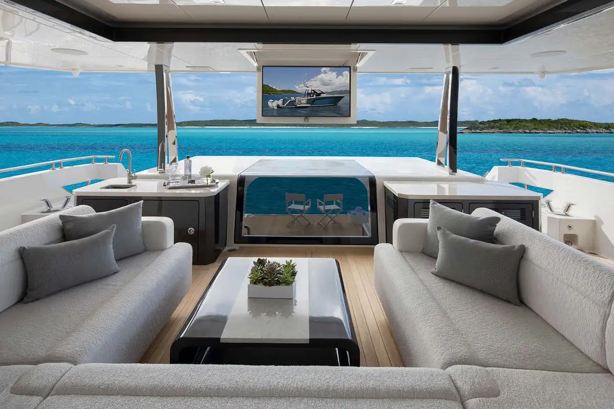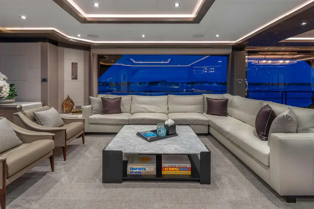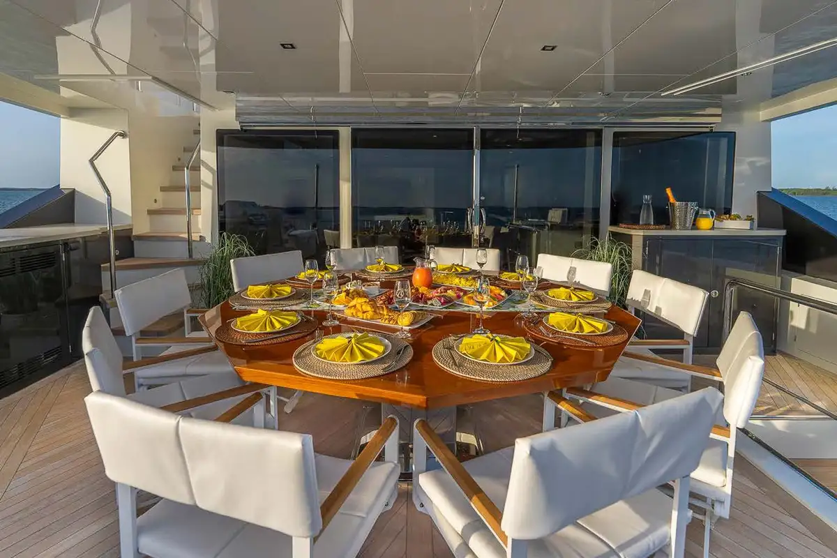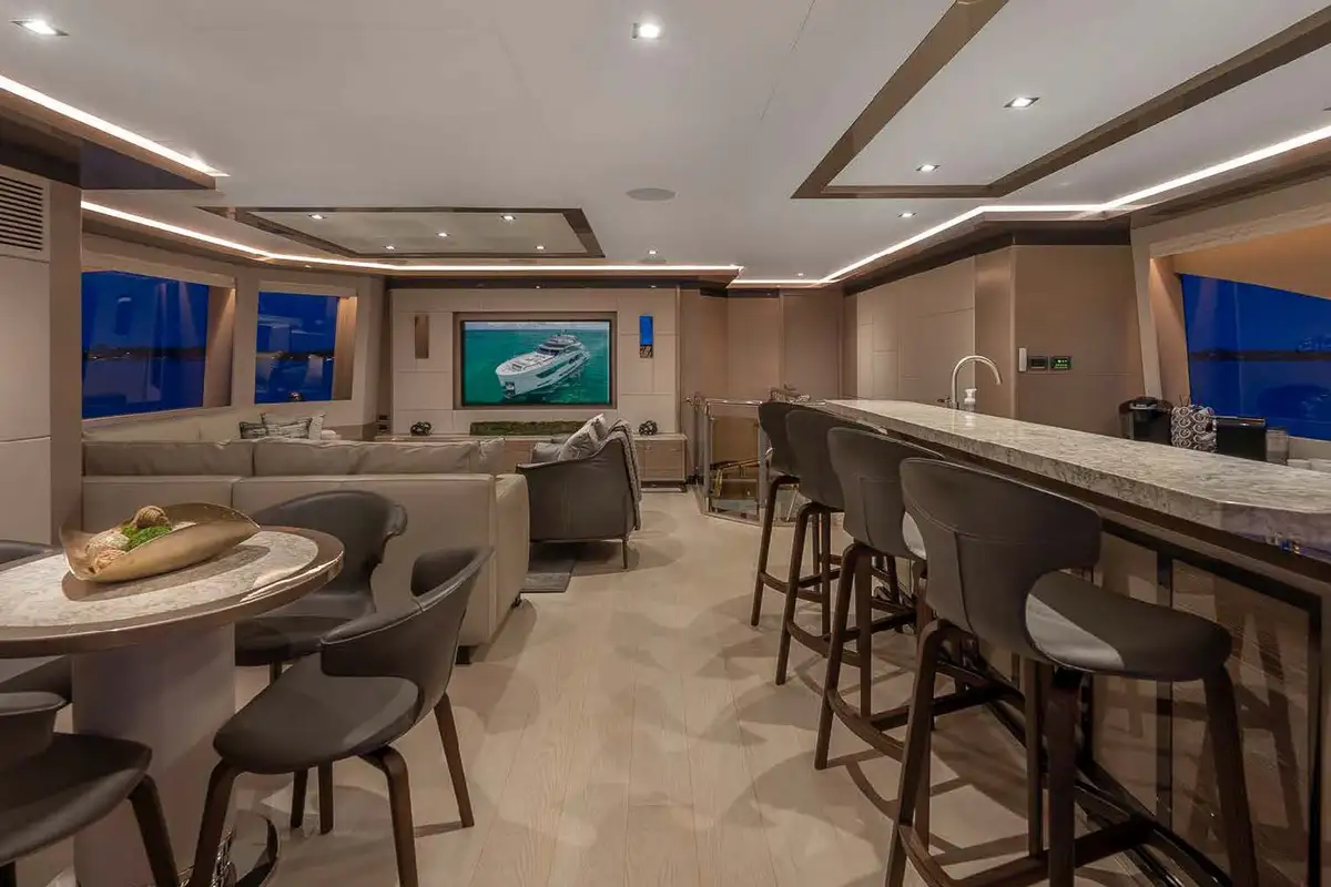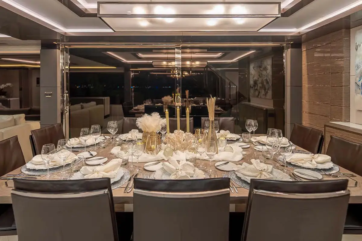 Inside, the main lounge offers a light, contemporary feel enhanced by floor-to-ceiling glass doors and panoramic windows on three sides. The high-gloss finishes reflect natural light throughout, while the formal dining area provides a refined setting for evening meals prepared by the yacht’s private chef. A staircase forward connects the guest suites below and the sky lounge above.