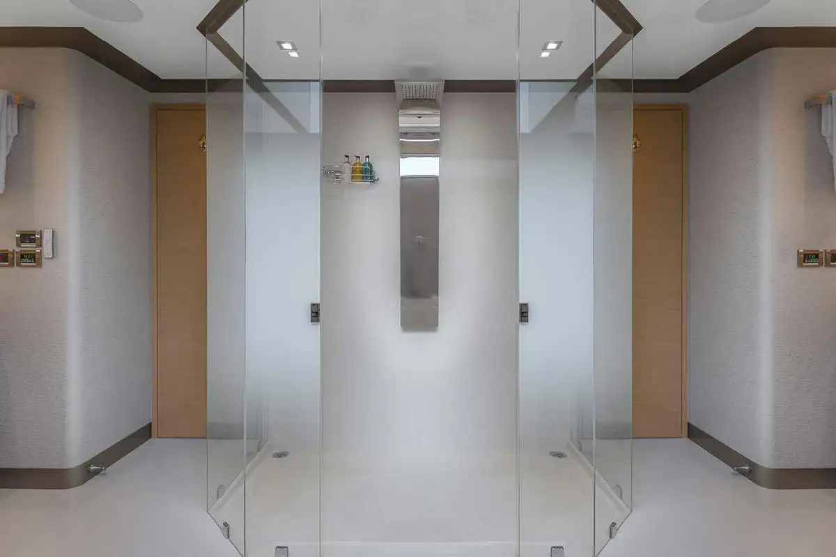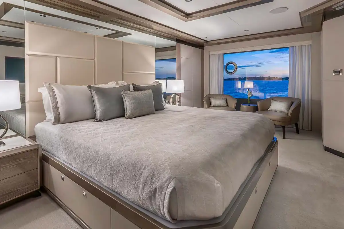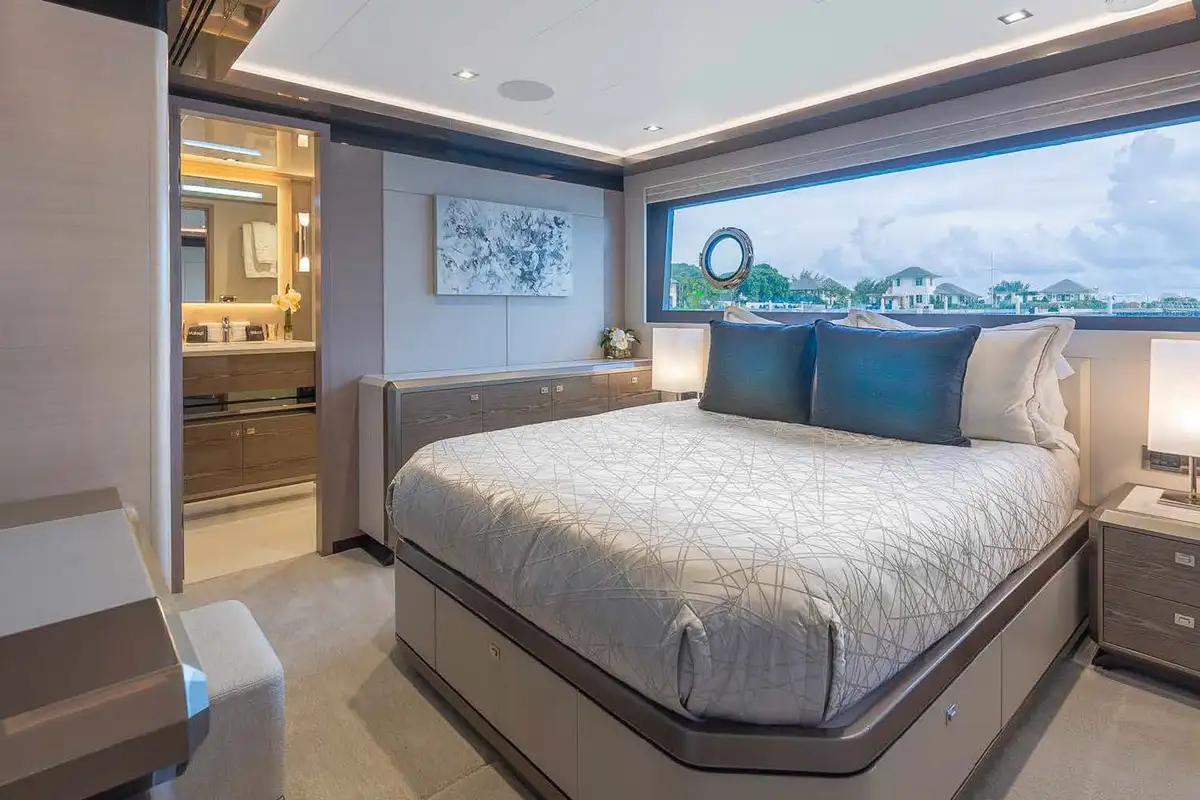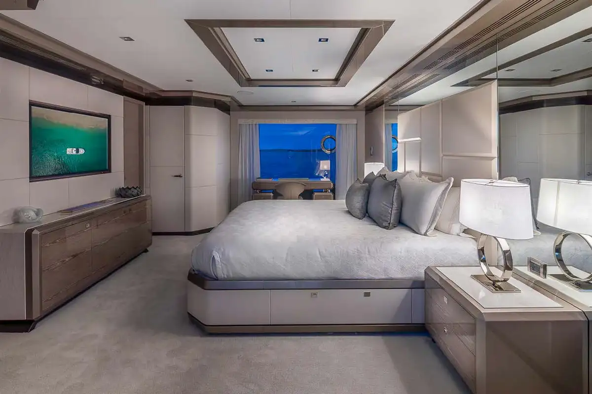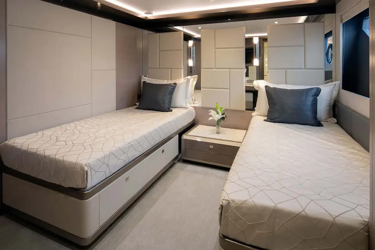 The main deck master suite spans the full beam of the yacht and features a forward-facing king-sized berth, large picture windows, his and hers walk-in wardrobes and a writing desk. The full-beam en suite bathroom includes a bath, separate shower, his and hers heads and individual vanity units. On the lower deck, two double en suite VIP suites and two convertible twin/double en suite cabins each include large hull windows offering a constant sense of connection to the sea.