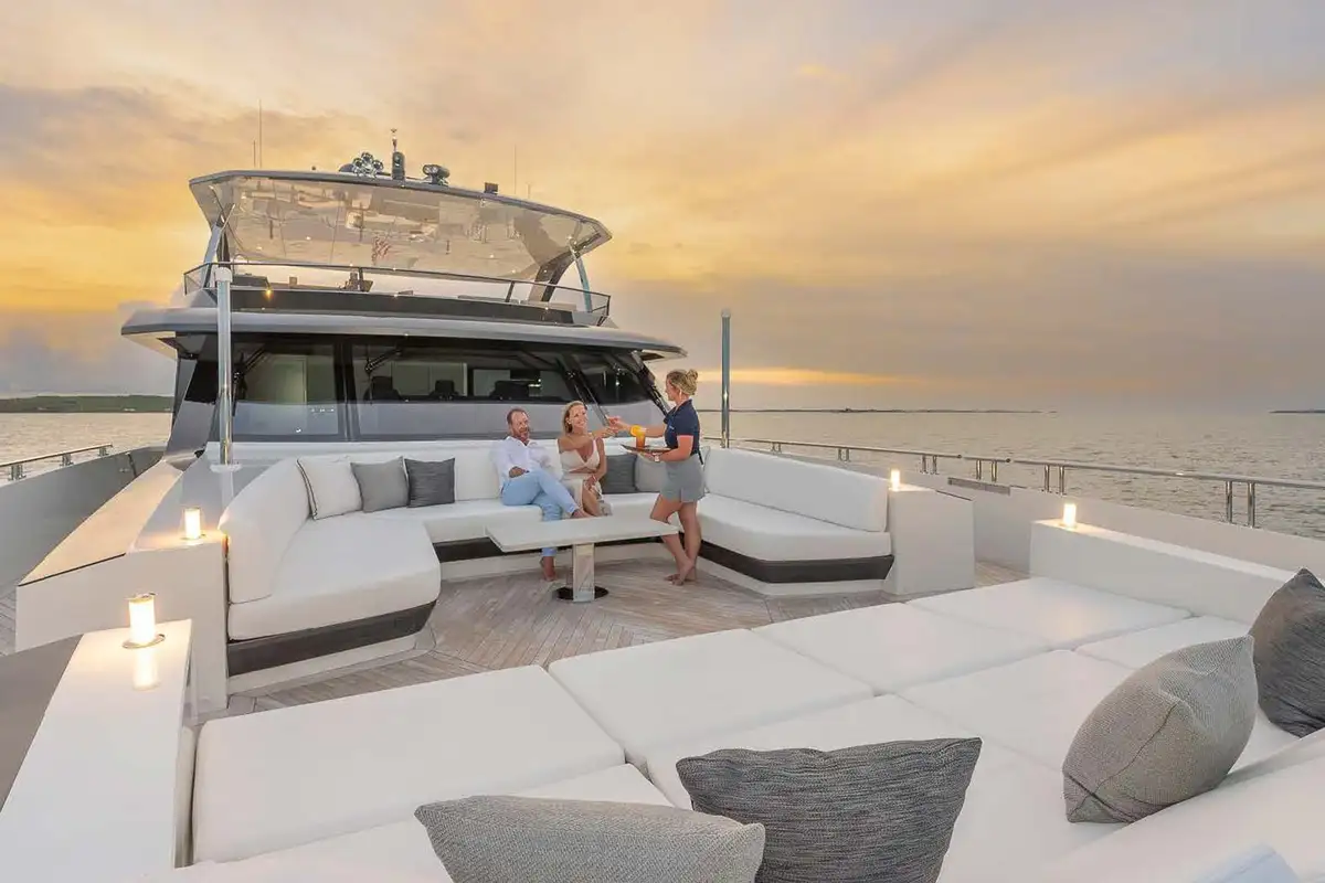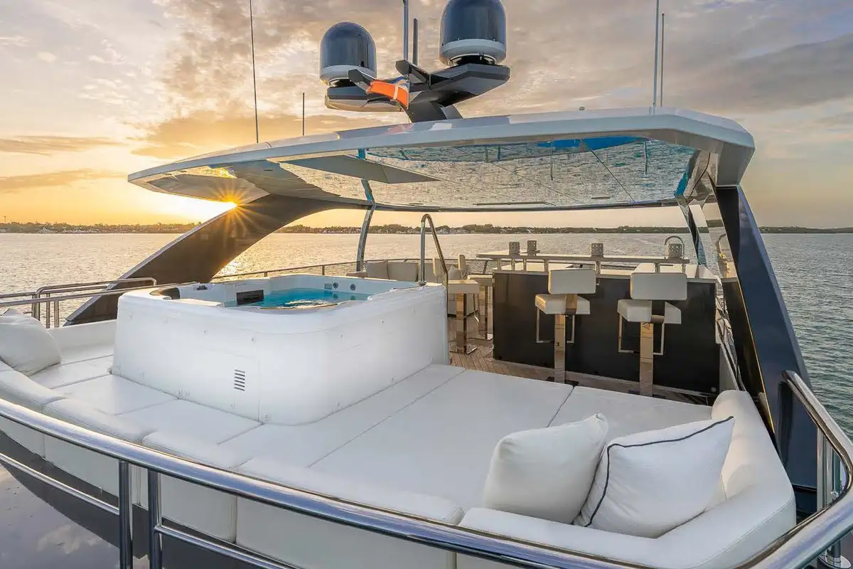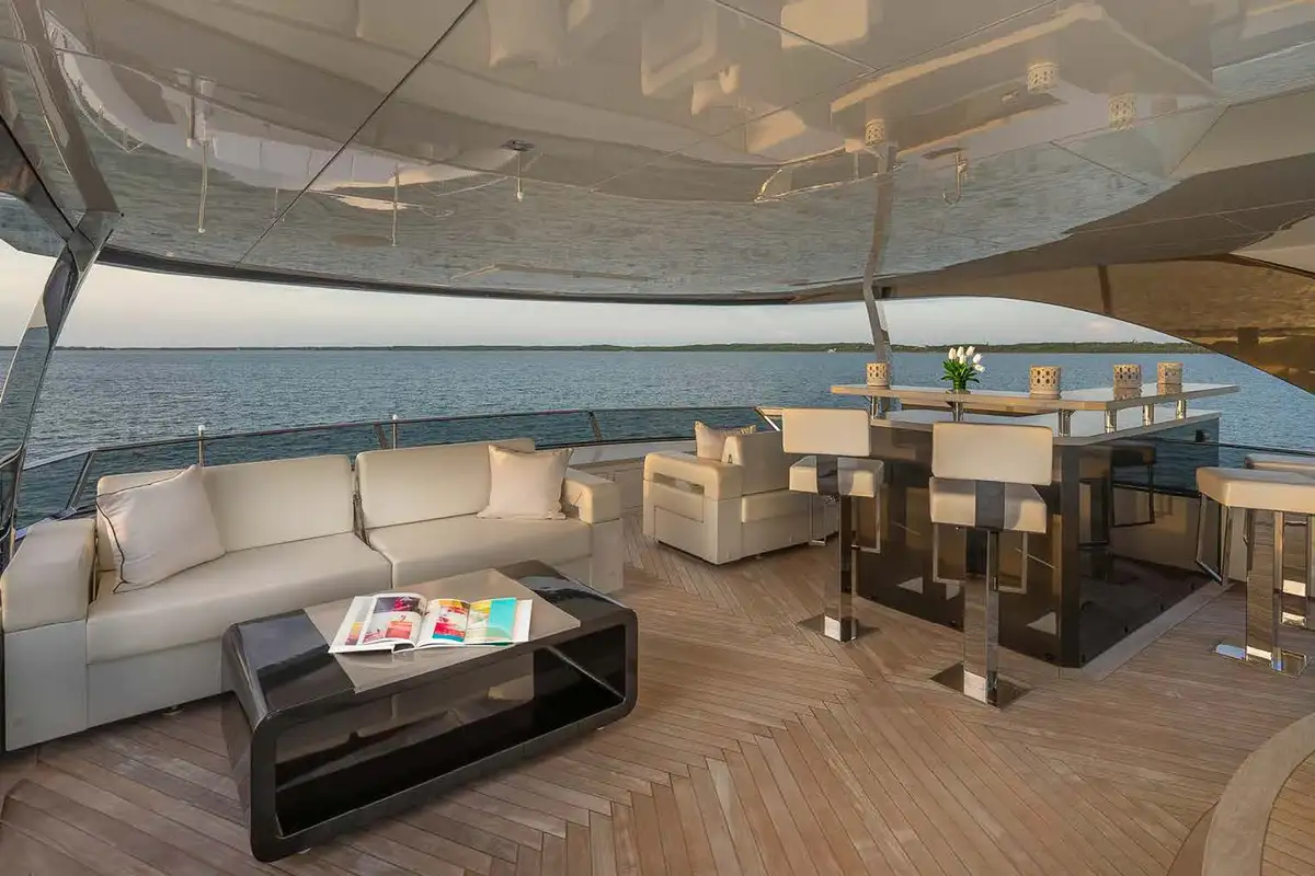 ENTREPRENEUR’s exterior provides a choice of splendid spaces for all times of the day. When the sun is high, the vast foredeck boasts a generous al fresco lounge area with forward-facing seating and wide sunpads. The sun deck is equally impressive, featuring a raised centerline jacuzzi, a wet bar, and ample sunpads for basking. Below, the upper deck features a stylish al fresco dining area and lounge, perfect for enjoying morning coffee and afternoon cocktails. The main deck cockpit provides comfortable aft-facing U-shaped seating for more casual gatherings.