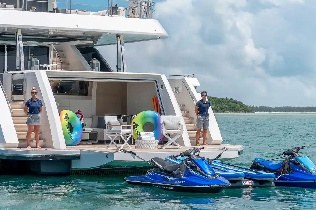 The swim platform leads to the beach club – a tranquil retreat with sofa seating, a bar area and skylight overhead. From here, guests can access the sauna and steam room, or head for a refreshing dip in the sea. The beach club also serves as a launch point for the yacht’s extensive collection of watersports equipment, including a 10m (33ft) Boston Whaler, waverunners, SeaBobs, paddleboards, a custom slide, and a floating splash zone with trampoline and jellyfish pool.