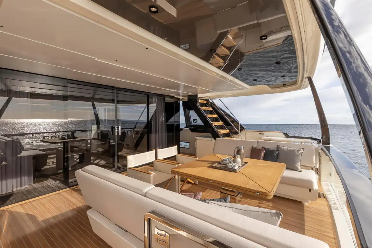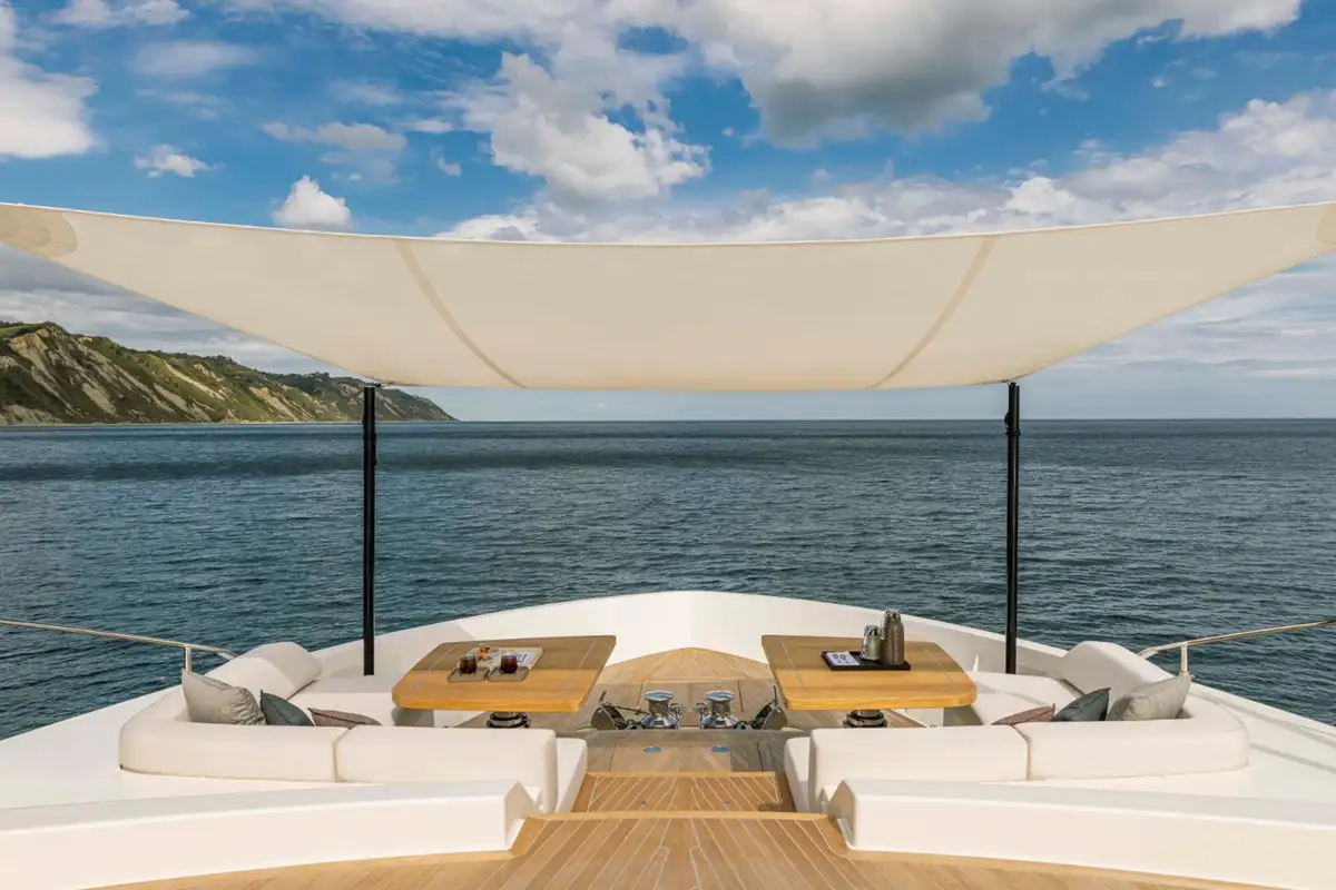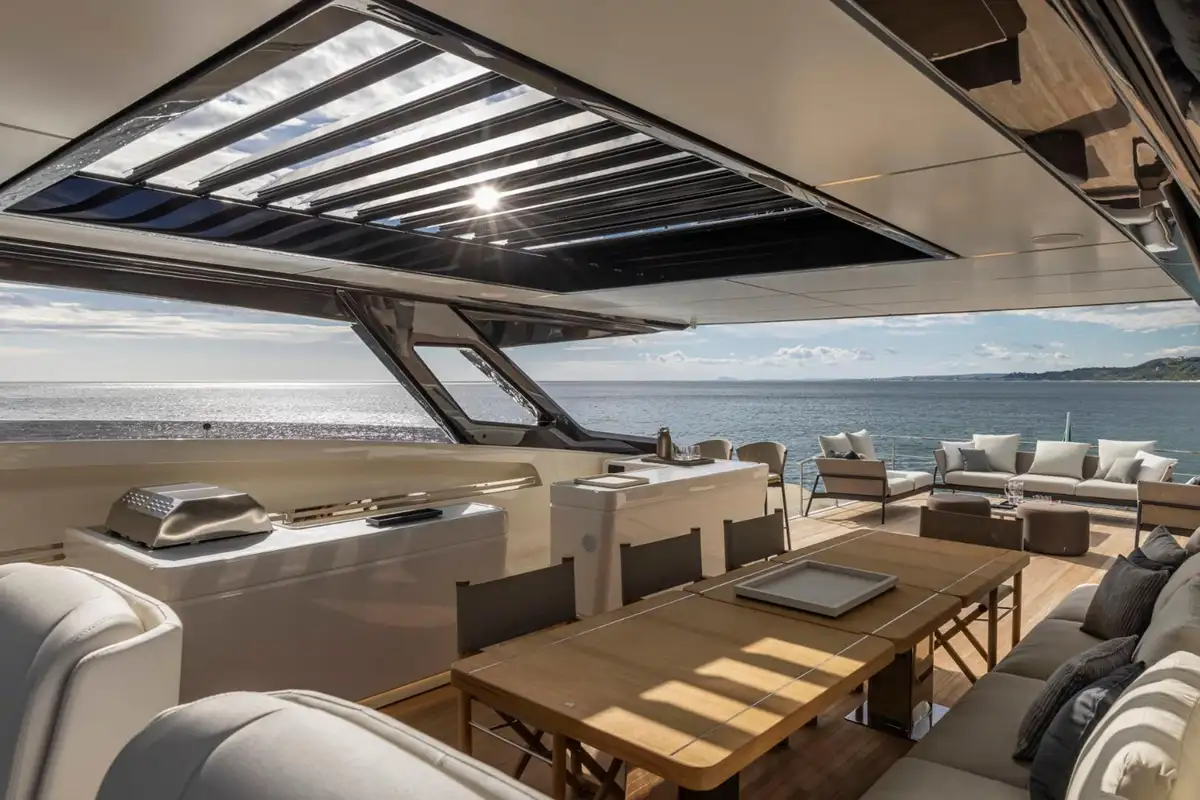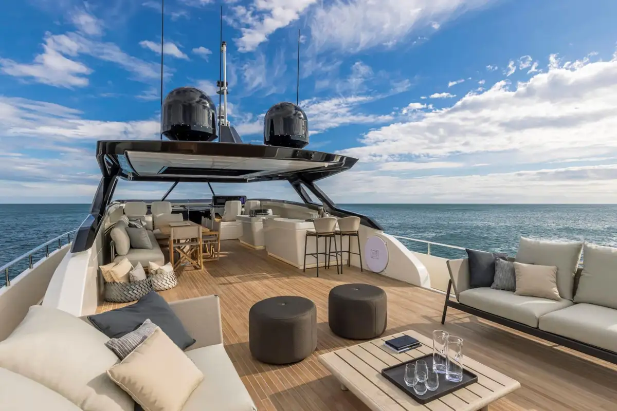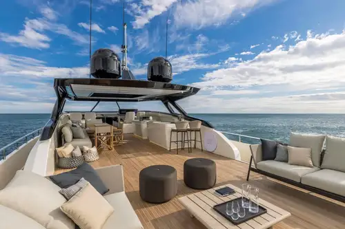 The Charterers and their guests can enjoy complete privacy and make the most of the exterior thanks to an extremely innovative and practical aft beach area and a spacious flybridge that is connected directly to the forward section.