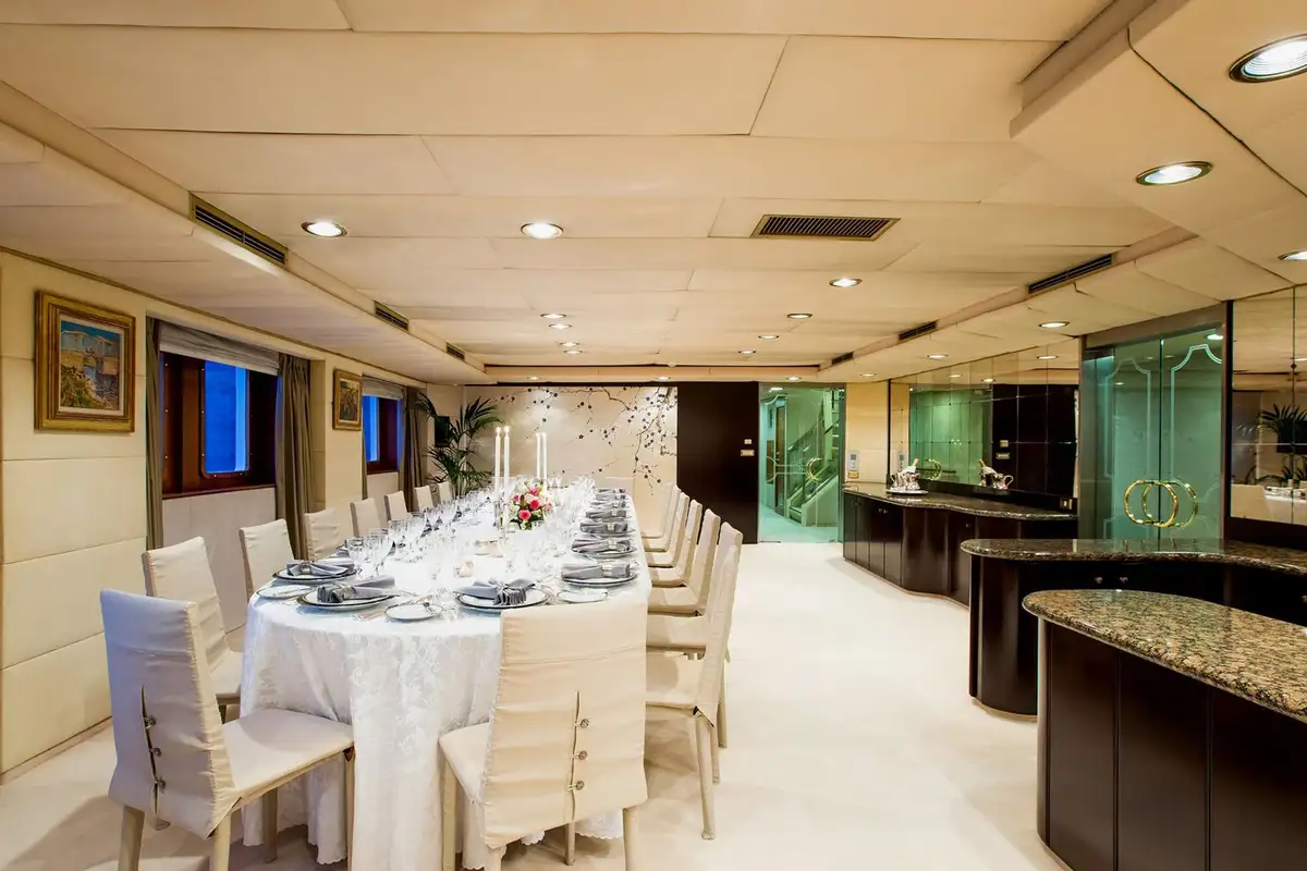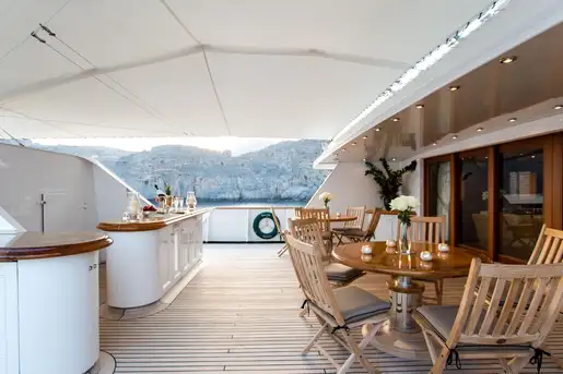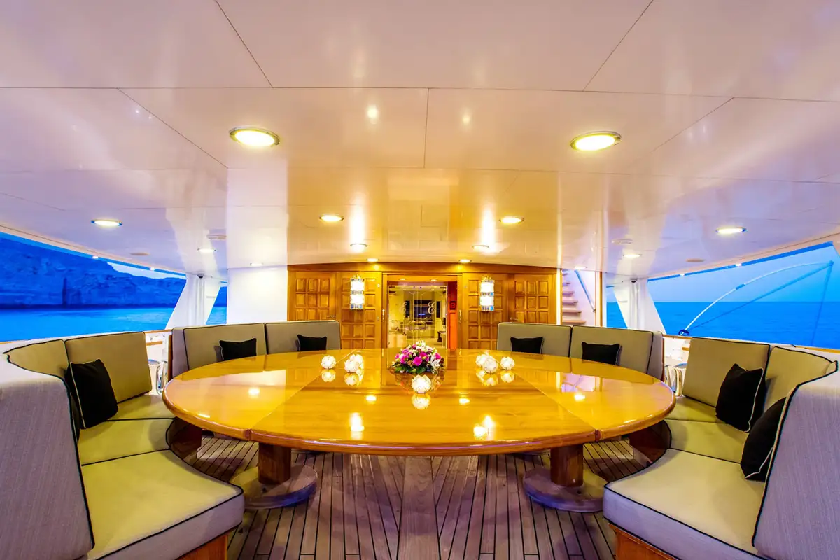 ESMERALDA has three gorgeous dining areas for you to choose from. Whichever you choose you can be assured of a memorable meal for all the right reasons. On the main deck, her formal dining area has seating for up to 18 guests. Her main aft deck has a social arrangement of two semi-circular seats facing each other around two tables that have an infill to make a single round table. For al fresco dining the dining area on the bridge deck is perfect. Three decks up with a buffet bar close by and a few steps from the bridge deck lounge and bar, this space can be set for breakfast as two separate tables or as one long dinner table for lavish banquets.