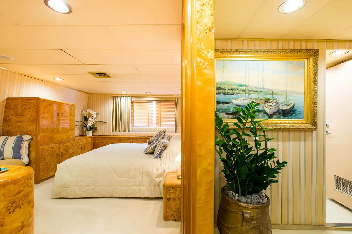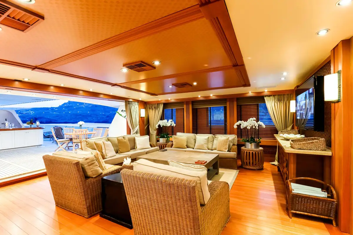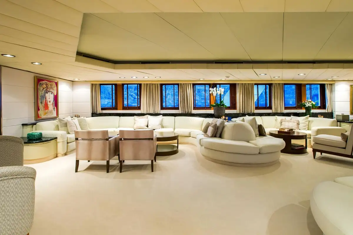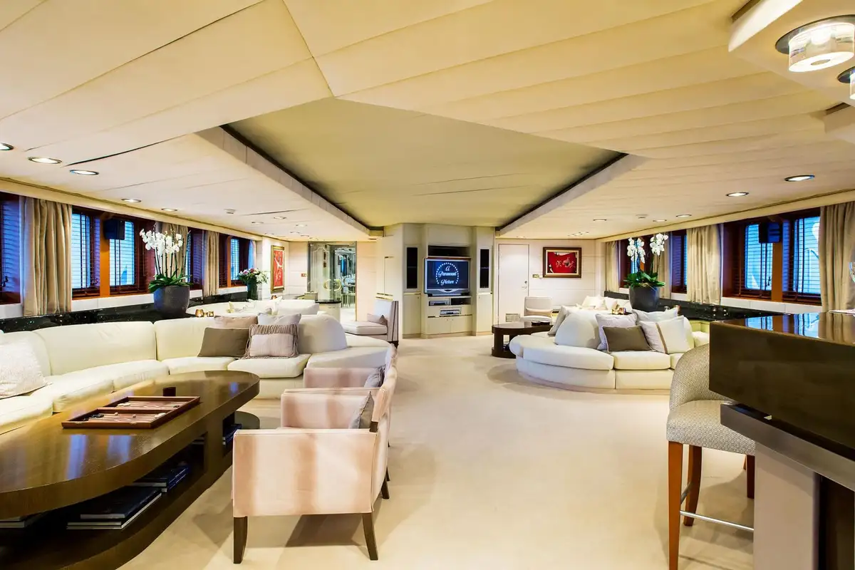 The upper (boat) deck has a further three more roomy double-berth suites. Two are double VIP suites with separate lounges and en suite bathrooms and the third is the opulent master suite. The master suite has separate his and hers bathrooms, a dressing room, a lounge area and a private gym.