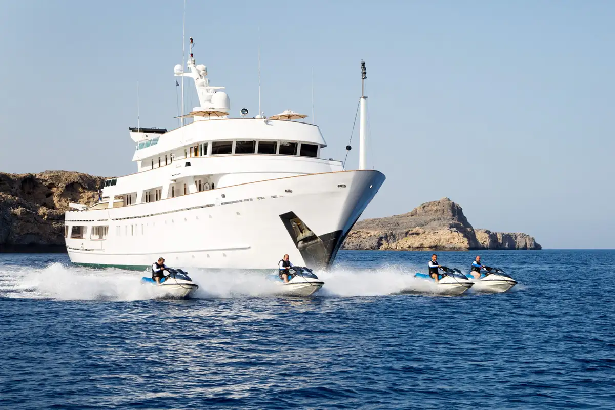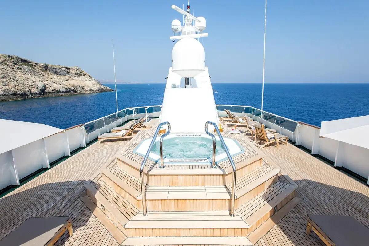 When ESMERALDA chef is not delighting you and your guests with their culinary delights, there is plenty more to keep you occupied during your time on board. There are a host of tenders, four SeaDoo PWC and water sports equipment: towable inflatables, skis, and wakeboards, scuba gear, paddleboards and an inflatable island. For those looking to relax there is the sun deck. Here you’ll find the central raised jacuzzi and plenty of sun loungers to soak up the sun from.
