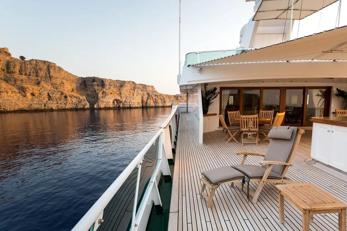 ESMERALDA and her attentive crew can host 12 guests (and 6 supernumeraries) in 11 spacious suites located on the main deck and upper (boat) deck. The main deck guest suites are forward of the yacht’s vast main saloon bar and lounge area. To starboard, there are three twin-berth suites to port ESMERALDA’s large formal dining area. Further forward there are four more twin-berth suites and a delightful double suite.