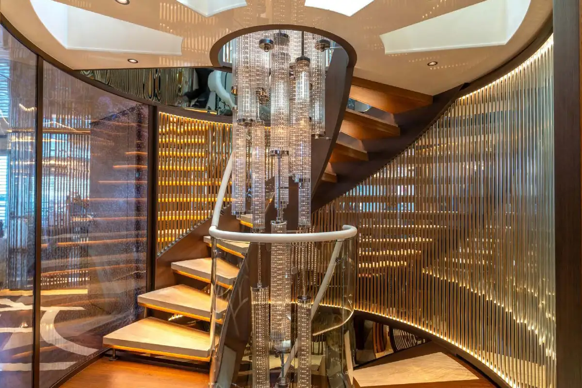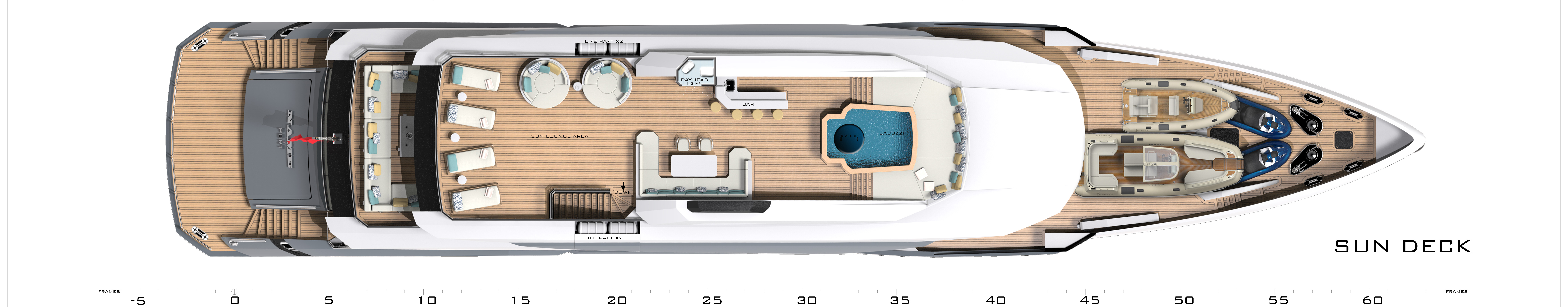 It’s sure to impress, especially the stairwell with its central glass sculpture shimmering in natural light from the jacuzzi above. As well as style, there’s plenty of substance too. ETERNAL SPARK features a gym, sauna, beach club, jacuzzi, movie theatre and two tenders, including a custom-made aluminium 10m chase tender.