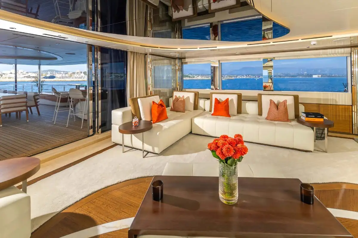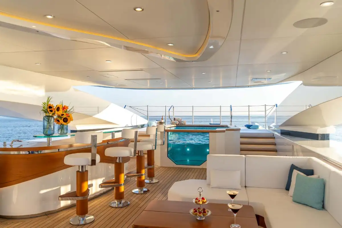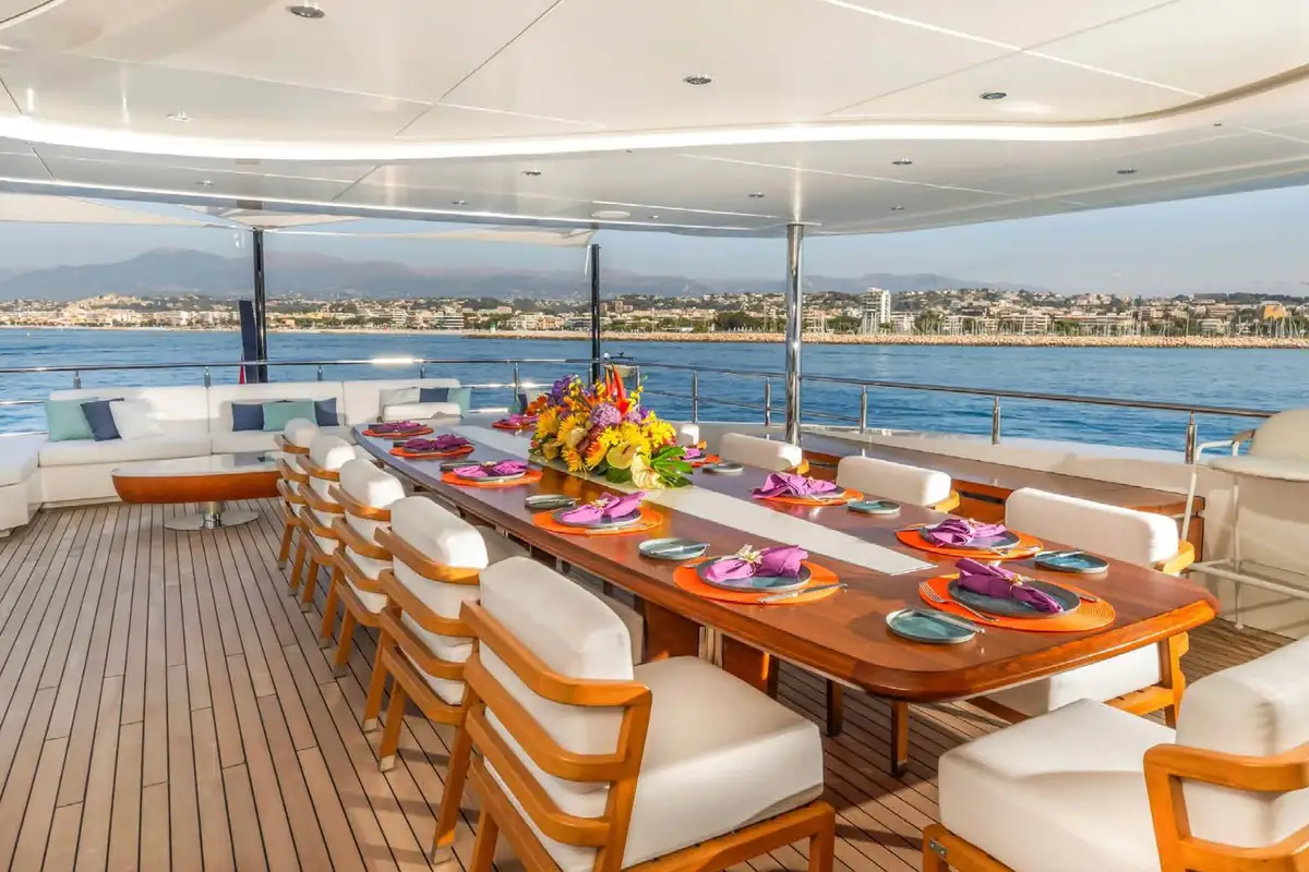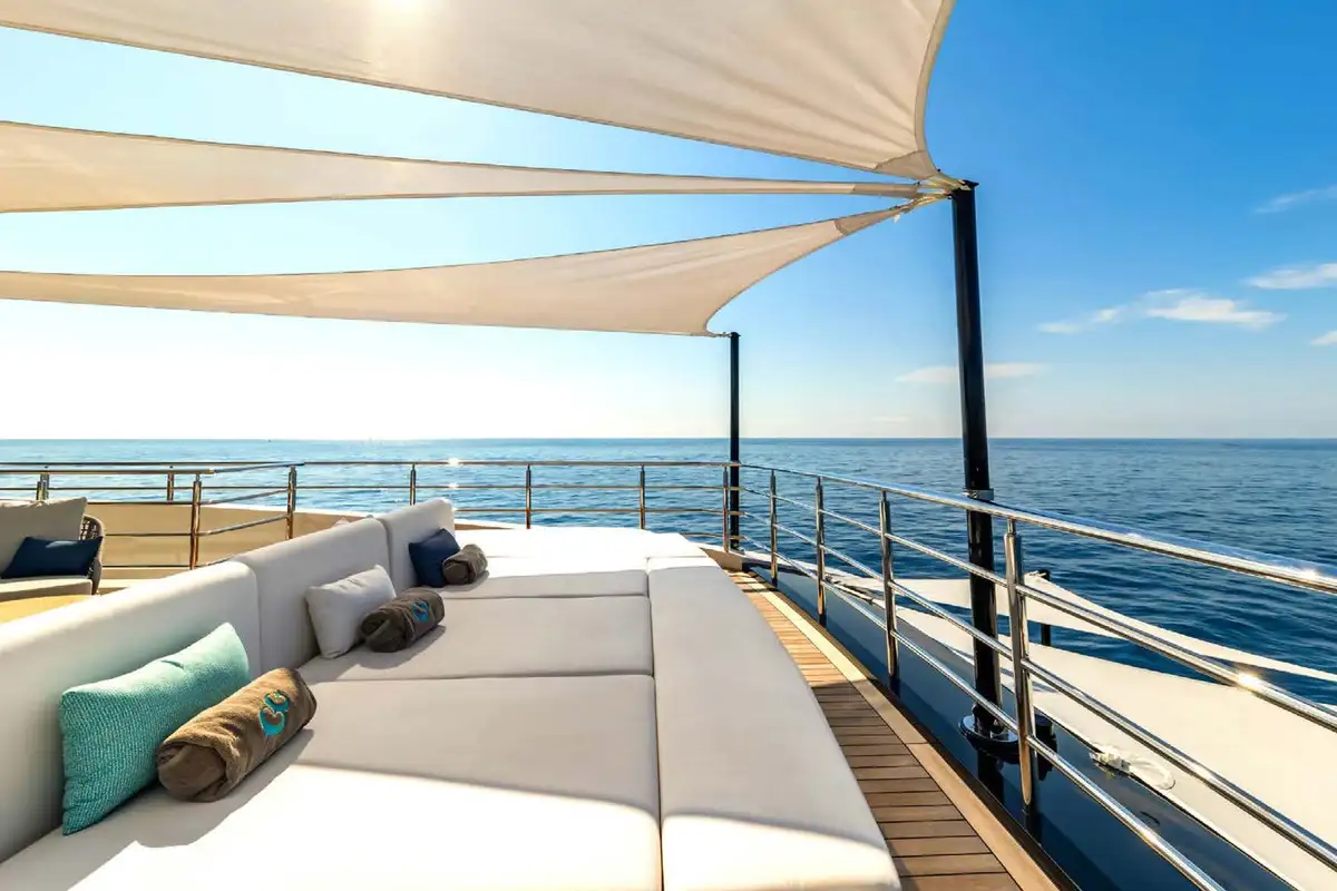 For lunch, you and your guests head up to the upper deck aft dining area, shaded from the midday sun by the deck above. From one anchorage to the next, you can catch a movie in the cinema, enjoy a soak in the glass-baked jacuzzi, relax on the main deck aft lounging area or watch the Mediterranean scenery drift by from the foredeck sofa and sun pads.