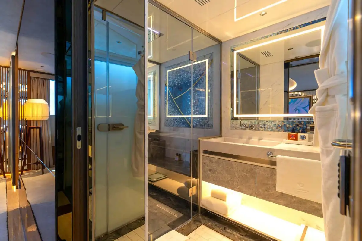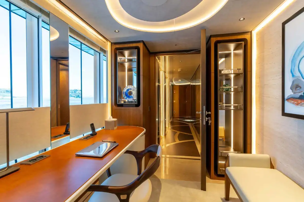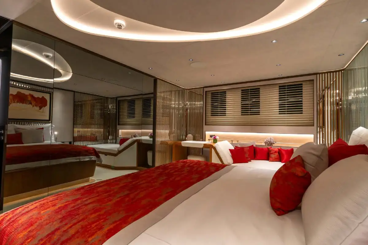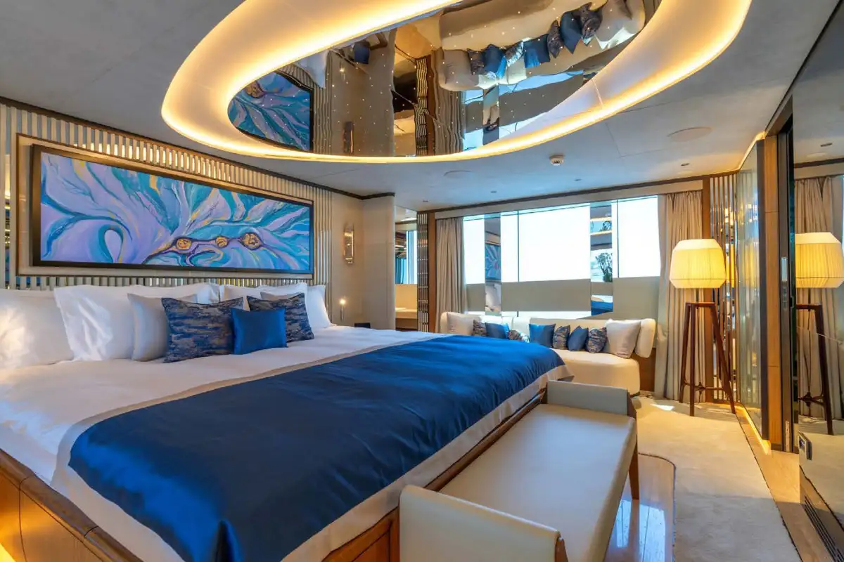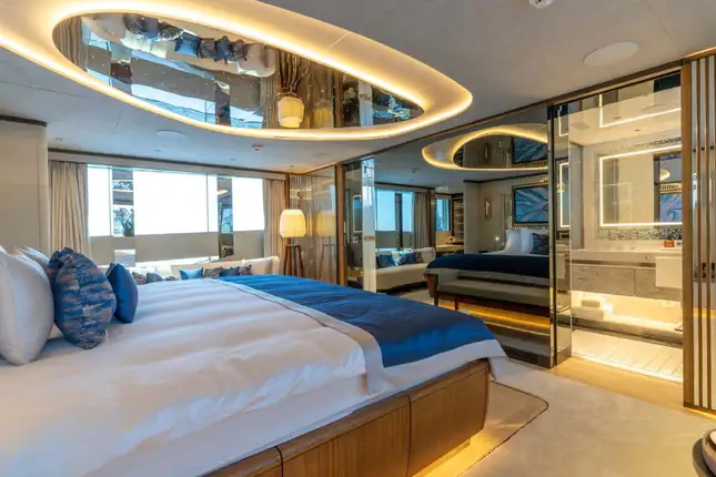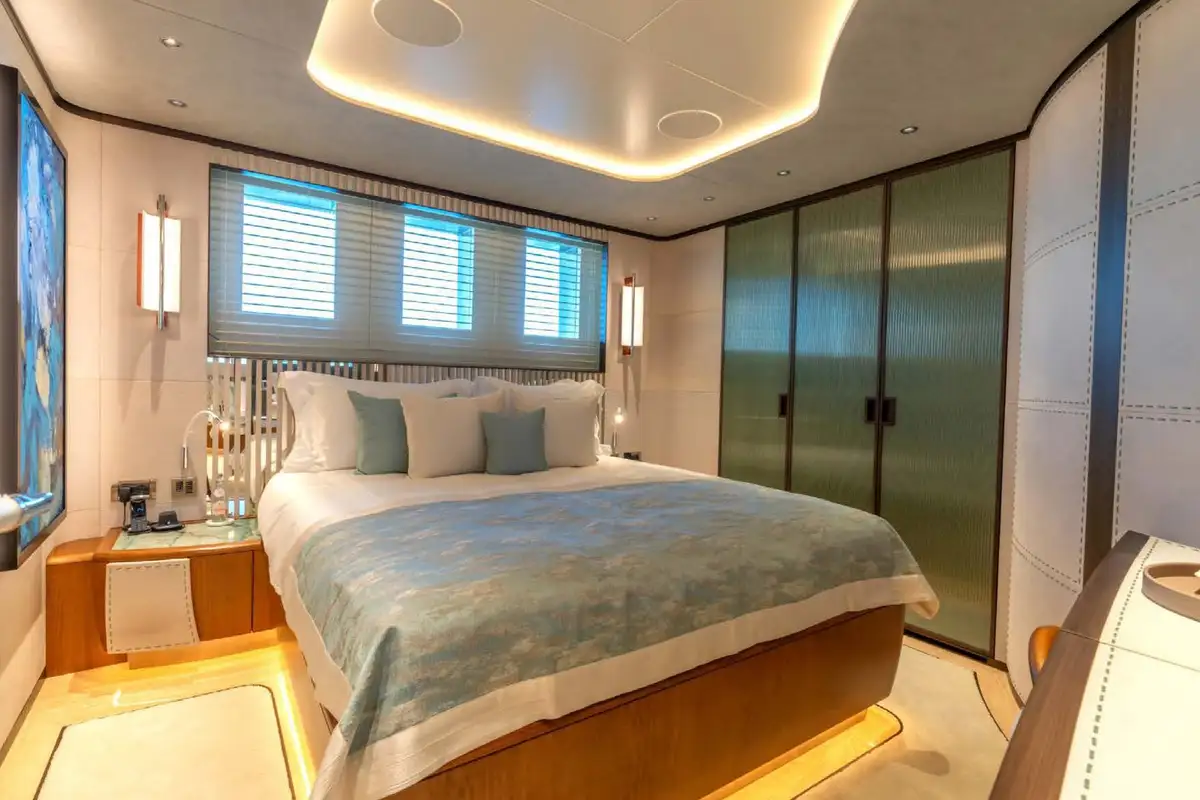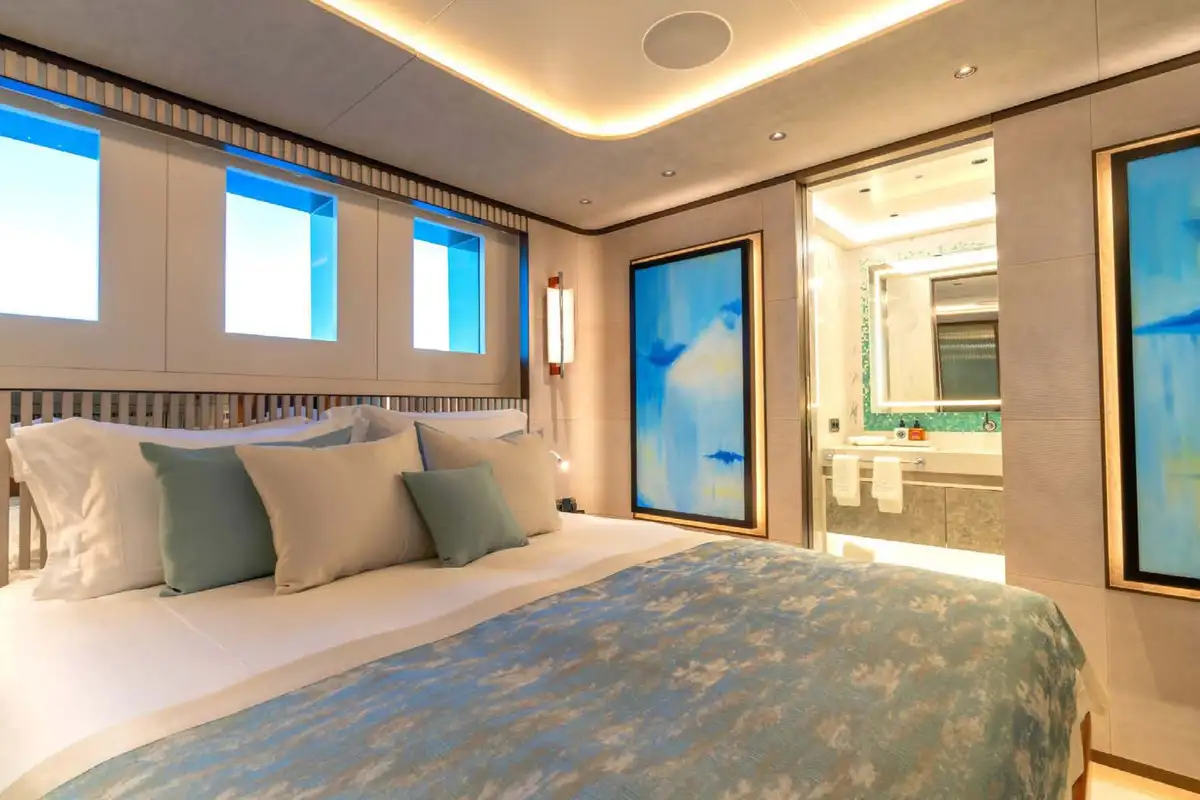 Step into the sumptuous main deck master cabin, which spans the full width of the yacht. You have an office to catch up on emails, a dressing room and his and hers en suites which share a large shower room. When you’re ready for the day, join your guests on the upper deck aft where the chef has rustled up freshly baked pastries, a selection of fruits, and eggs just how you love them, and whatever else your heart might desire.