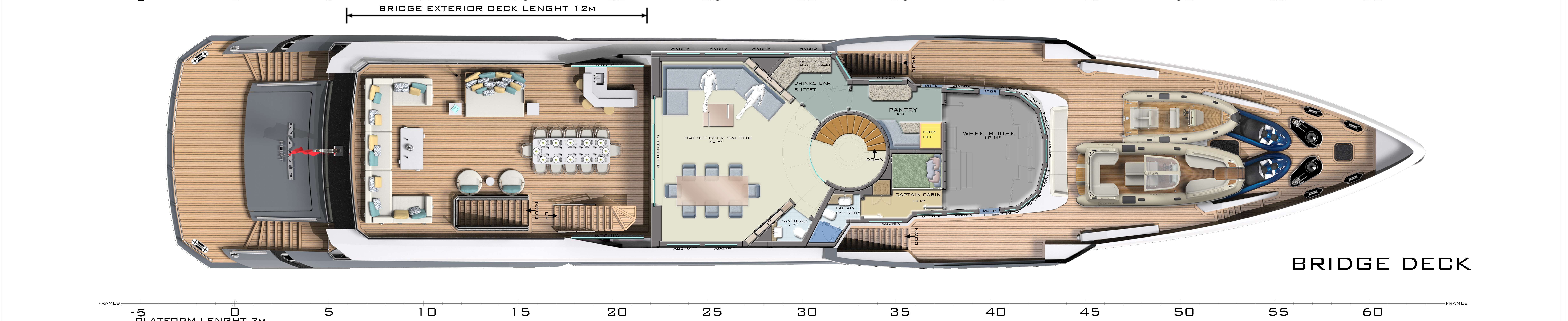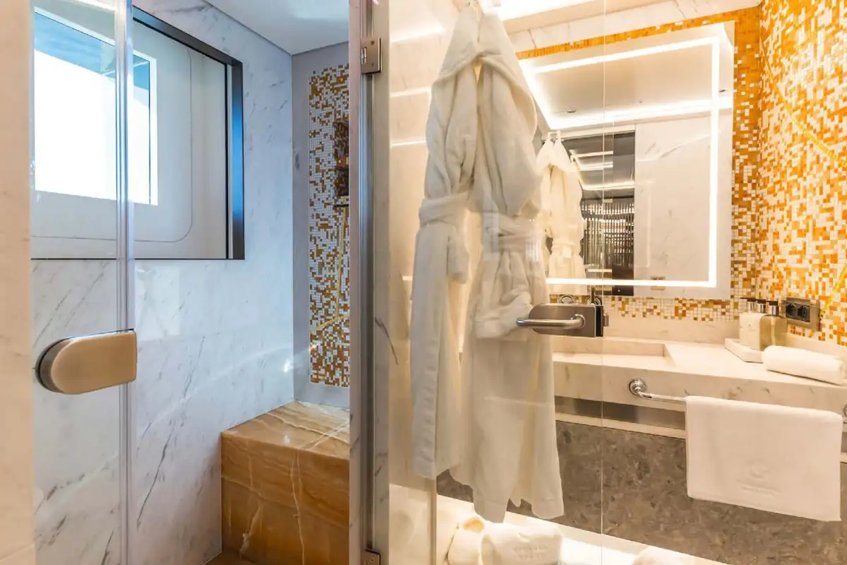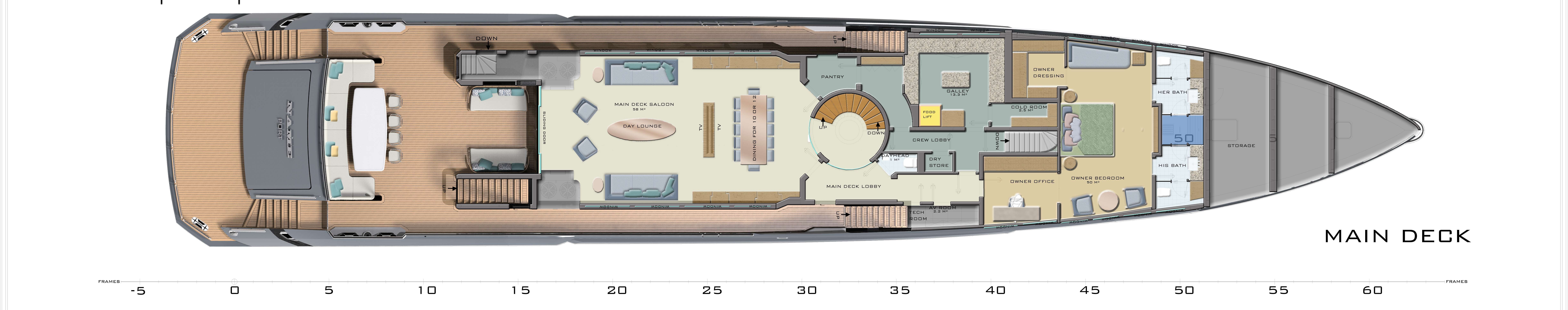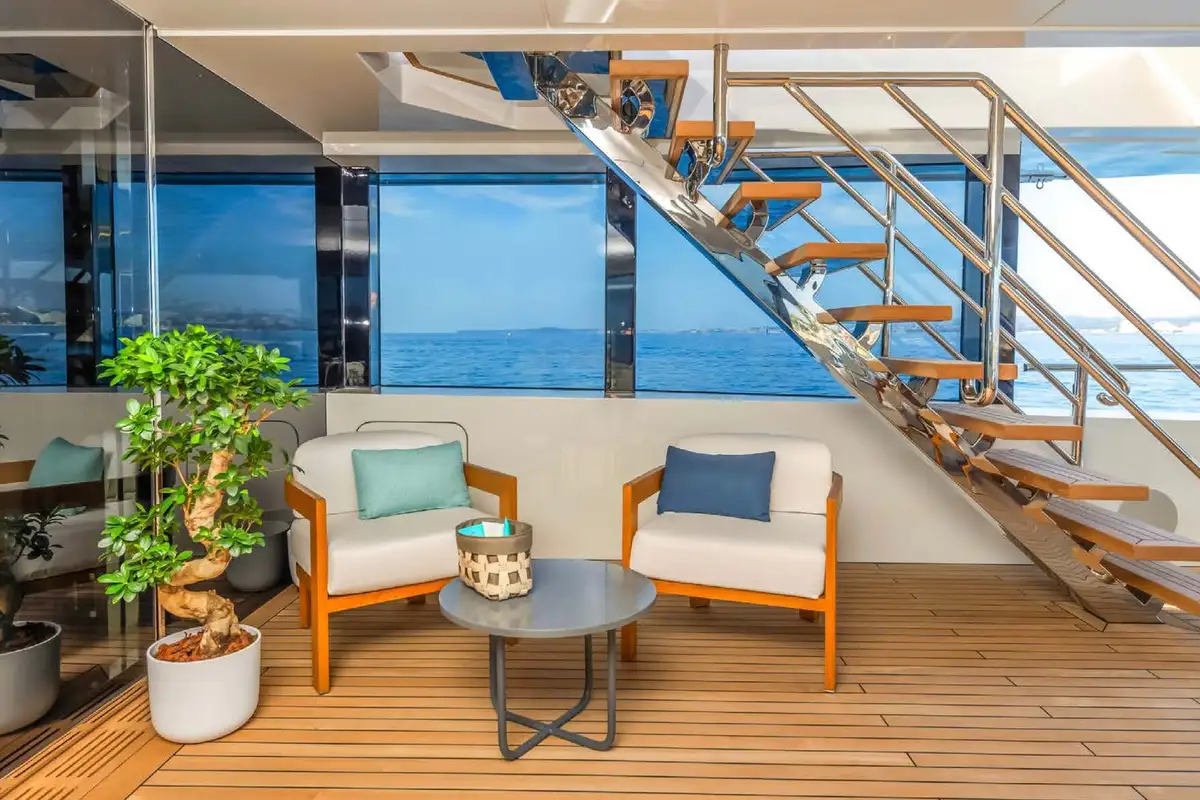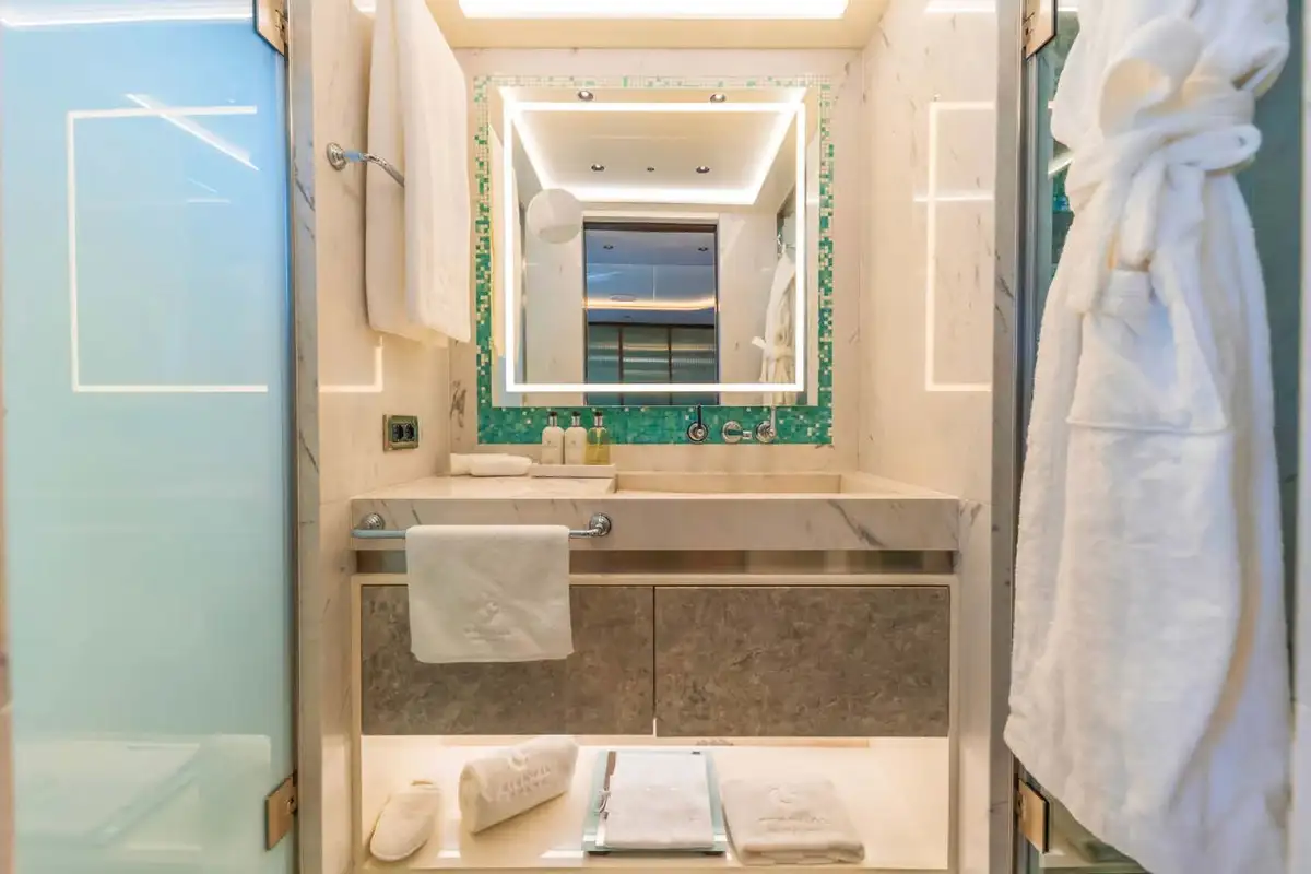 Step into the sumptuous main deck master cabin, which spans the full width of the yacht. You have an office to catch up on emails, a dressing room and his and hers en suites which share a large shower room. When you’re ready for the day, join your guests on the upper deck aft where the chef has rustled up freshly baked pastries, a selection of fruits, and eggs just how you love them, and whatever else your heart might desire.