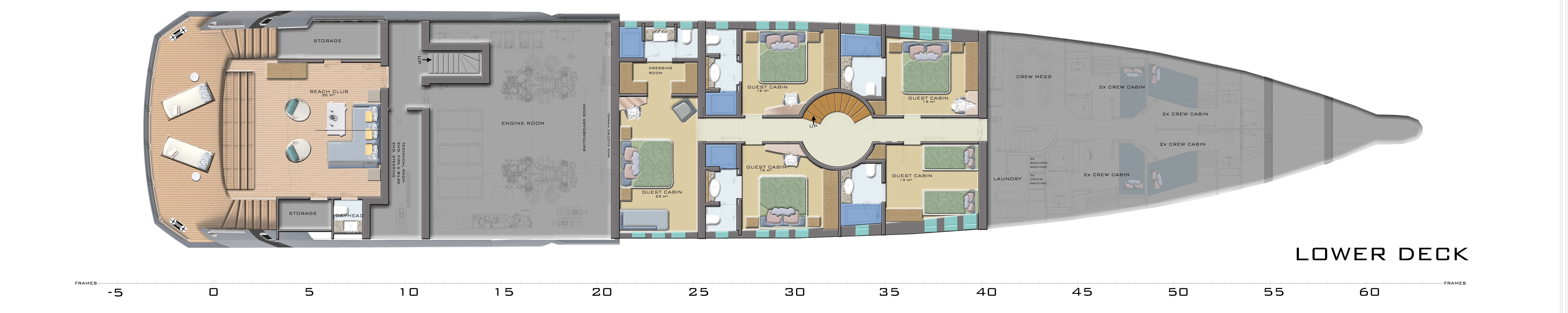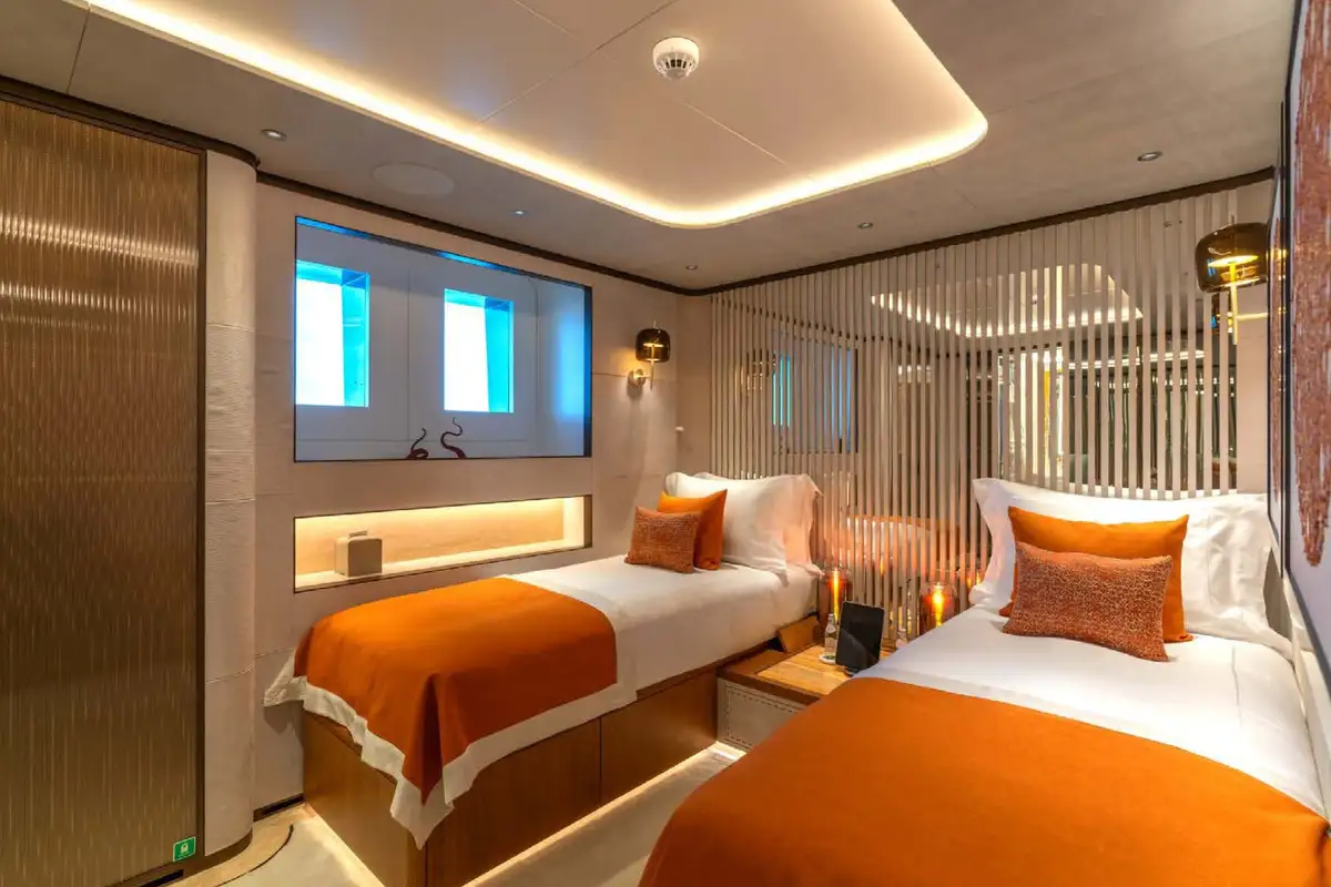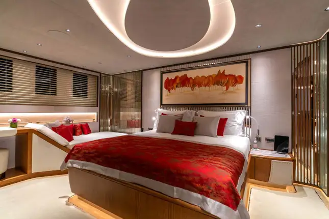 As the night draws to a close, you and your guests can retire to the lower deck where versatile, family-friendly accommodation awaits. There is a master cabin running the full width of the yacht, two double cabins and two convertible cabins, doubles or twins as required, all of which are en suite.