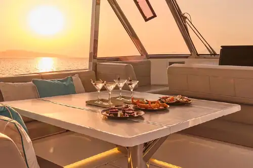 Her flybridge is a great social hub where guests can gather while cruising from one destination to the next, with 360° panoramic views and a hardtop above providing shade. There are observation seats up front, a lounge-dining area amidships, a fridge and barbecue grill, and sunloungers facing astern. Companionways on both sides of the flybridge lead around it and forward to the sunpads and seats on the coachroof, and steps lead down to the main deck aft cockpit where there’s a sit-up bar and banquette seats with a table.