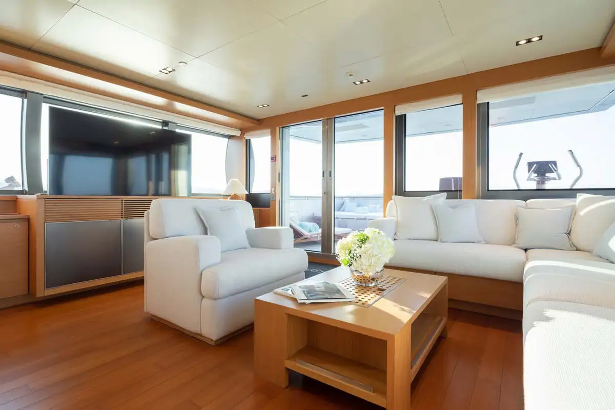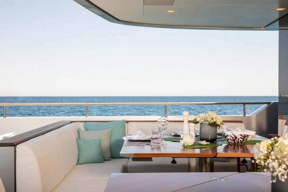 FALCO MOSCATA’s blend of al fresco living spaces are complemented by her two warm and welcoming interior lounges. Natural white and grey stained brushed oak panelling and teak floors provide the backdrop to a neutral colour palette. There is nothing formal about her interior set up, rather it provides the perfect retreat when cruising colder climes, or an area to chill out in when the sun is at its height.