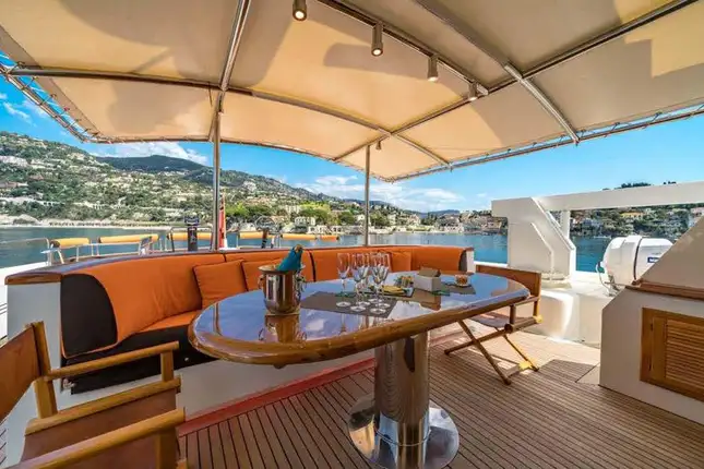 A handsome 37m (122ft) FIORENTE tri-deck yacht in excellent fettle with crisp exterior lines and some lovely classic design features, is the picture of tasteful elegance. She’s designed to host up to 10 guests on board in five cabins, with some excellent living spaces inside and out.