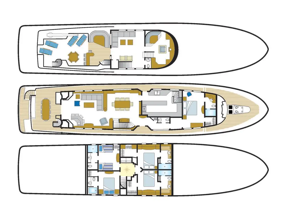 Key features include an abundance of outside living space with ample shade on all three levels, a superb and spacious main deck lounge, a master suite up front on the main deck, an excellent inventory of watersports equipment, and state-of-the-art stabilisers that minimise any rolling motion when she’s anchored or under way.