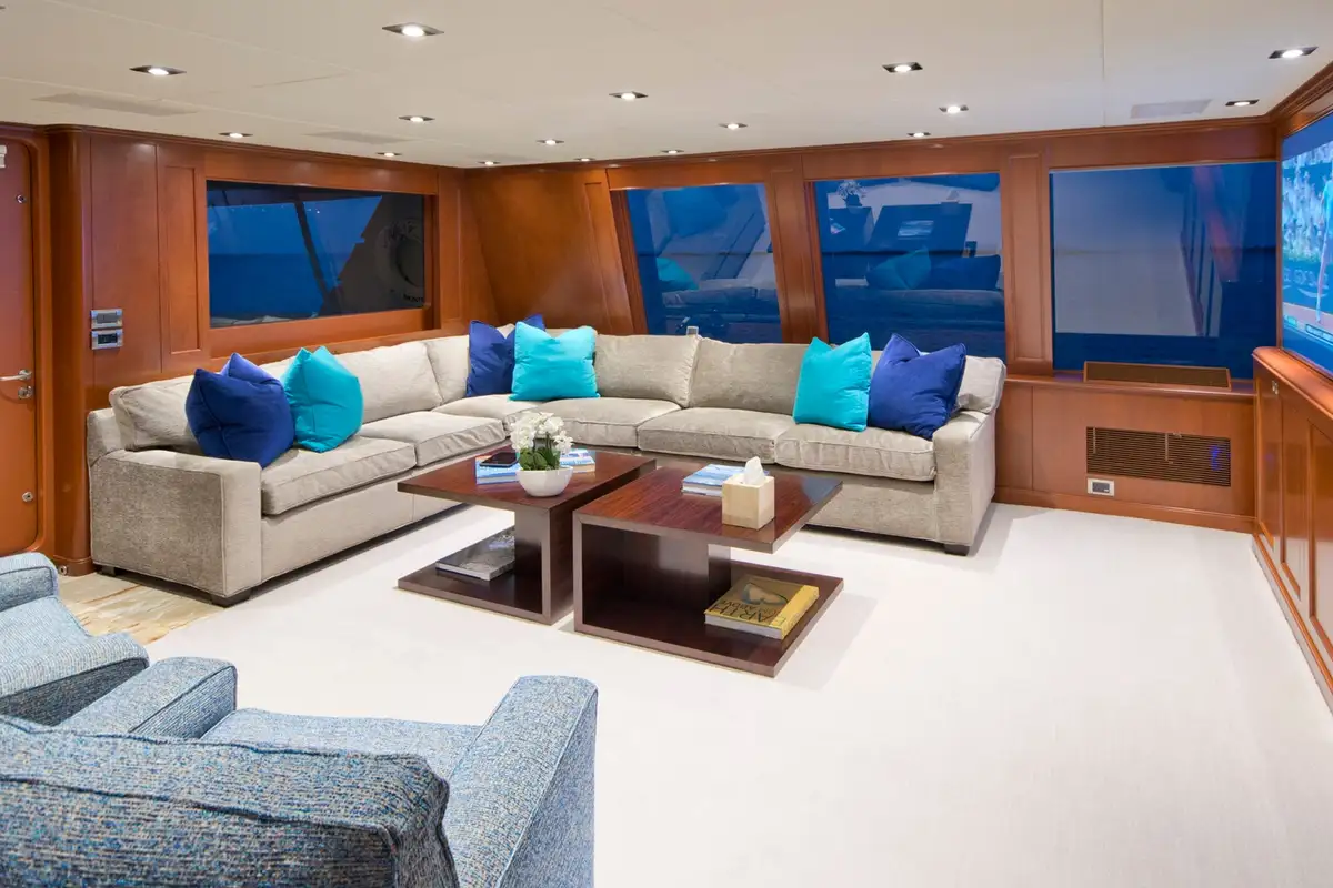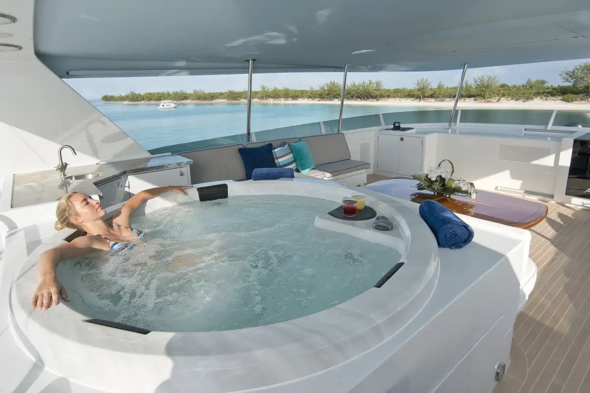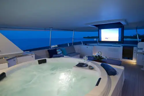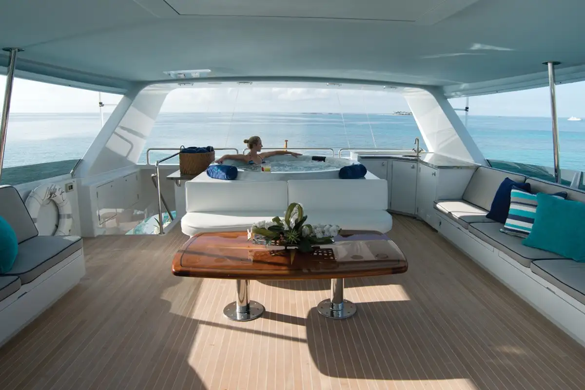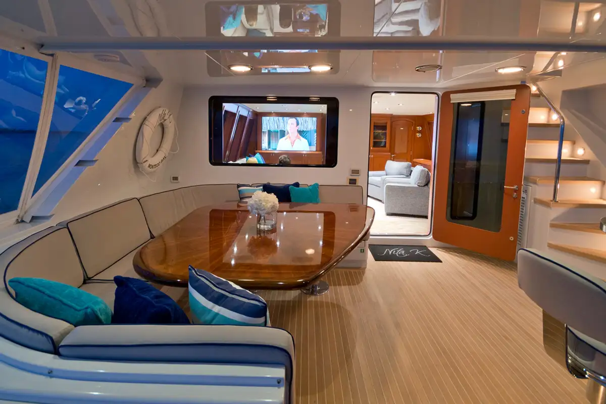 Her sundeck has a jacuzzi pool with a big TV and a hardtop above for shade. The upper aft deck is a great open-air social hub with a sit-up cocktail bar and a nice arrangement of seating, lounging and dining areas. From here you can step straight into the skylounge, which is a cosy living room with comfy sofas and a huge TV – it’s ideal for a cosy movie night on board.