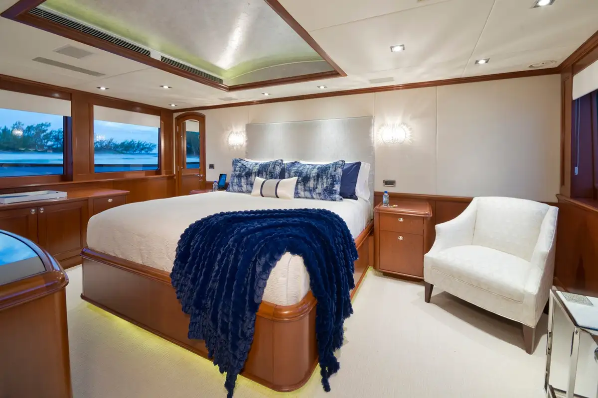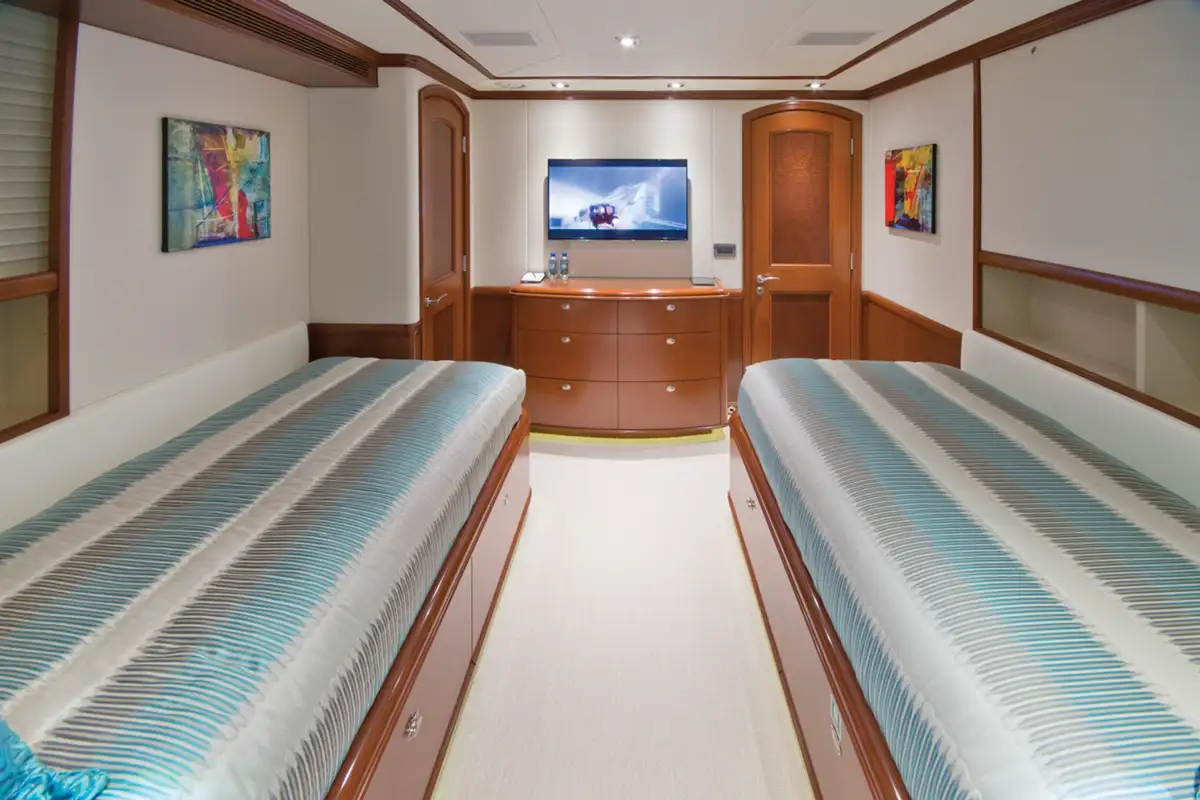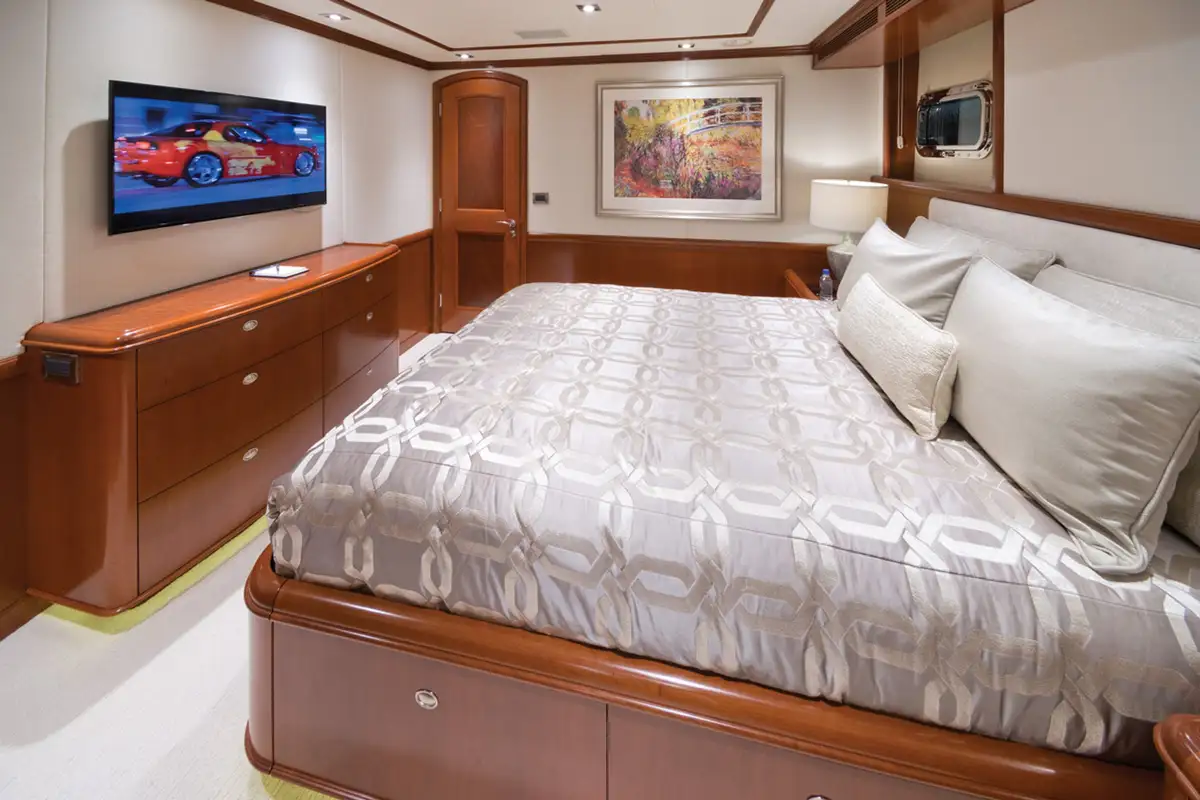 FOUR ACES has refined modern-classic exterior styling with clean, crisp lines – she’ll look great in your holiday photos. Her interior is an elegant, inviting and soothing place with fine craftsmanship clearly evident in the American cherry wood finish and touches of luxury throughout. She’s designed to host up to 12 guests on board in a five-cabin layout, with service from a crew of six.