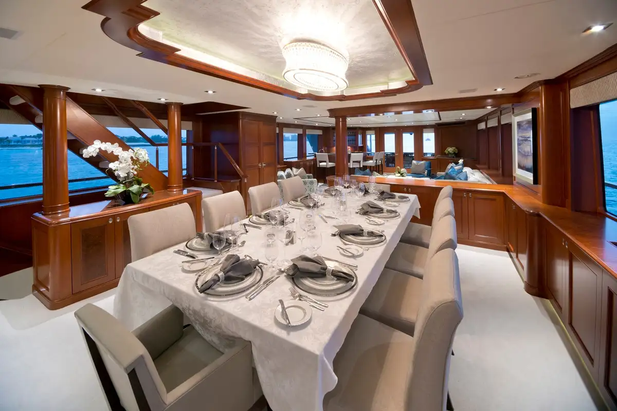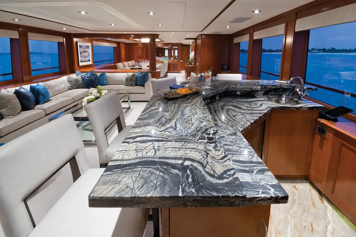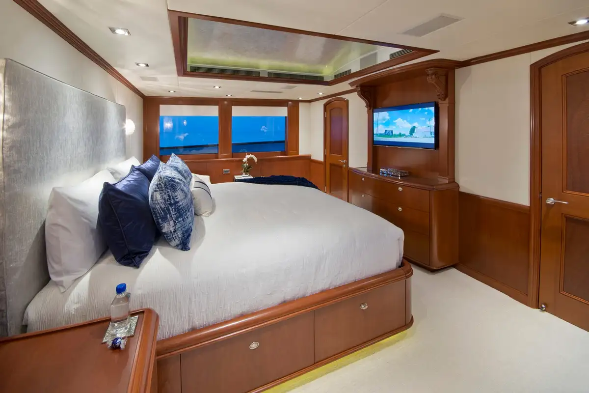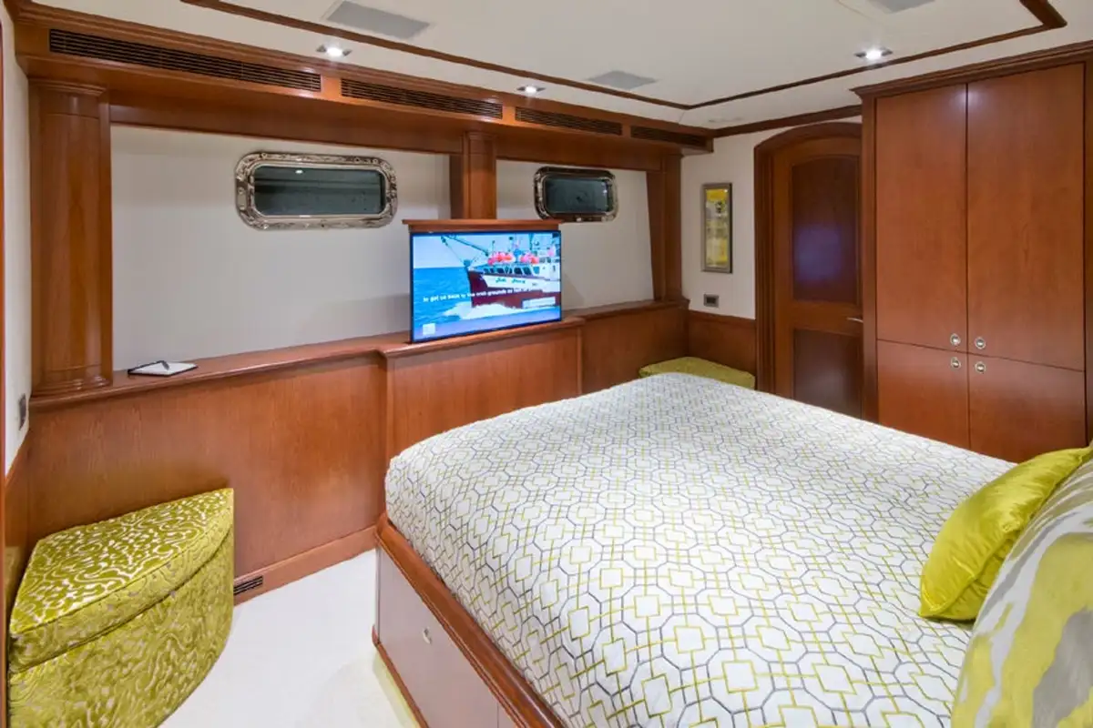 FOUR ACES has refined modern-classic exterior styling with clean, crisp lines – she’ll look great in your holiday photos. Her interior is an elegant, inviting and soothing place with fine craftsmanship clearly evident in the American cherry wood finish and touches of luxury throughout. She’s designed to host up to 12 guests on board in a five-cabin layout, with service from a crew of six.