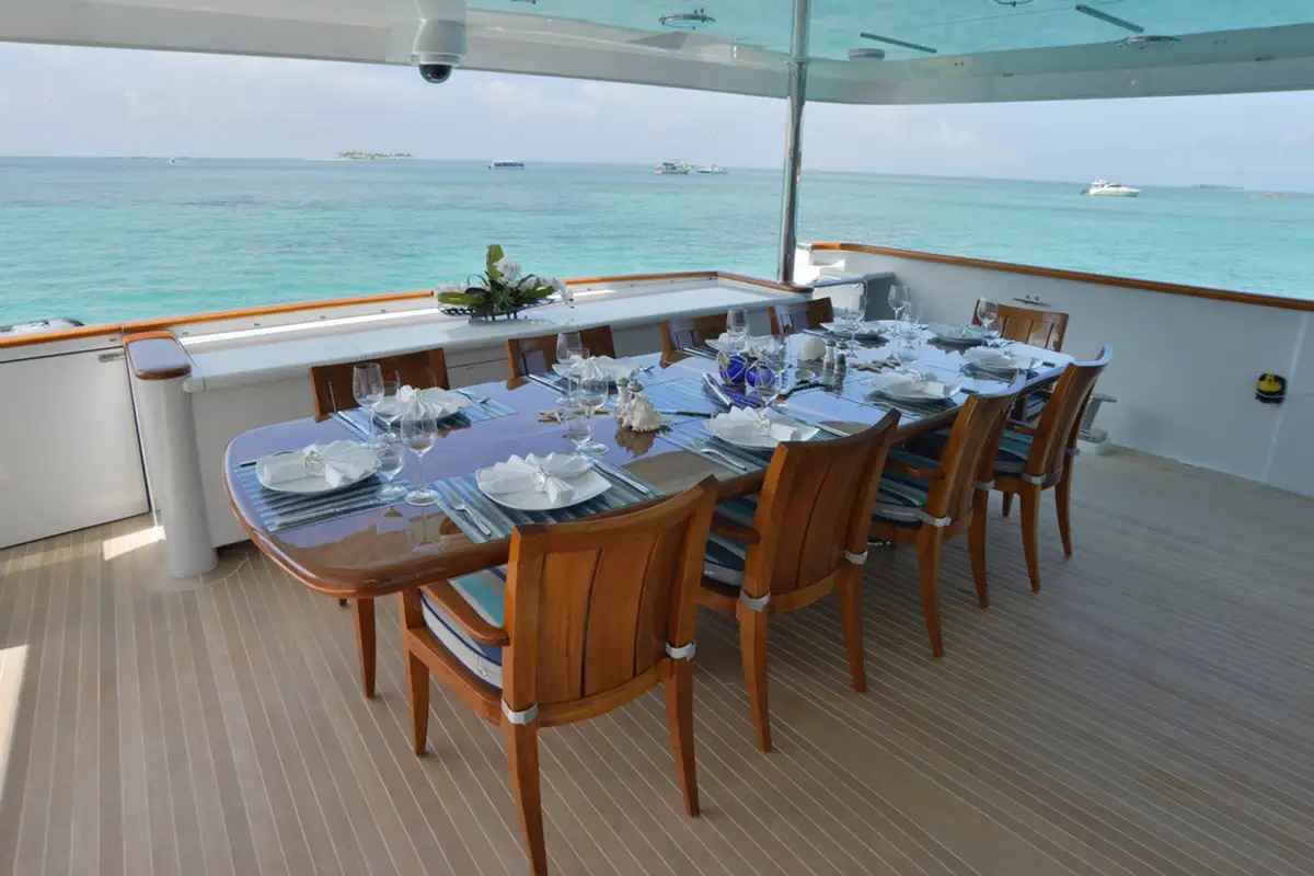 The main deck aft is dedicated to al fresco dining with ten armchairs around a big table. Moving into the main deck lounge, you’ll find another cocktail bar and a comfortable, elegant lounge, plus a stylish formal dining area up forward. There are excellent sea views from anywhere you might choose to sit and it’s an open, airy space with plenty of natural light.