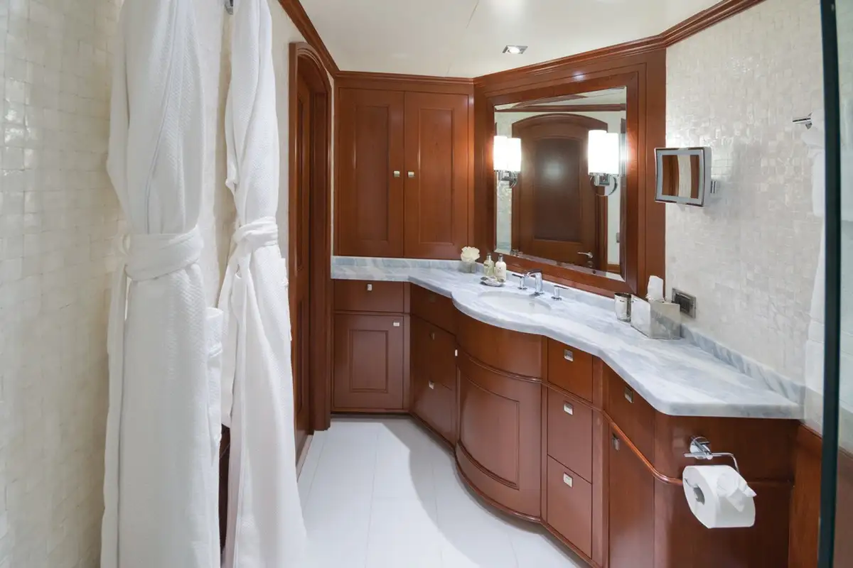 The master suite has a bright and relaxing feel, with two big windows on each side of the king size bed. Her other four guest cabins, all on the lower deck, are two doubles with queen size beds and two twins with extra pullman bunks, which are ideal for children. All cabins have their own private en suite bathrooms.