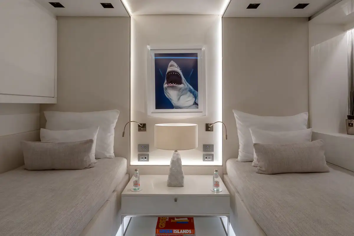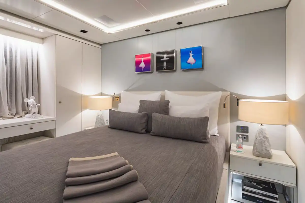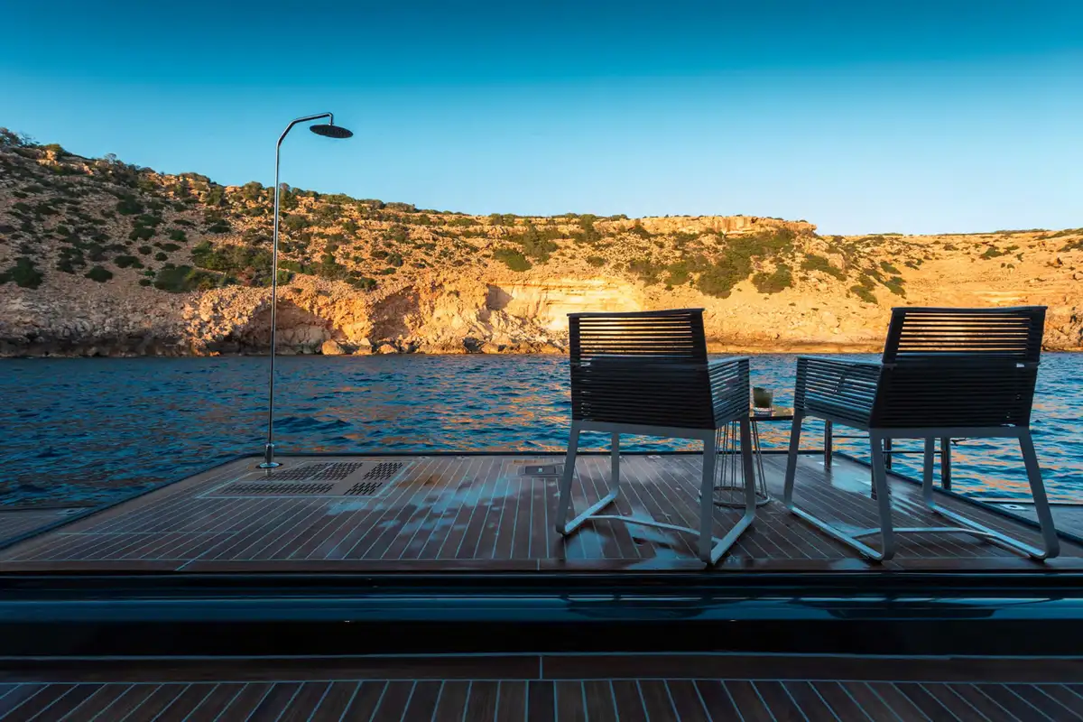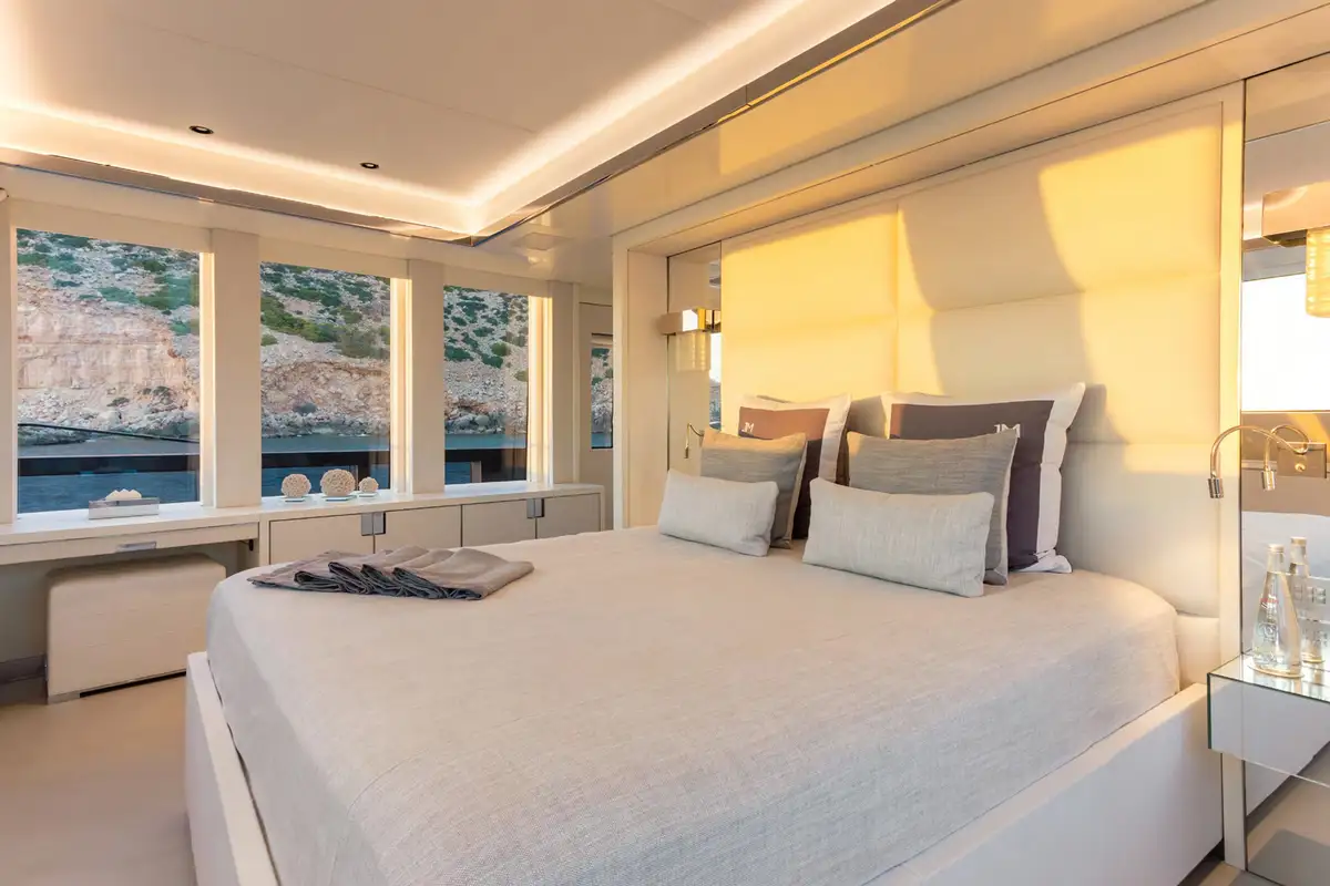 Accommodating up to 12 guests across six cabins, the primary master suite is on the main deck while the remaining cabins – four double and one twin – can be found on the lower deck. To see to your every need, nine highly skilled crew ensure a relaxed luxury yacht charter.