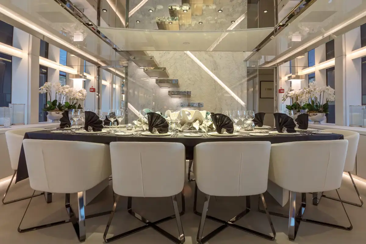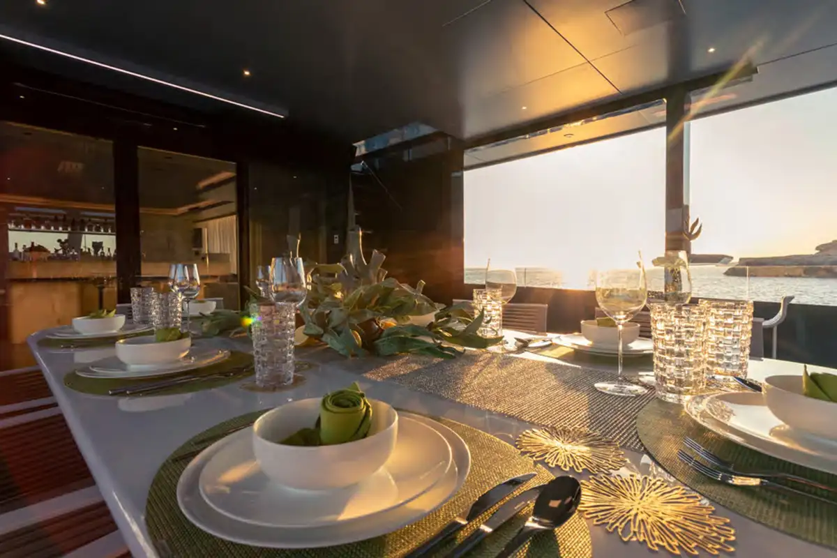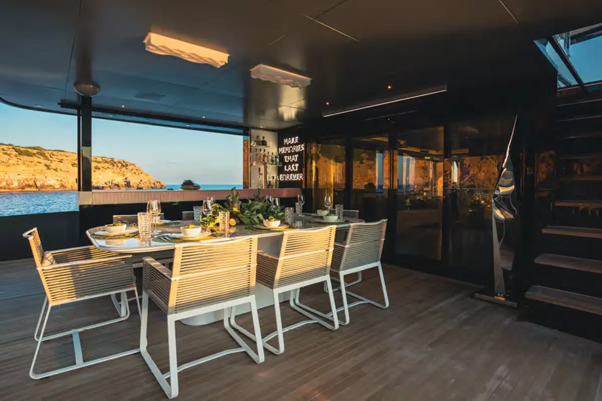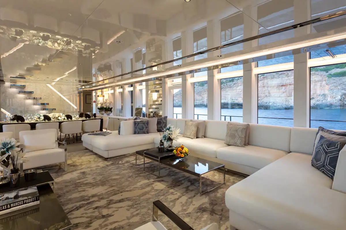 Accommodating up to 12 guests across six cabins, the primary master suite is on the main deck while the remaining cabins – four double and one twin – can be found on the lower deck. To see to your every need, nine highly skilled crew ensure a relaxed luxury yacht charter.