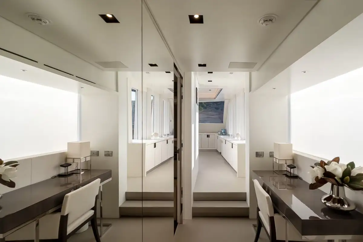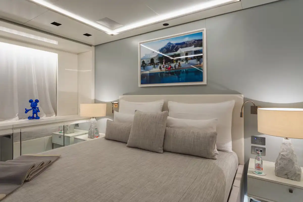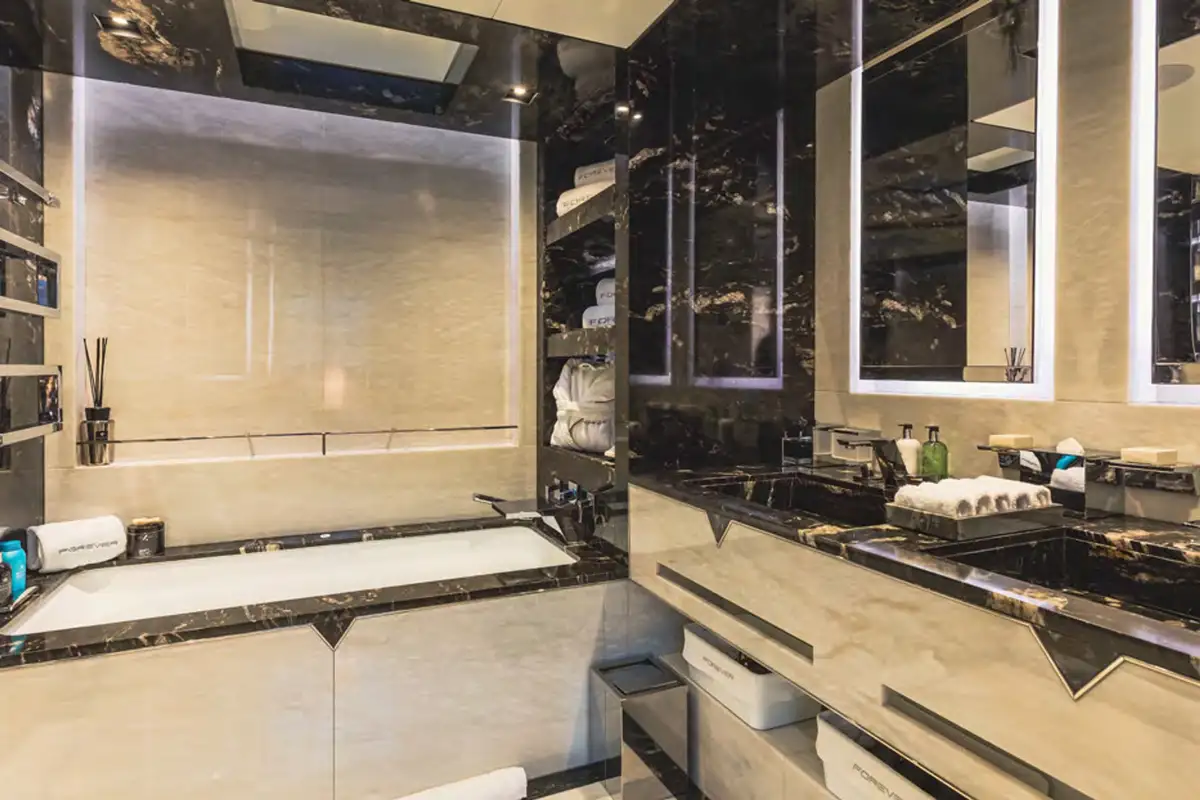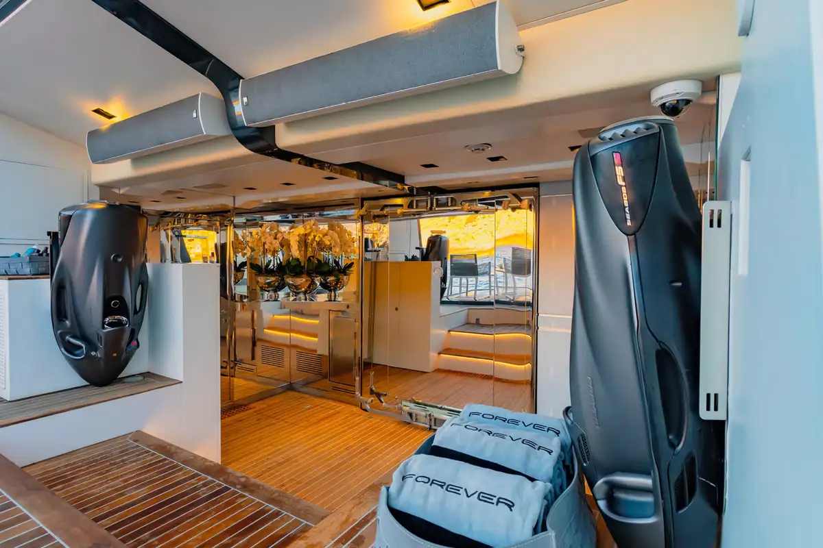 Inside, FOREVER adopts a Miami beach style with accents of brushed marble and Loro Piana lined walls. With a modern aesthetic, light colour palette, and extensive use of glass, the main saloon feels more like being in a penthouse apartment than on a yacht. Elsewhere inside, work up a sweat in the on board gym before relaxing aching muscles in the steam room.