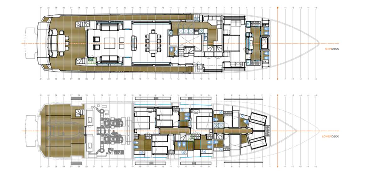 Up on the sun deck, guests will find a low-profile jacuzzi, elegant dining space, and open-air lounge areas; this whole space is designed for relaxation and entertaining. The expansive foredeck, accessible from the side decks, features a large sunpad and forward-facing seating – the perfect spot for a morning coffee or a sunset aperitif.