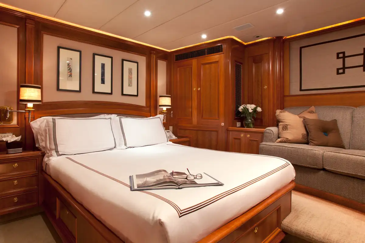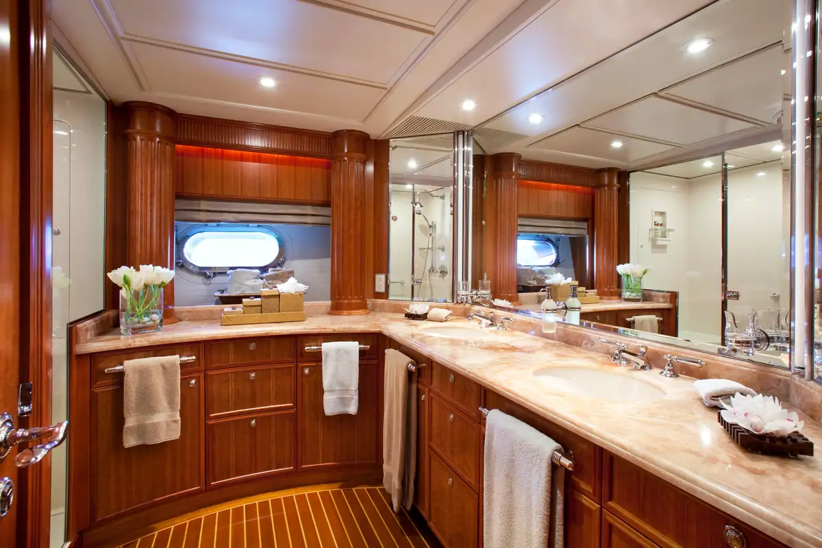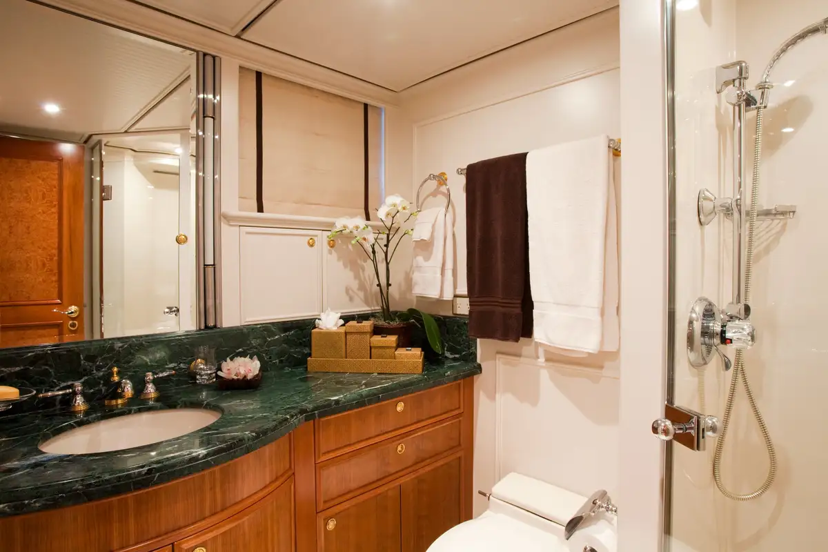 Head to the lower deck to change for dinner. The full beam master suite has ample storage, as well as a spacious en suite bathroom for a sailing yacht of this length. A VIP queen suite, double cabin with fixed upper single berth, and twin cabin complete the accommodation arrangement.