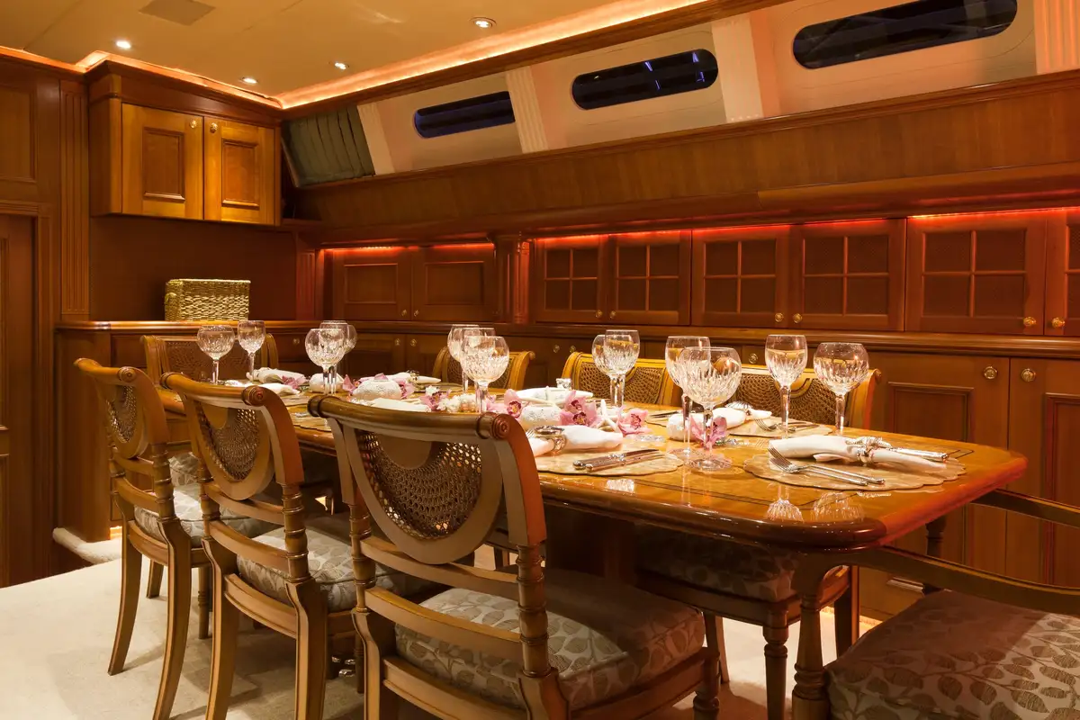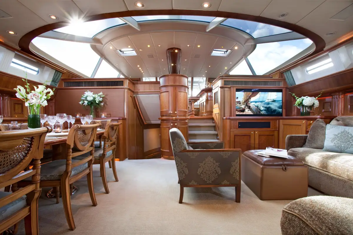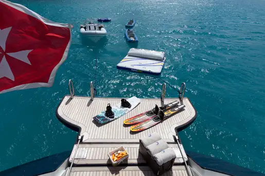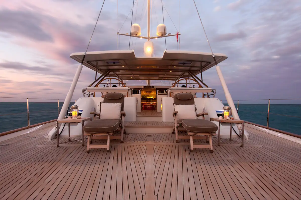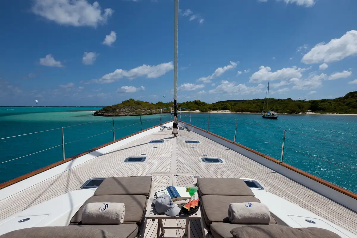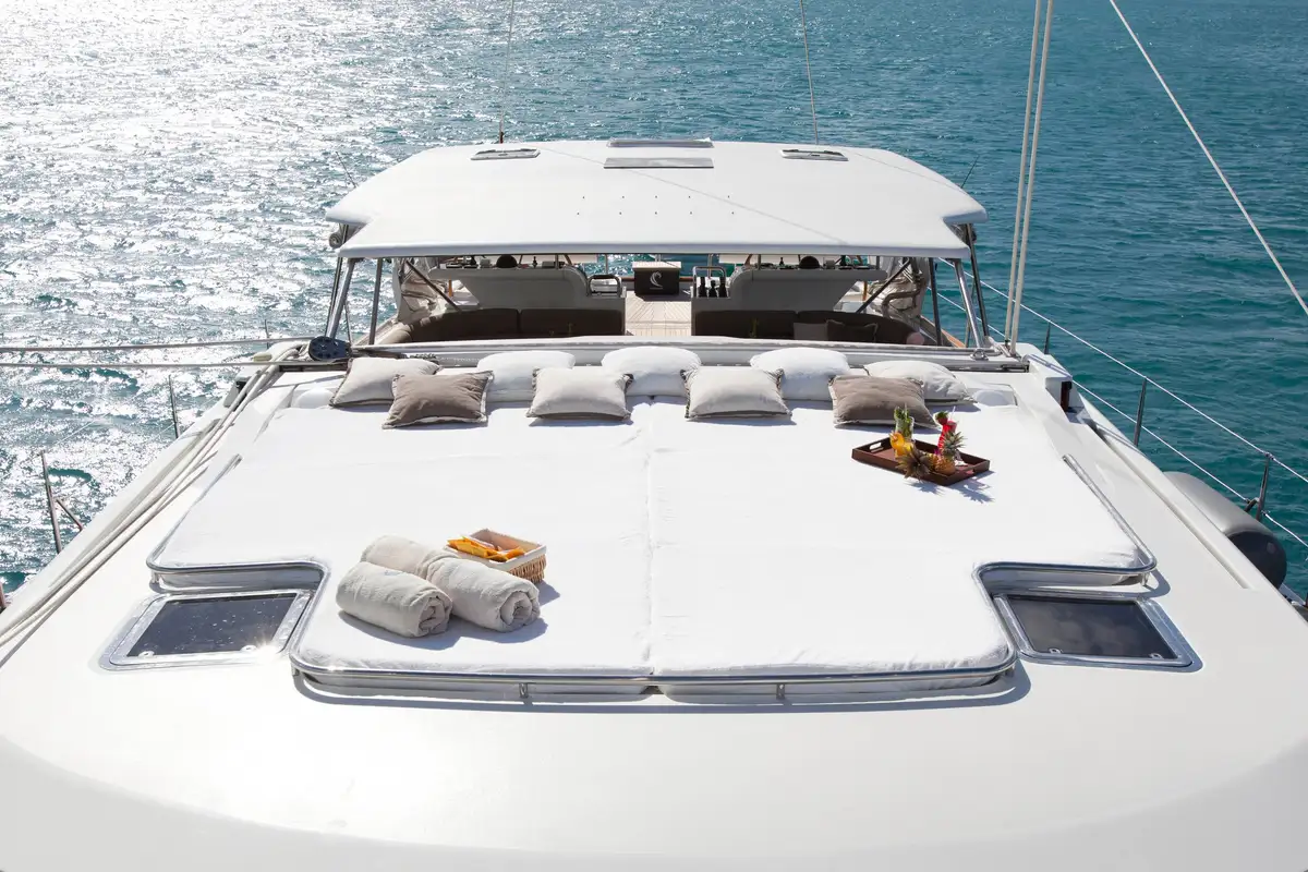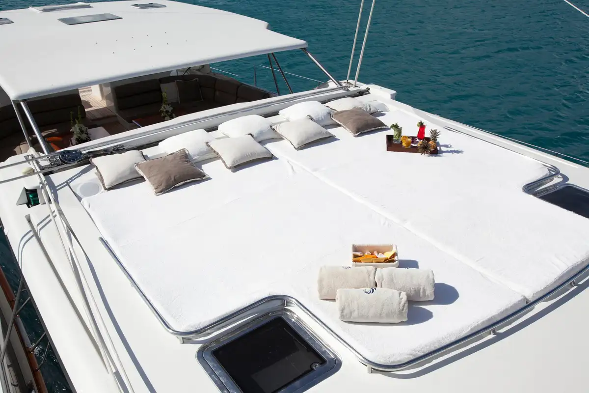 With the anchors lowered, choose between sunloungers on the foredeck or aft of the helms, the vast sun pad on the sun deck or the floating inflatable sun island. The pilothouse is a popular base for afternoon games or the plush and homely lower deck lounge is a perfect sanctuary; curl up with a good book, occasionally gazing up at the mast through the spectacular skylight.