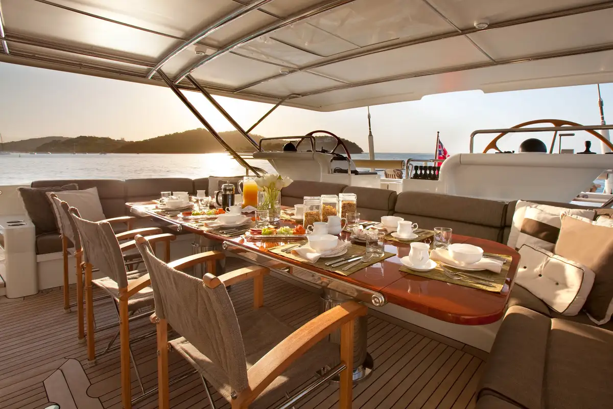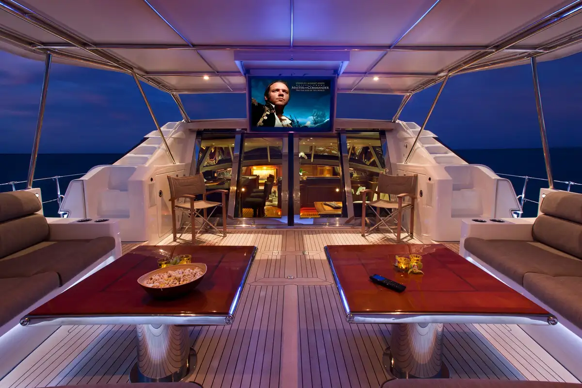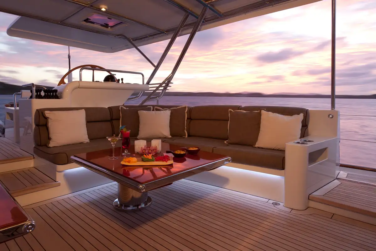 With superb views of the quiet anchorage at sunset, sundowners and canapes are served in the cockpit, while a showreel of the day’s highlights is played on the dropdown TV. The adults make their way down to the lower deck dining area to enjoy the chef’s delicious culinary transformation of the catch of the day, while the children stay in the cockpit to enjoy a relaxed al fresco dinner and movie, chosen from the yacht’s extensive entertainment system.