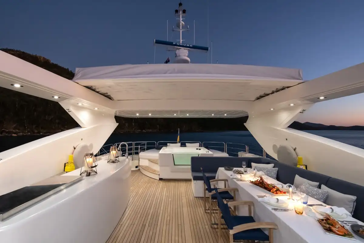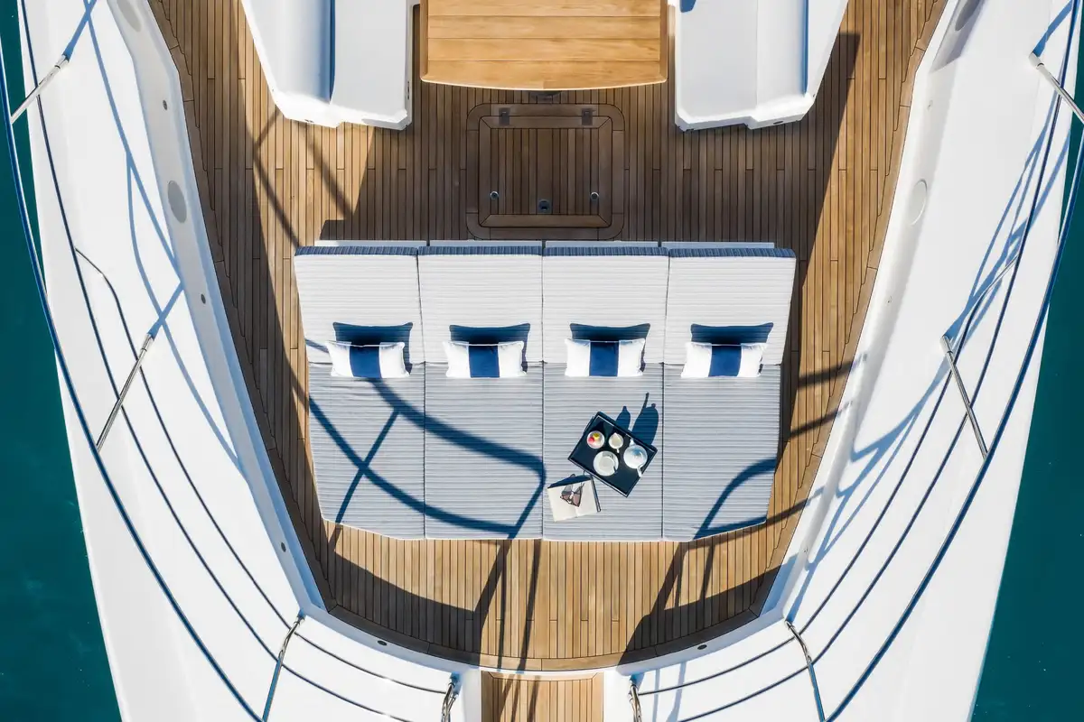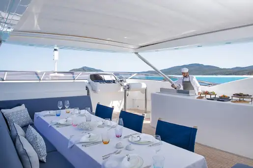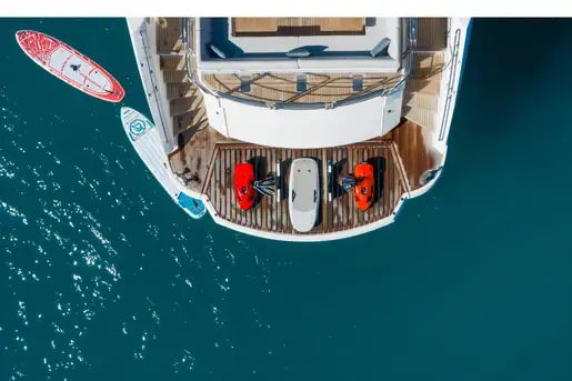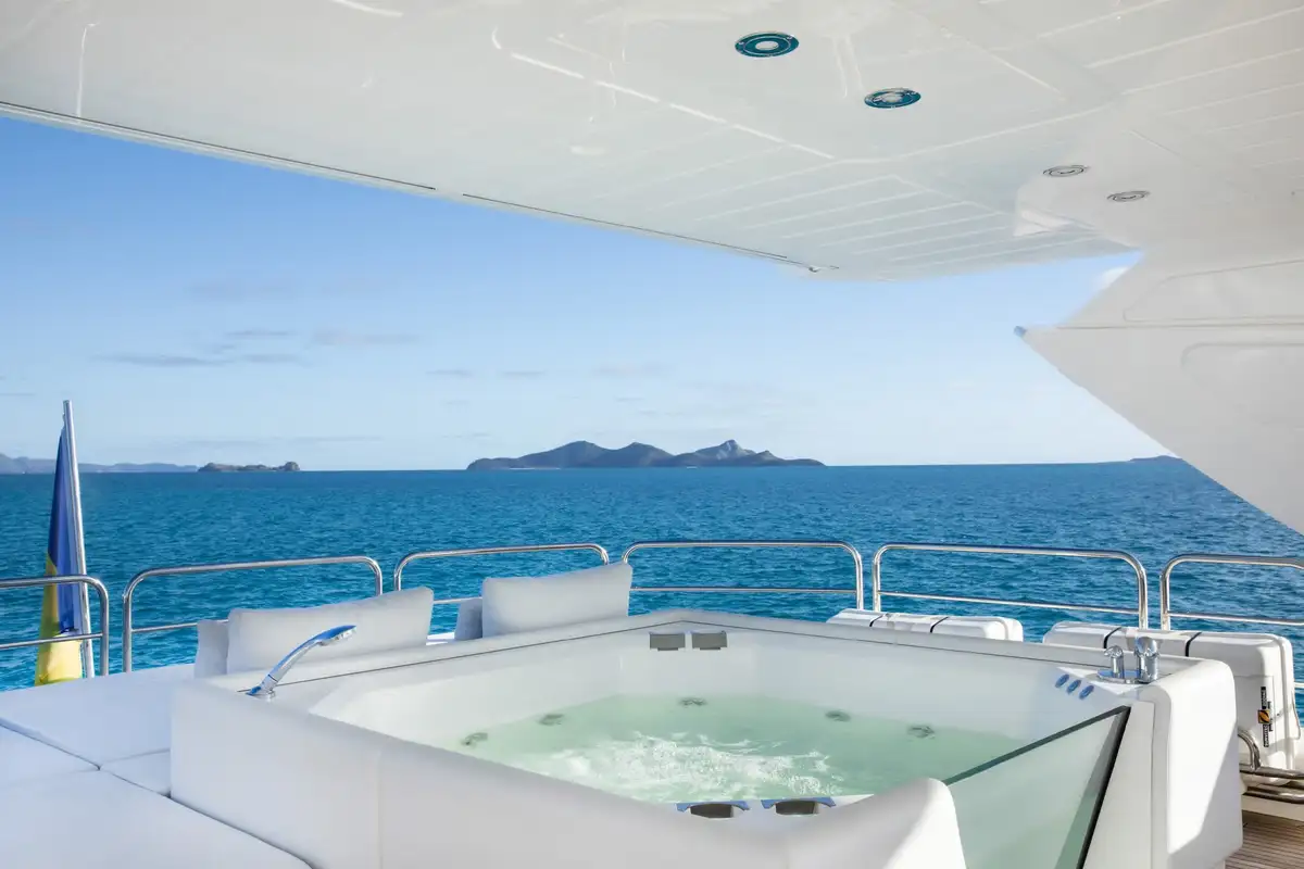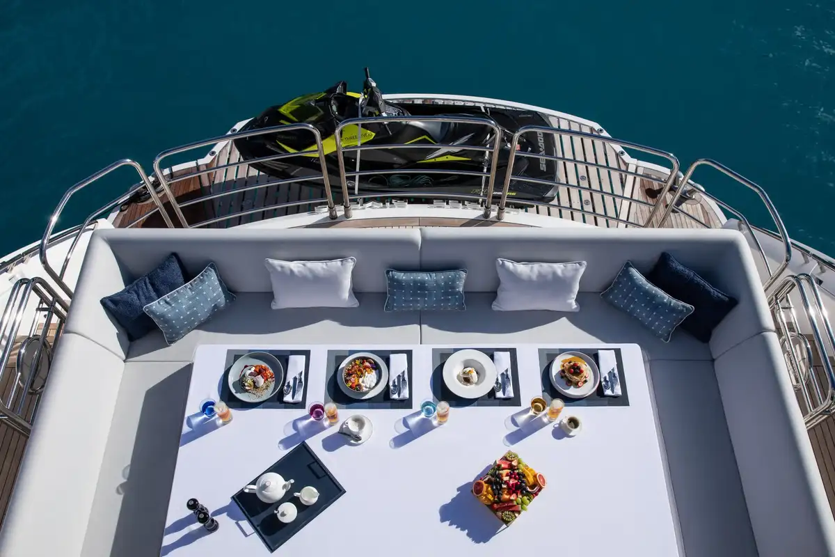 Her exterior decks are the ideal place for relaxation and entertainment. The flybridge provides a lovely al fresco dining area under a shaded cover, whilst toward the aft, there lies a jacuzzi engulfed by comfortable lounging sun pads, perfect for a spot of afternoon sun. Down toward the main deck aft, you'll find another al fresco dining area, while the hydraulic swimming platform just below provides easy access to the crystal waters and watersports.