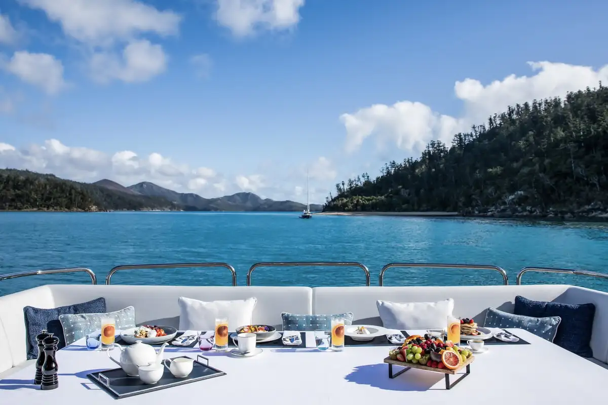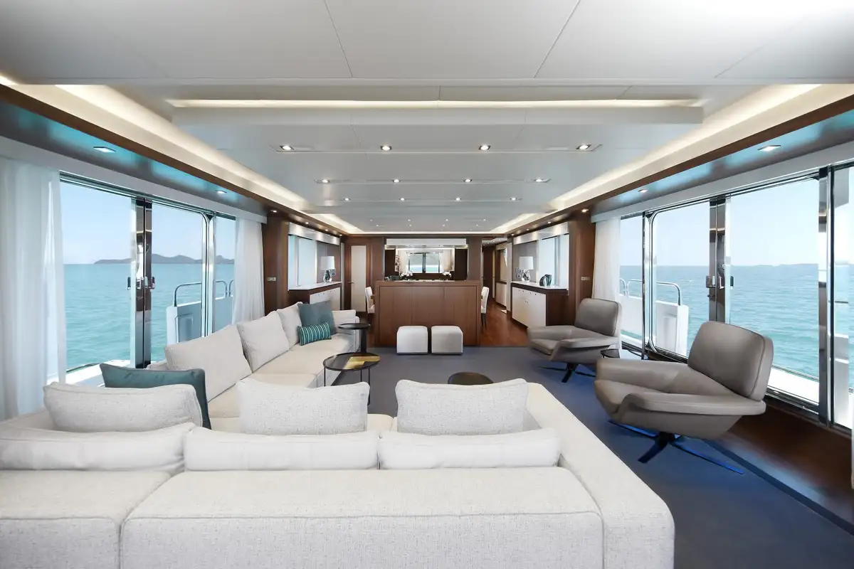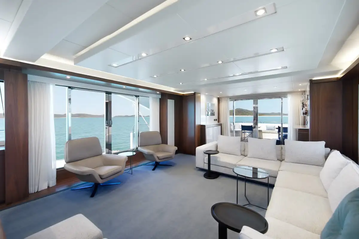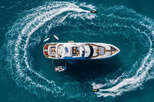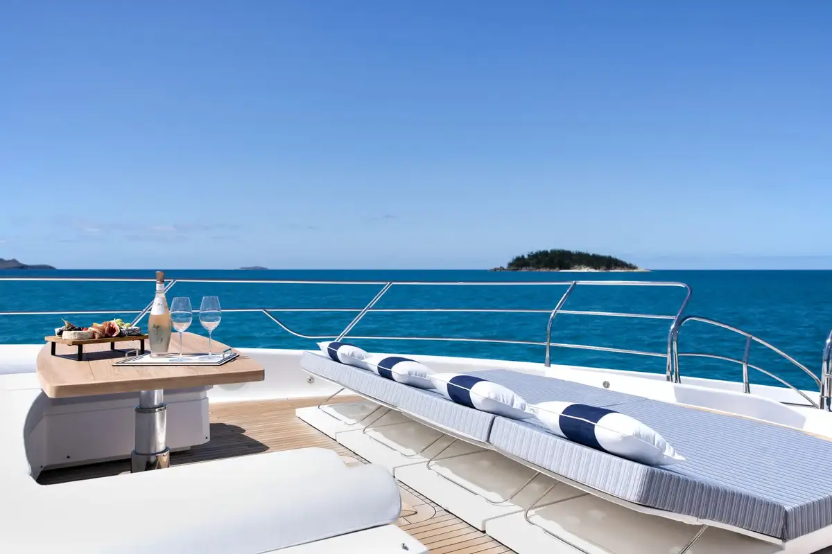 Her exterior decks are the ideal place for relaxation and entertainment. The flybridge provides a lovely al fresco dining area under a shaded cover, whilst toward the aft, there lies a jacuzzi engulfed by comfortable lounging sun pads, perfect for a spot of afternoon sun. Down toward the main deck aft, you'll find another al fresco dining area, while the hydraulic swimming platform just below provides easy access to the crystal waters and watersports.