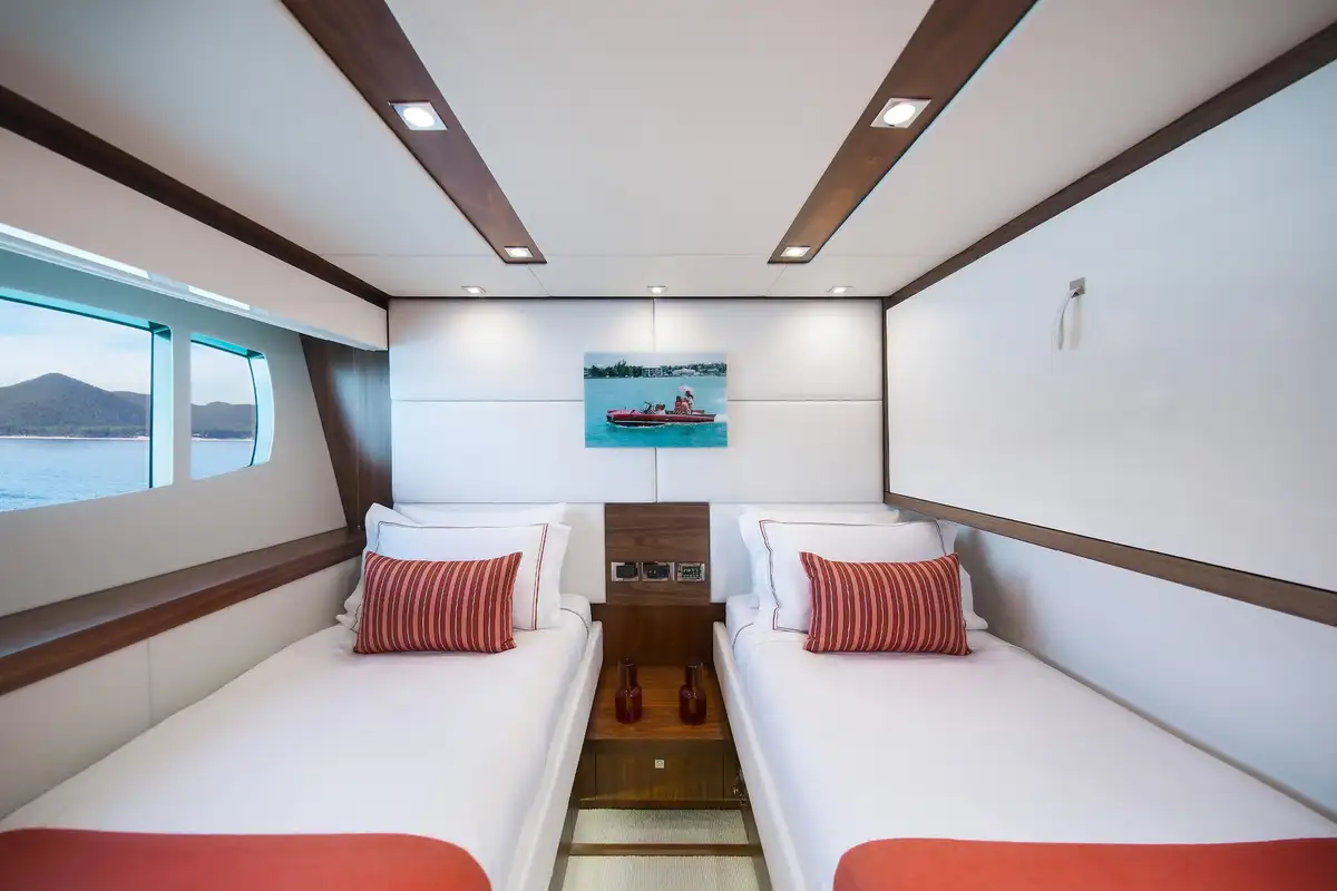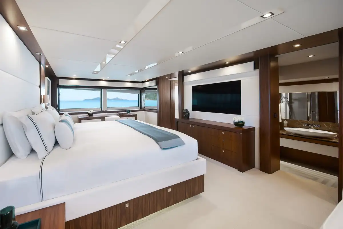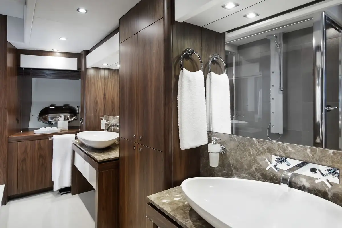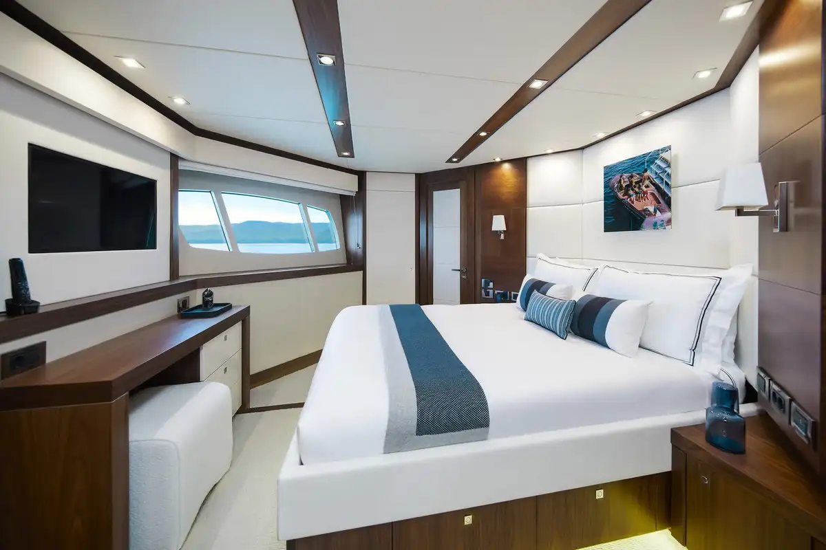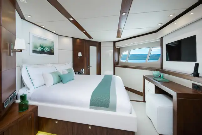 GEORGE P accommodates up to 12 guests in five state of the art cabins. The full beam master suite on main deck features a working desk, a comfortable seating area and two private dressing rooms. On the lower deck, there are two VIP cabins and two twin cabins that can be converted to double, with a pullman bed in each. All of the cabins are equipped with en suite facilities.